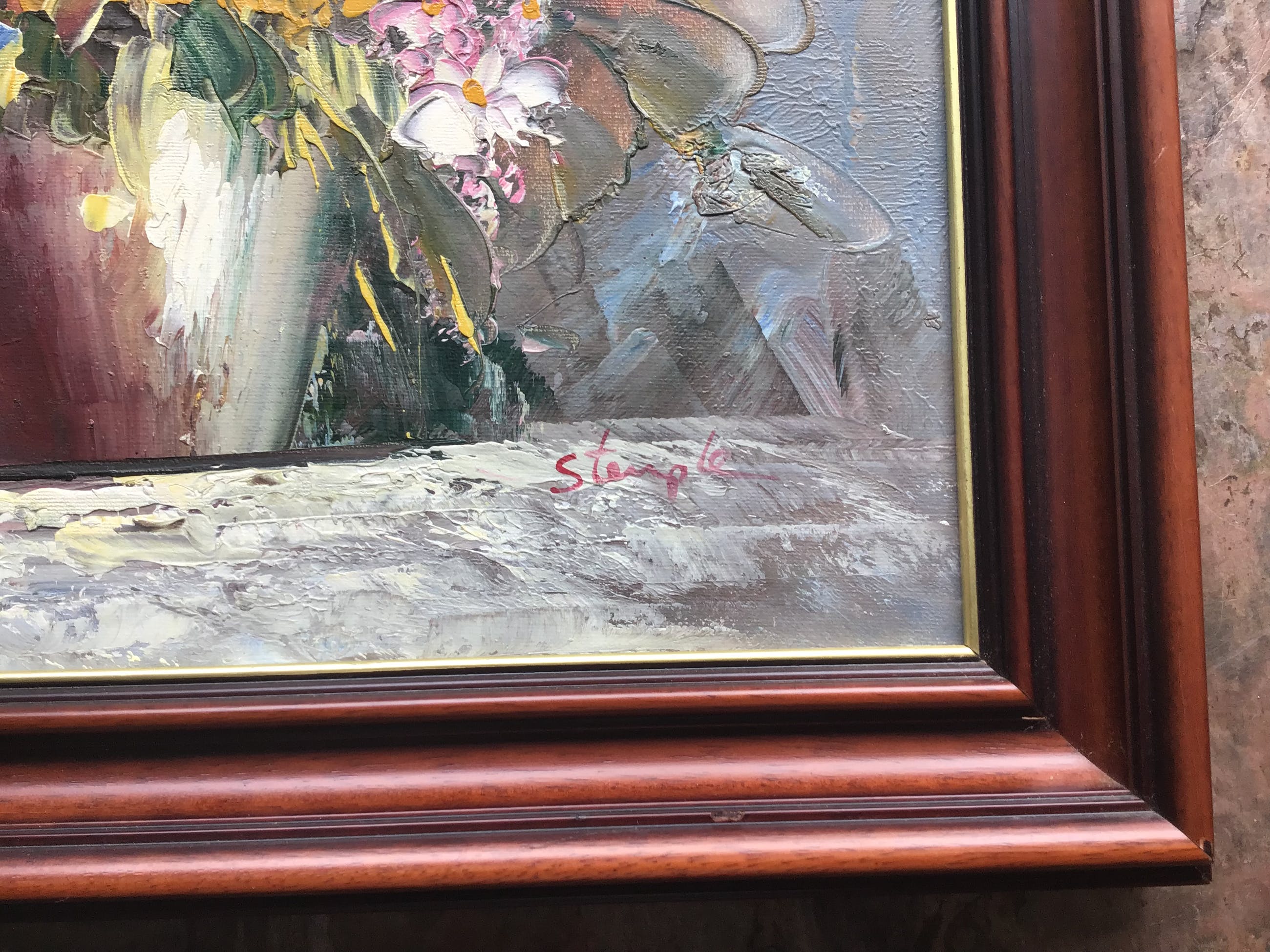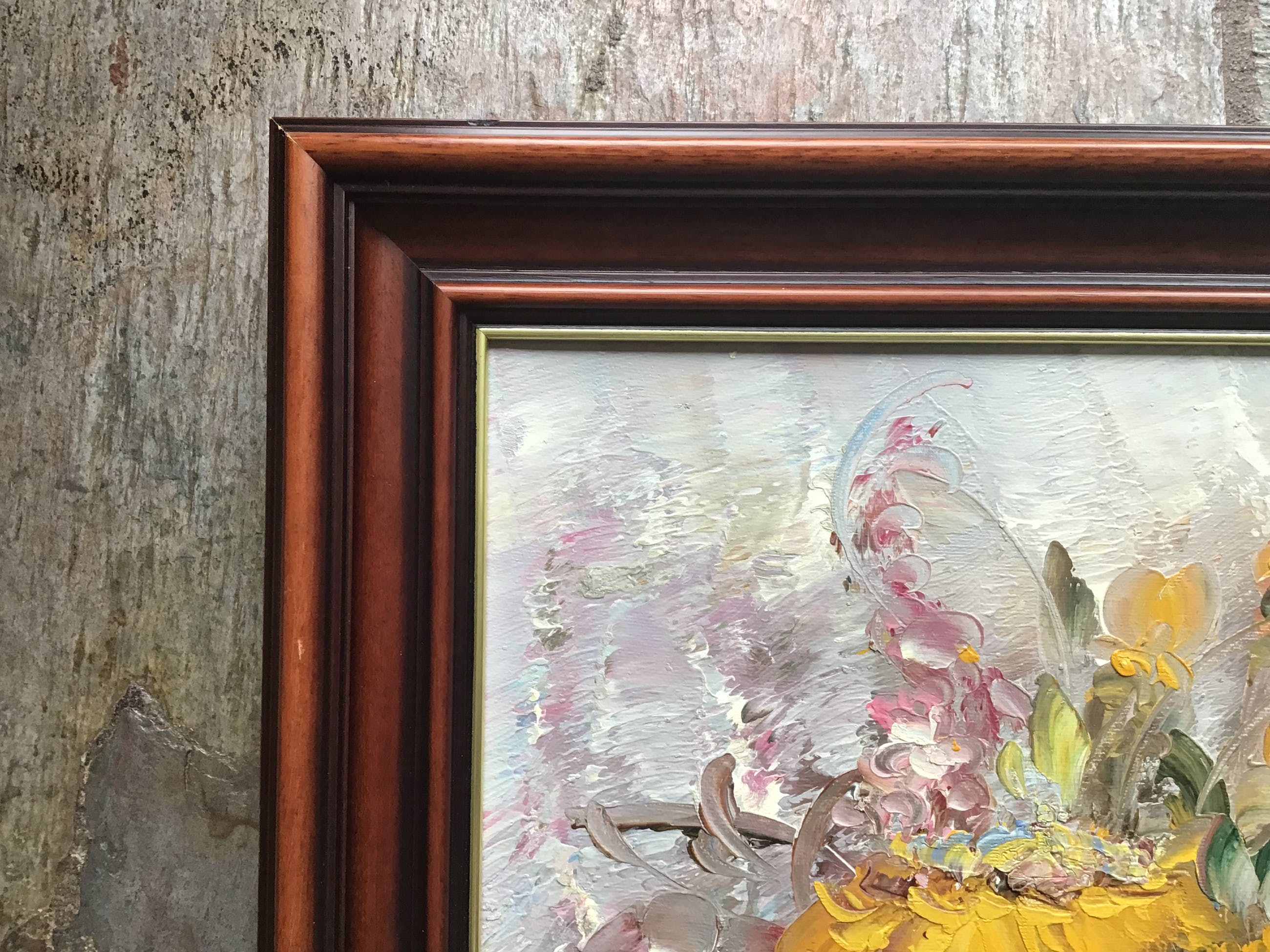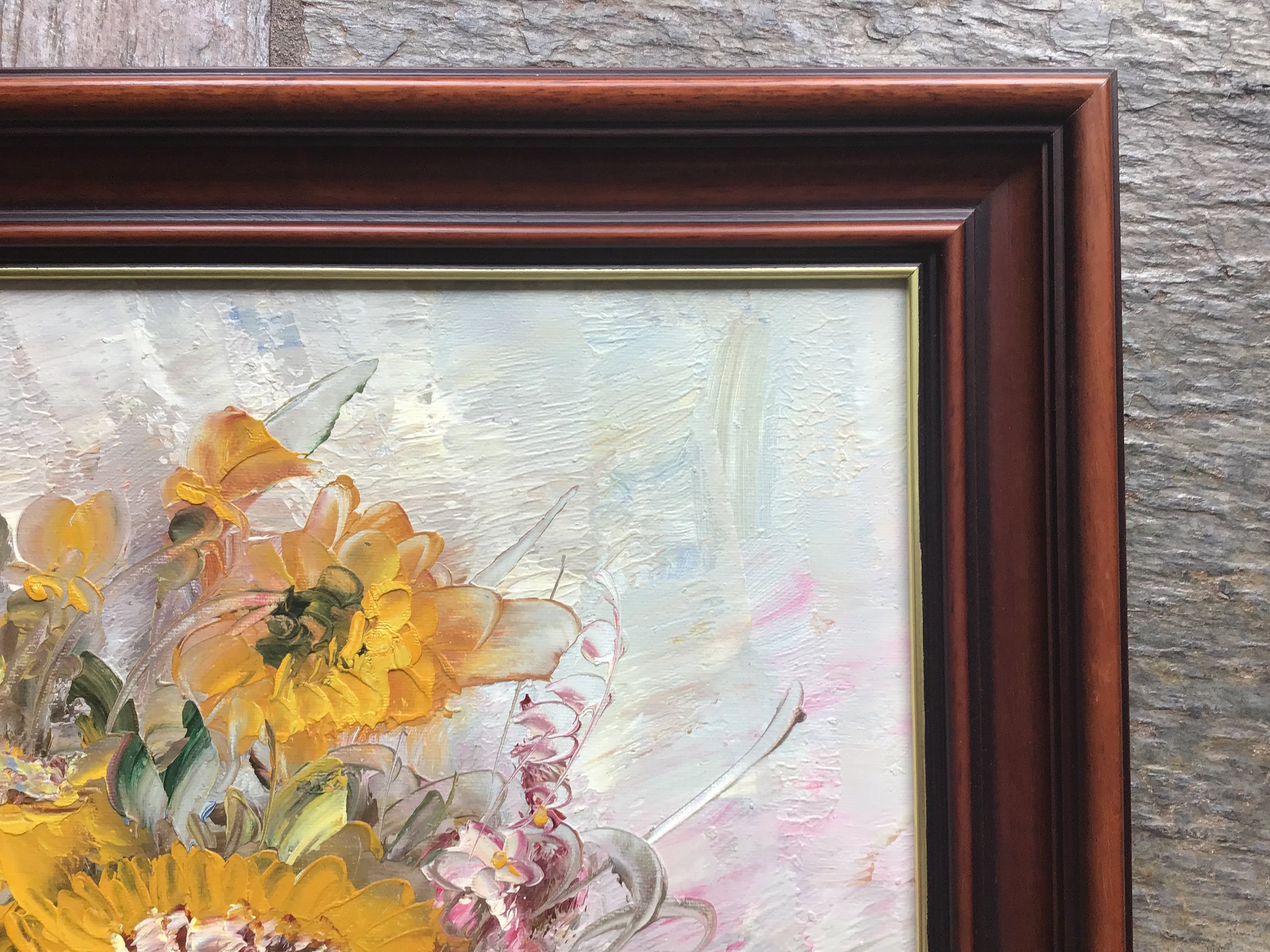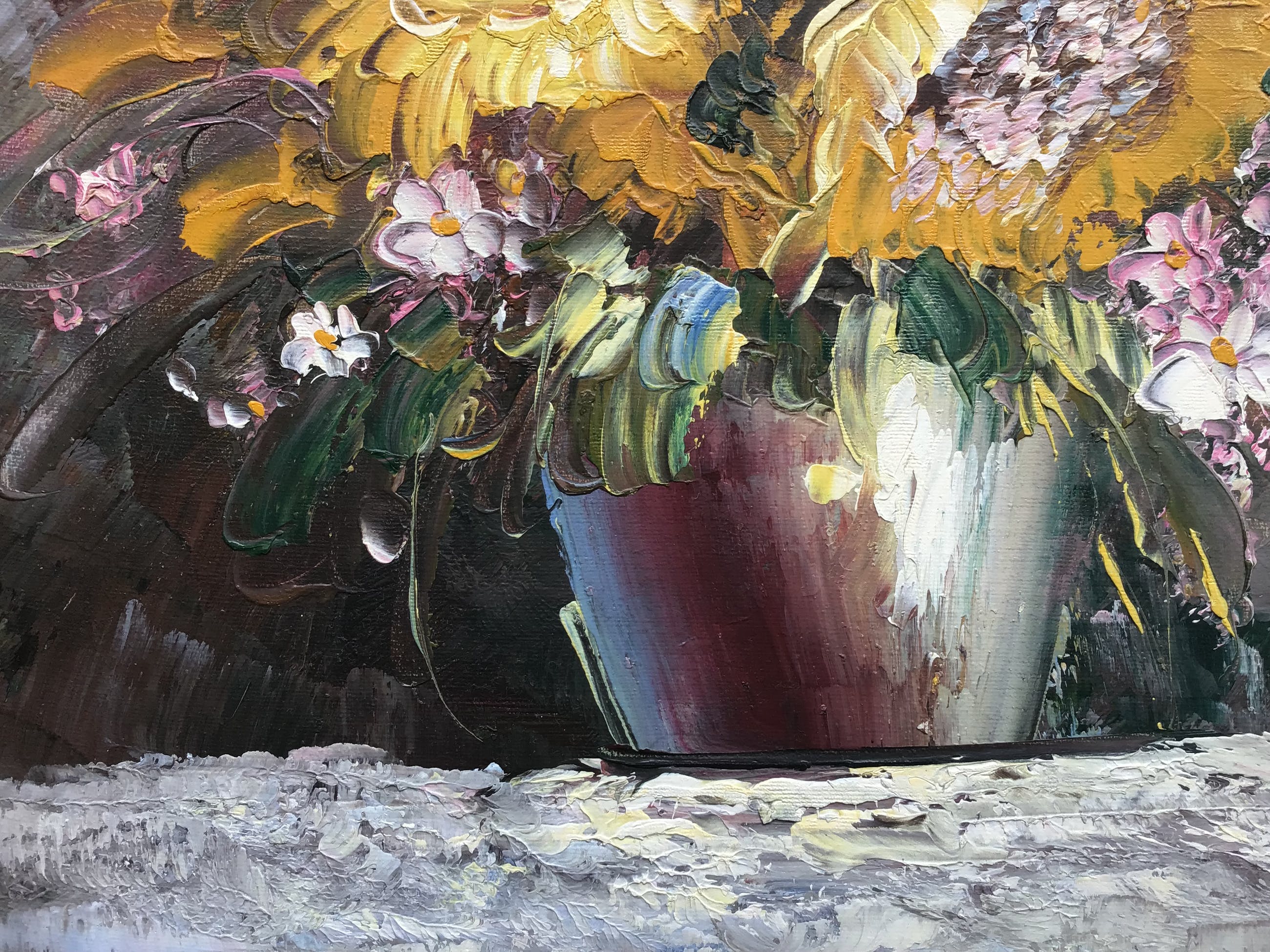 Puntgaaf stilleven van gemengd bouqet met o.a. zonnebloemen. De signering kan ik niet ontcijferen.