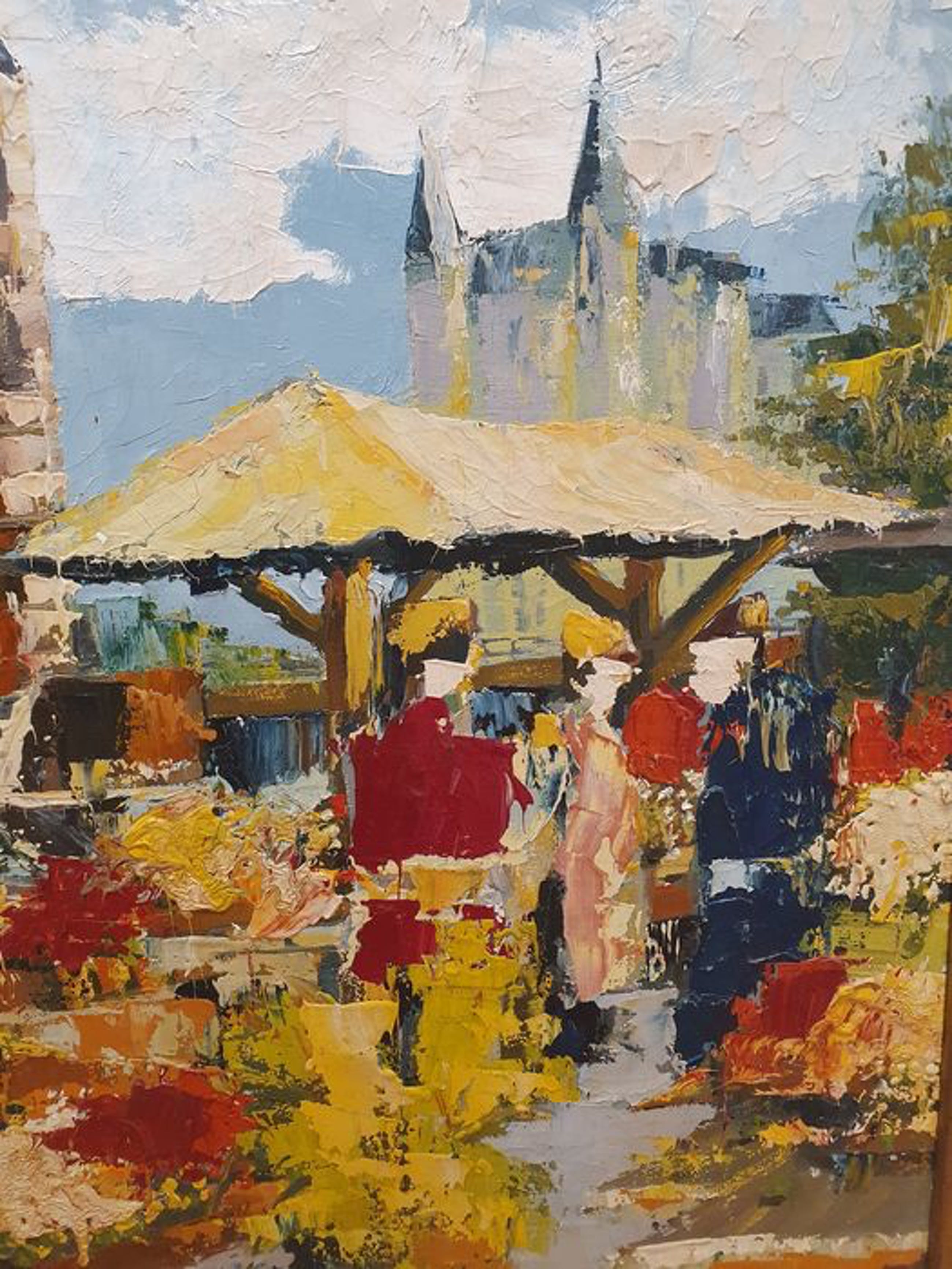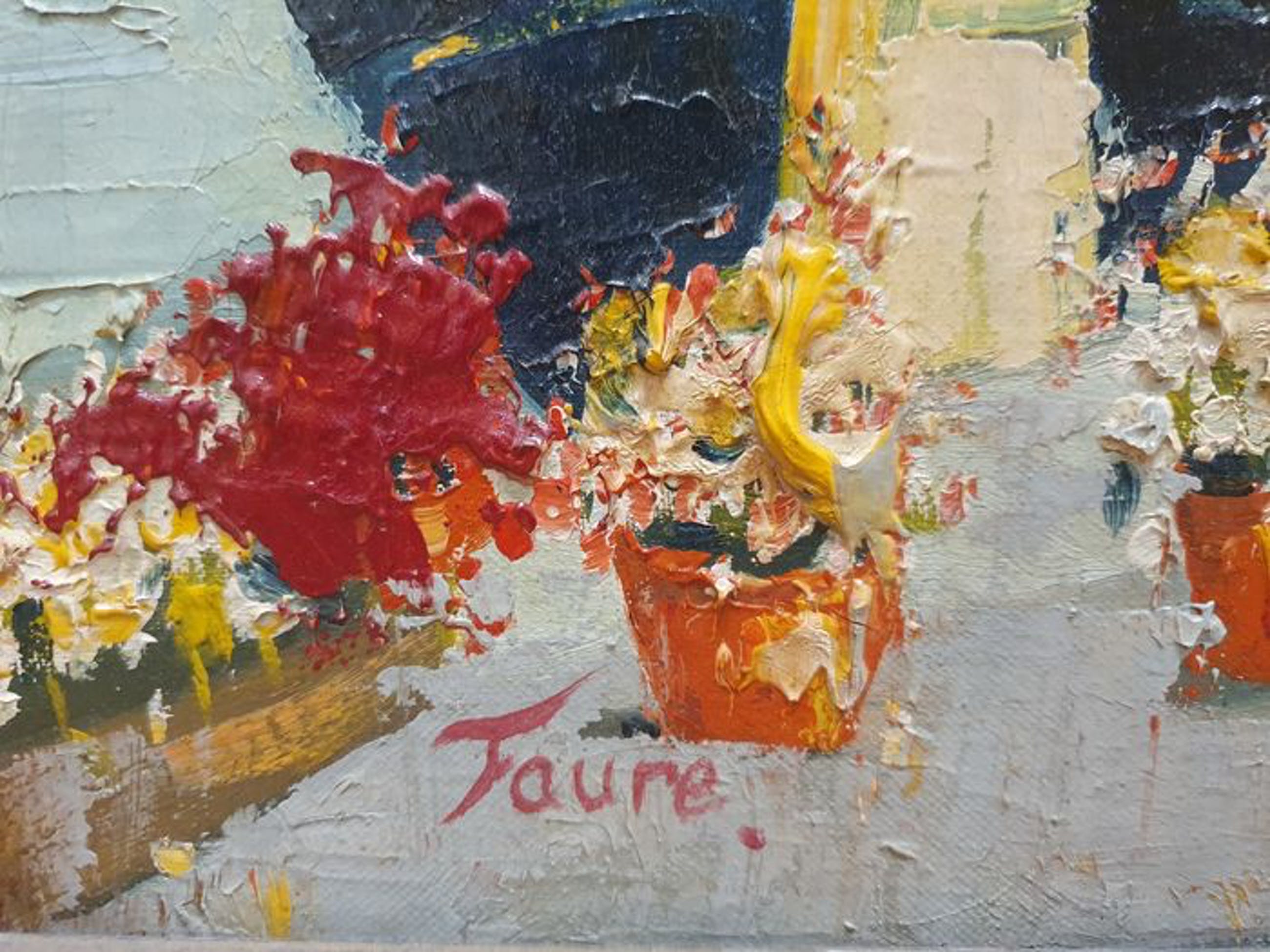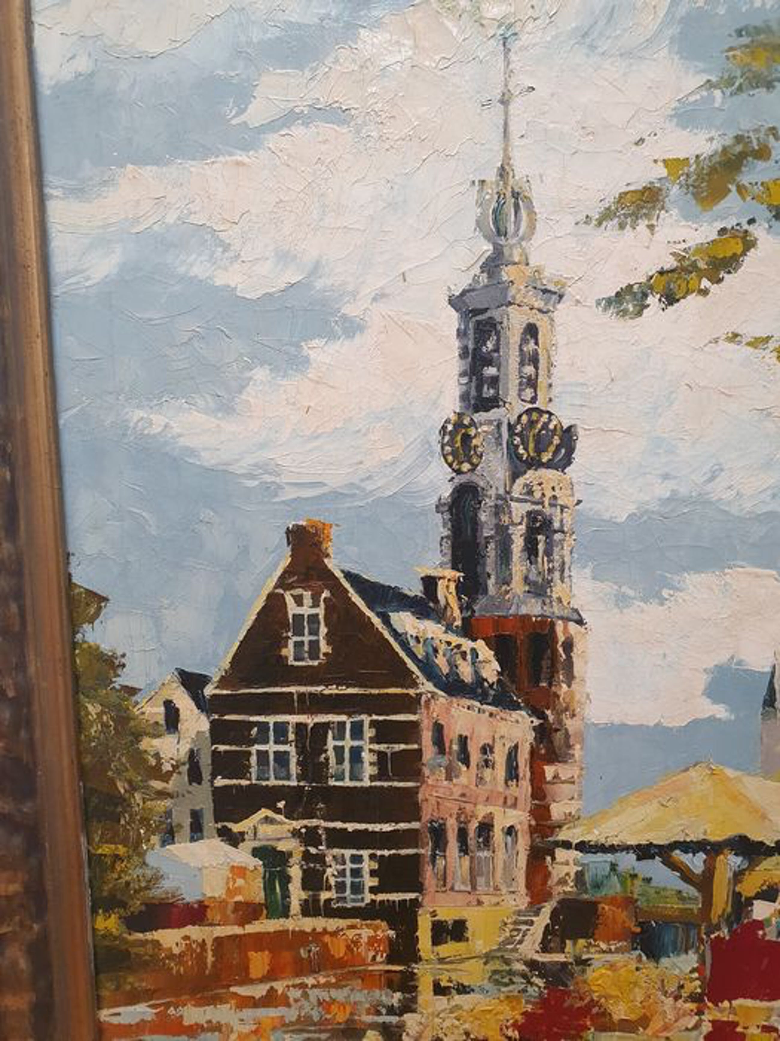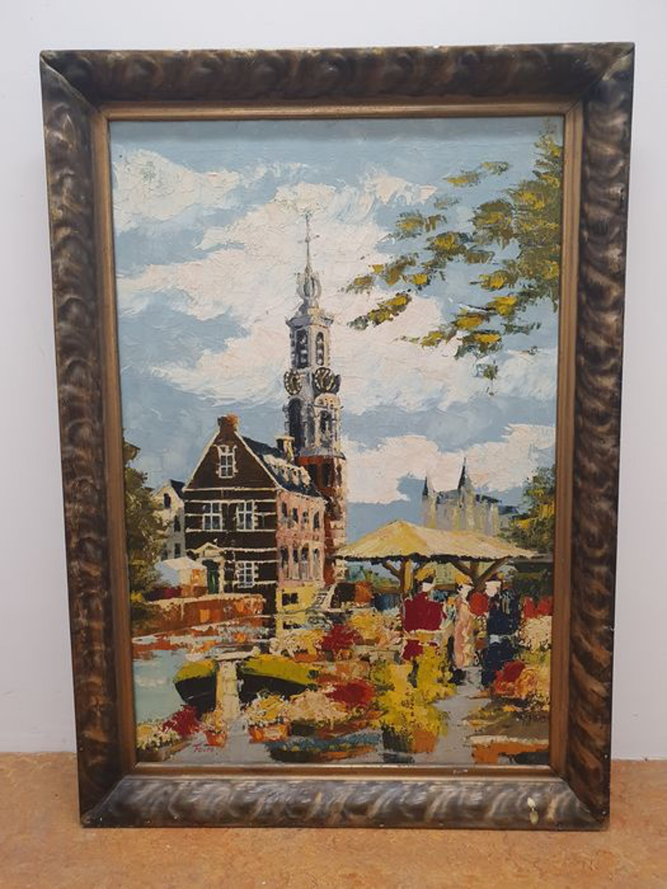 Schilder: Faure Voorstelling: Bloemenmarkt Amsterdam met zicht op de Munttoren Ingelijst Afmeting doek: 60 x 90 cm Afmeting incl lijst: 73 x 103 cm