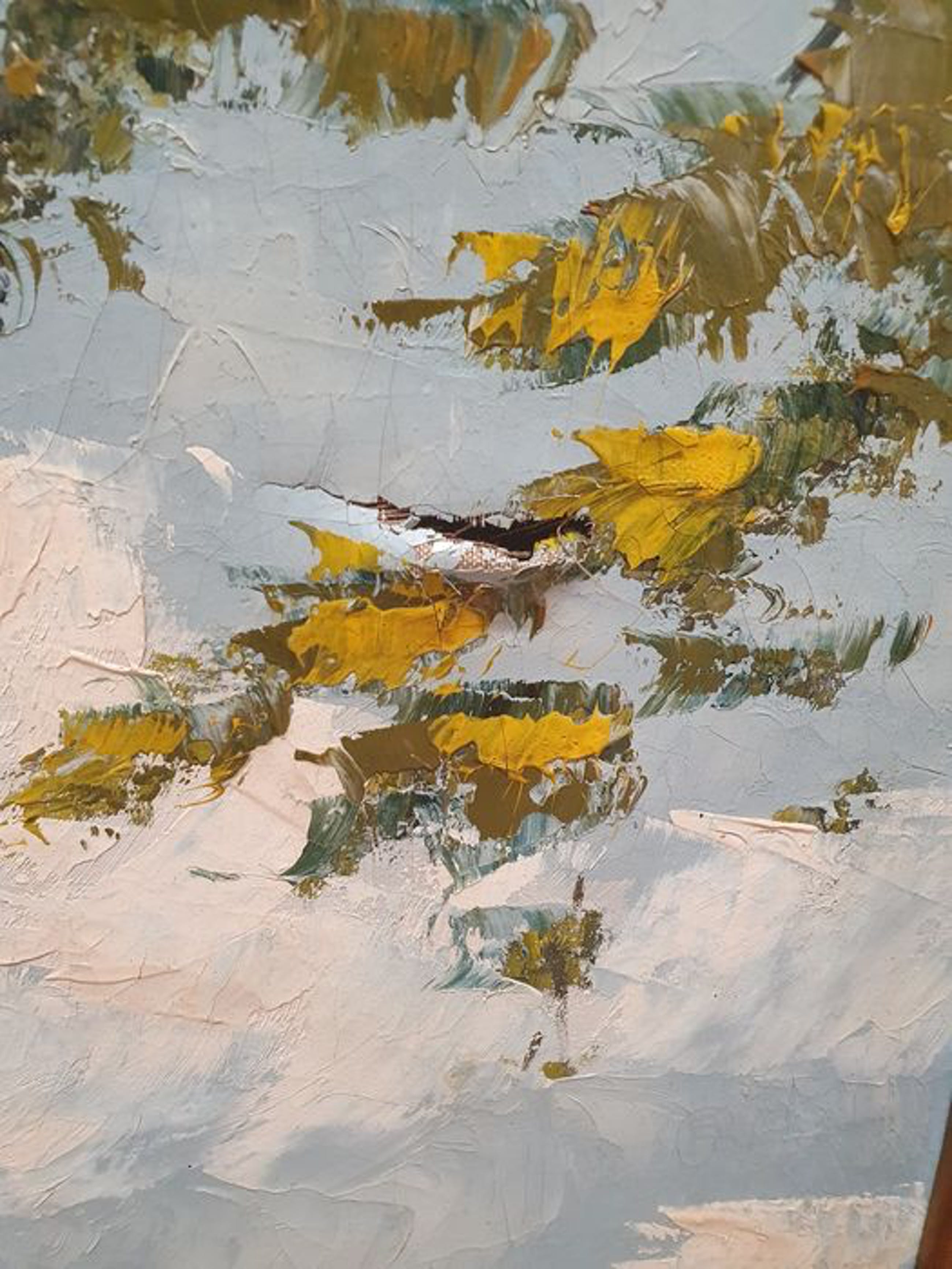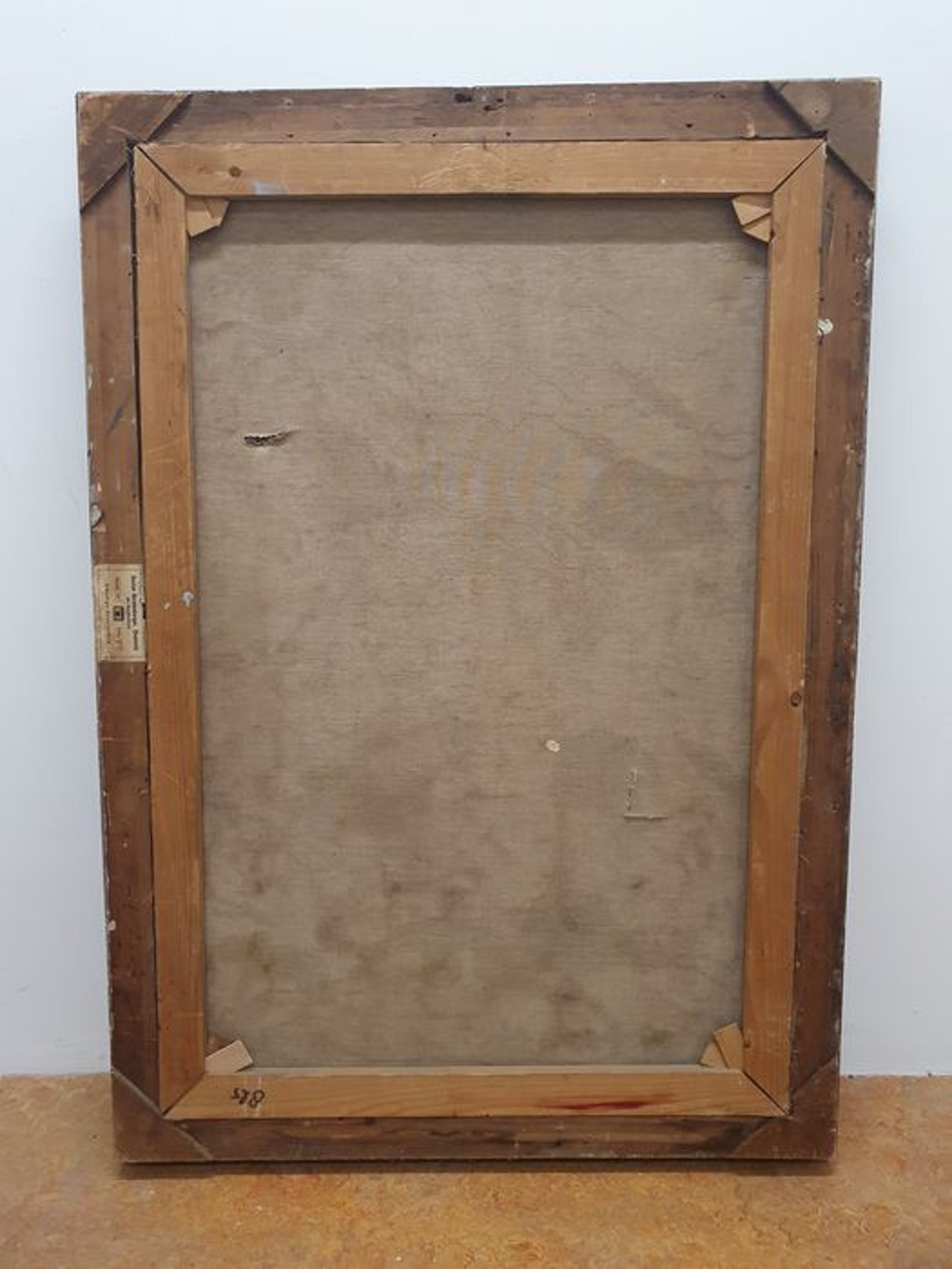 Grote opvallende schilderij. Trekt de aandacht in een ruimte. Kleine scheur in doek. Valt niet op maar behoeft misschien restauratie. Gesigneerd linksonder.