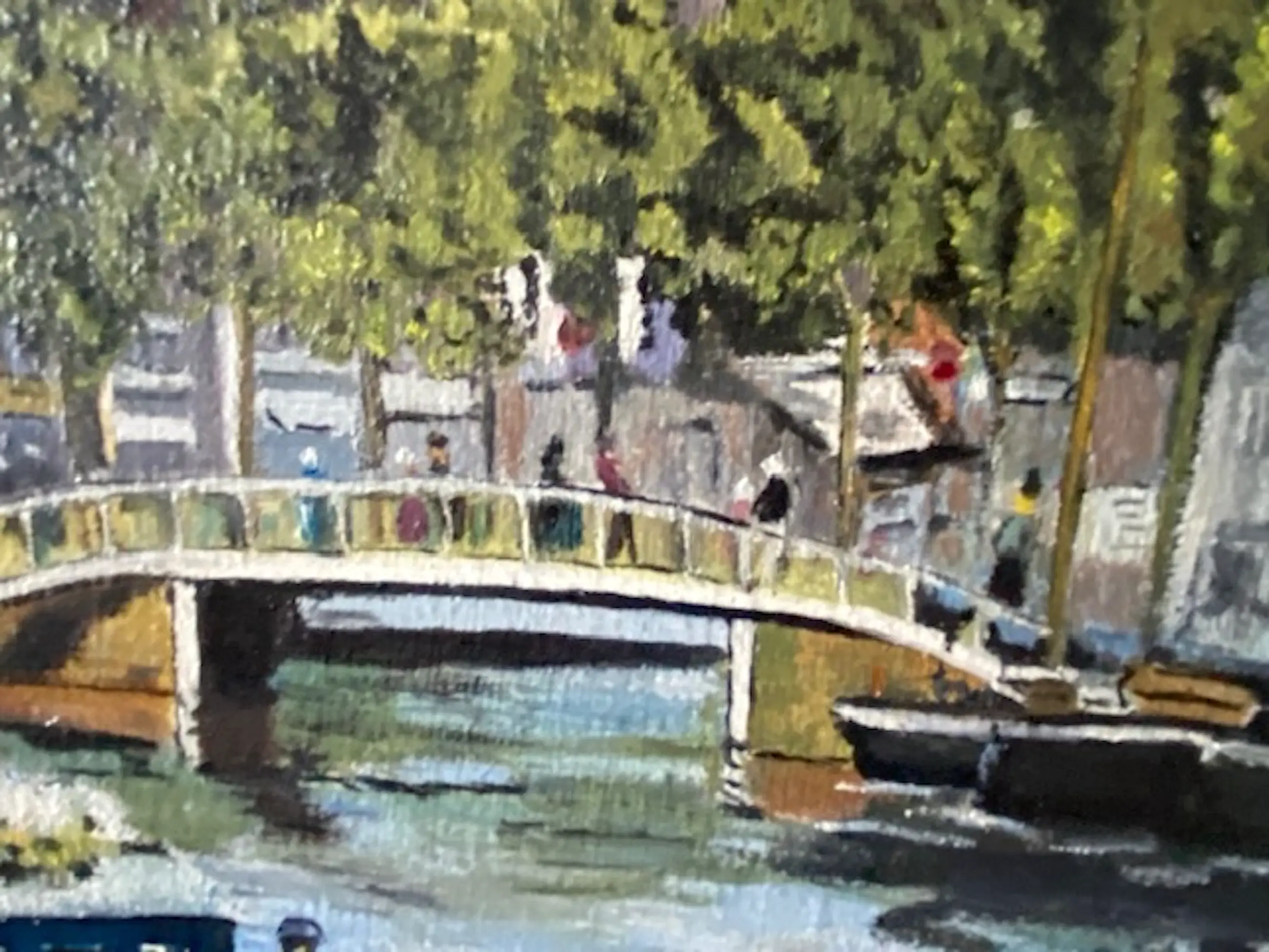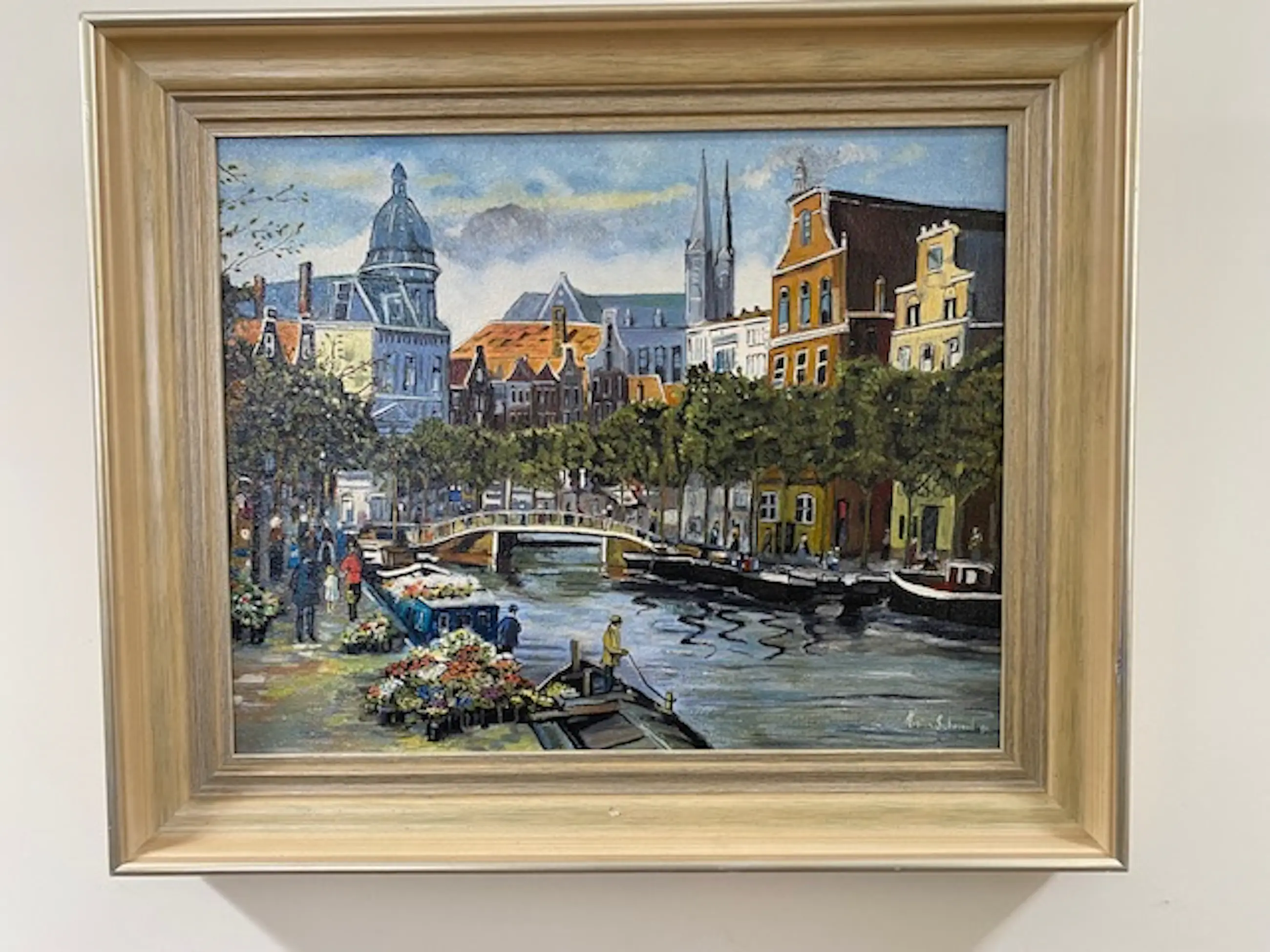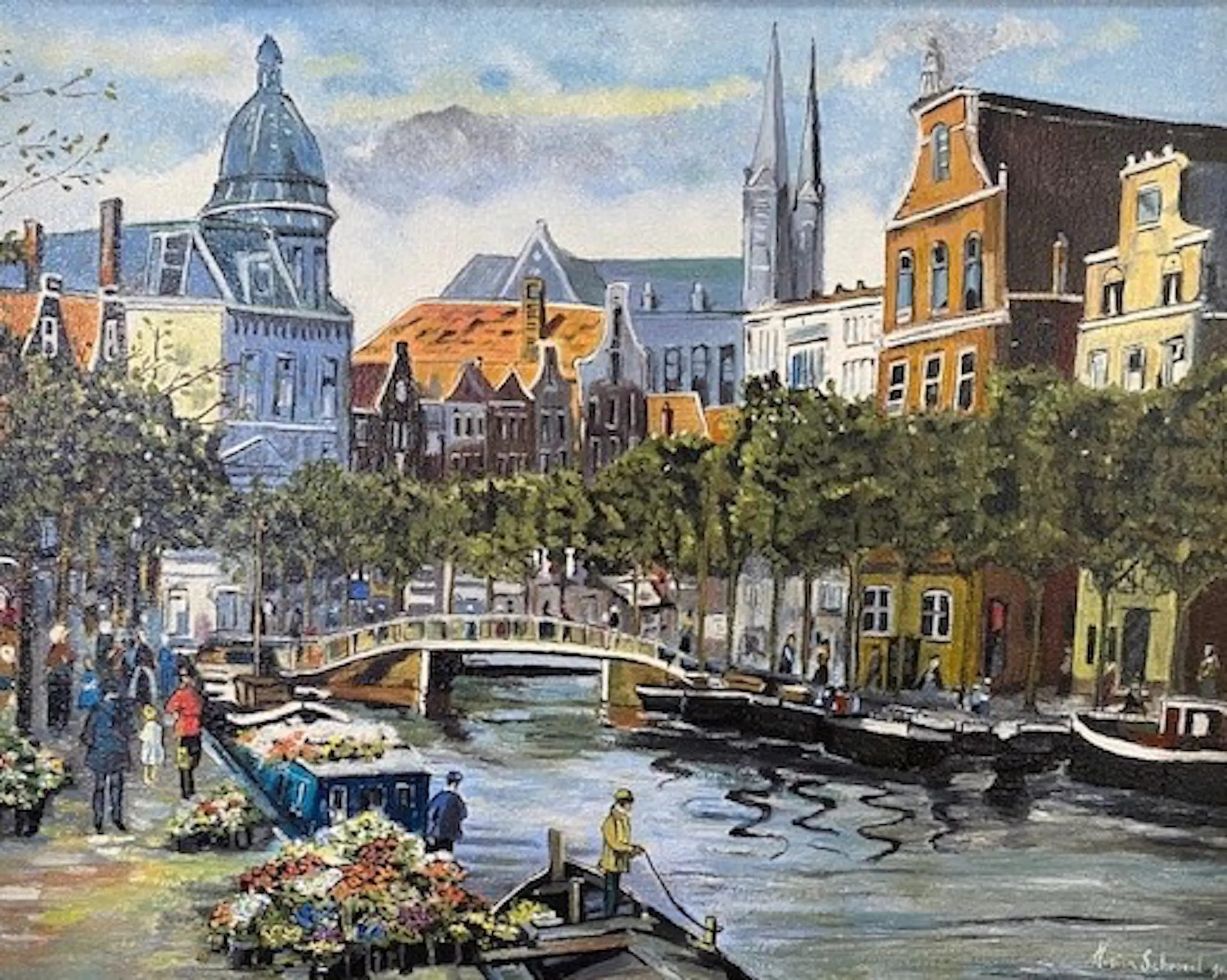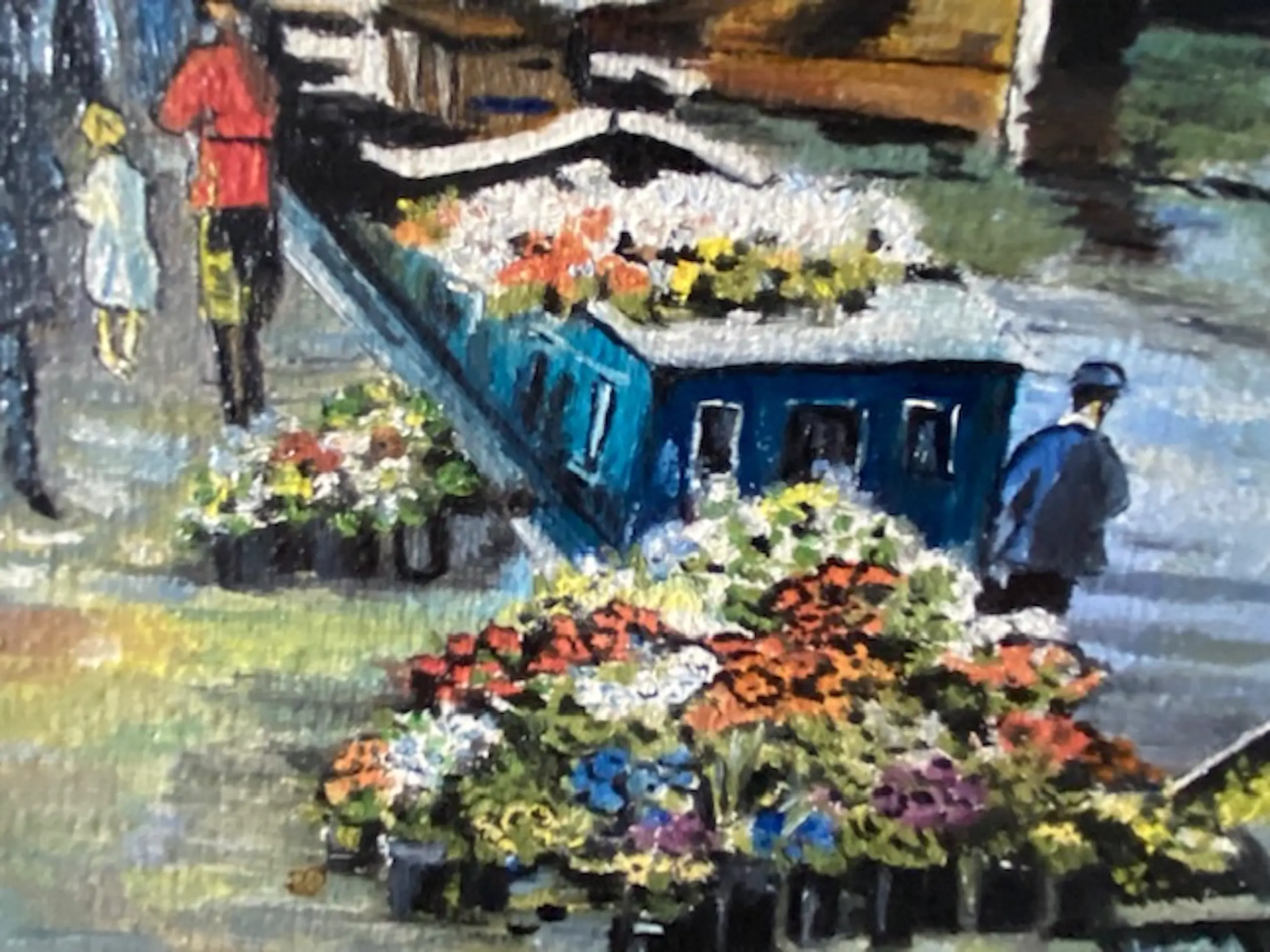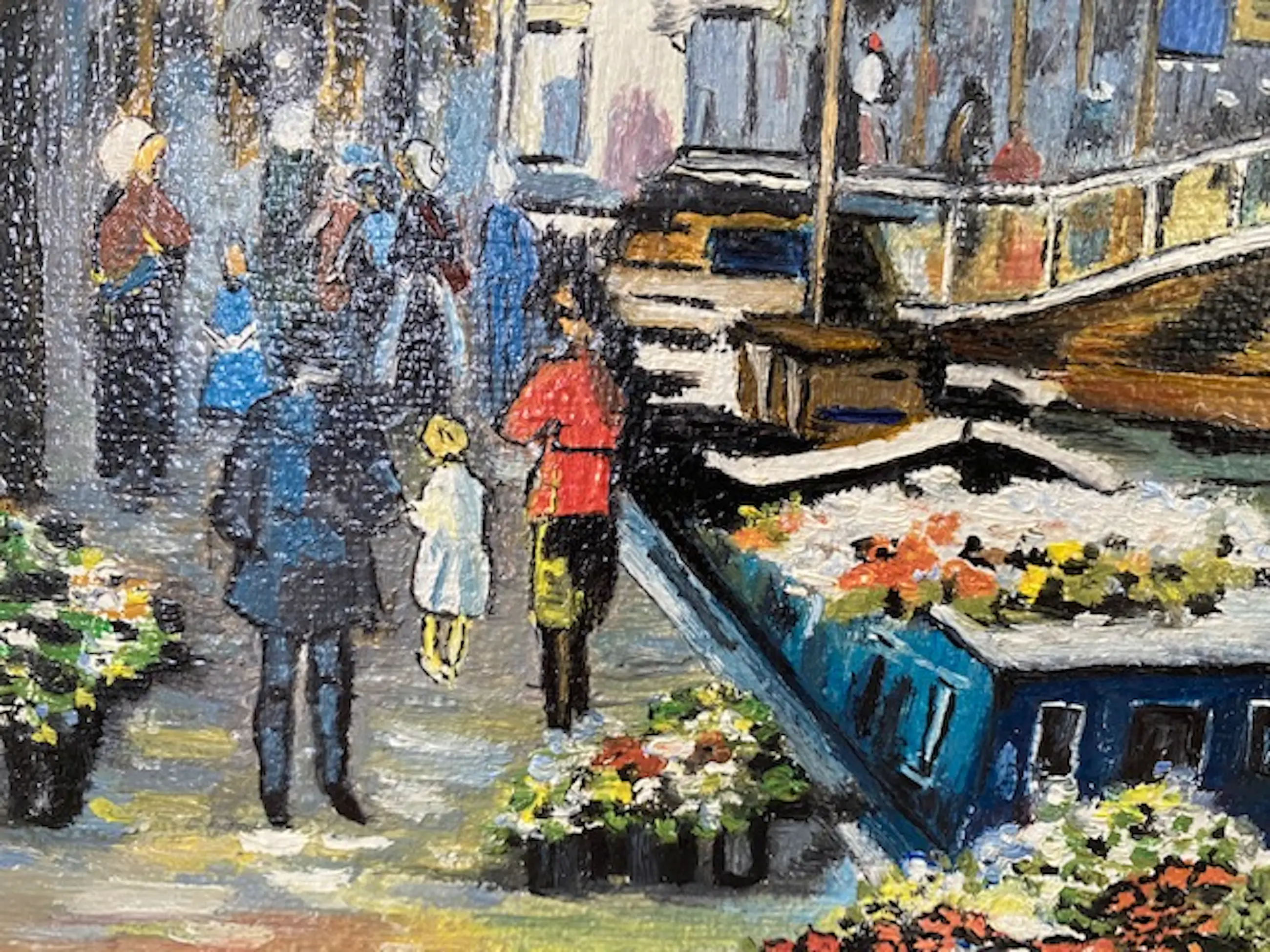 Dit schilderij is gemaakt aan een gracht in een voor mij onbekende stad. Het is gesigneerd Marion (Marian?) Schoorel 1991 (1990) en verbeeldt de verkoop van bloemen.