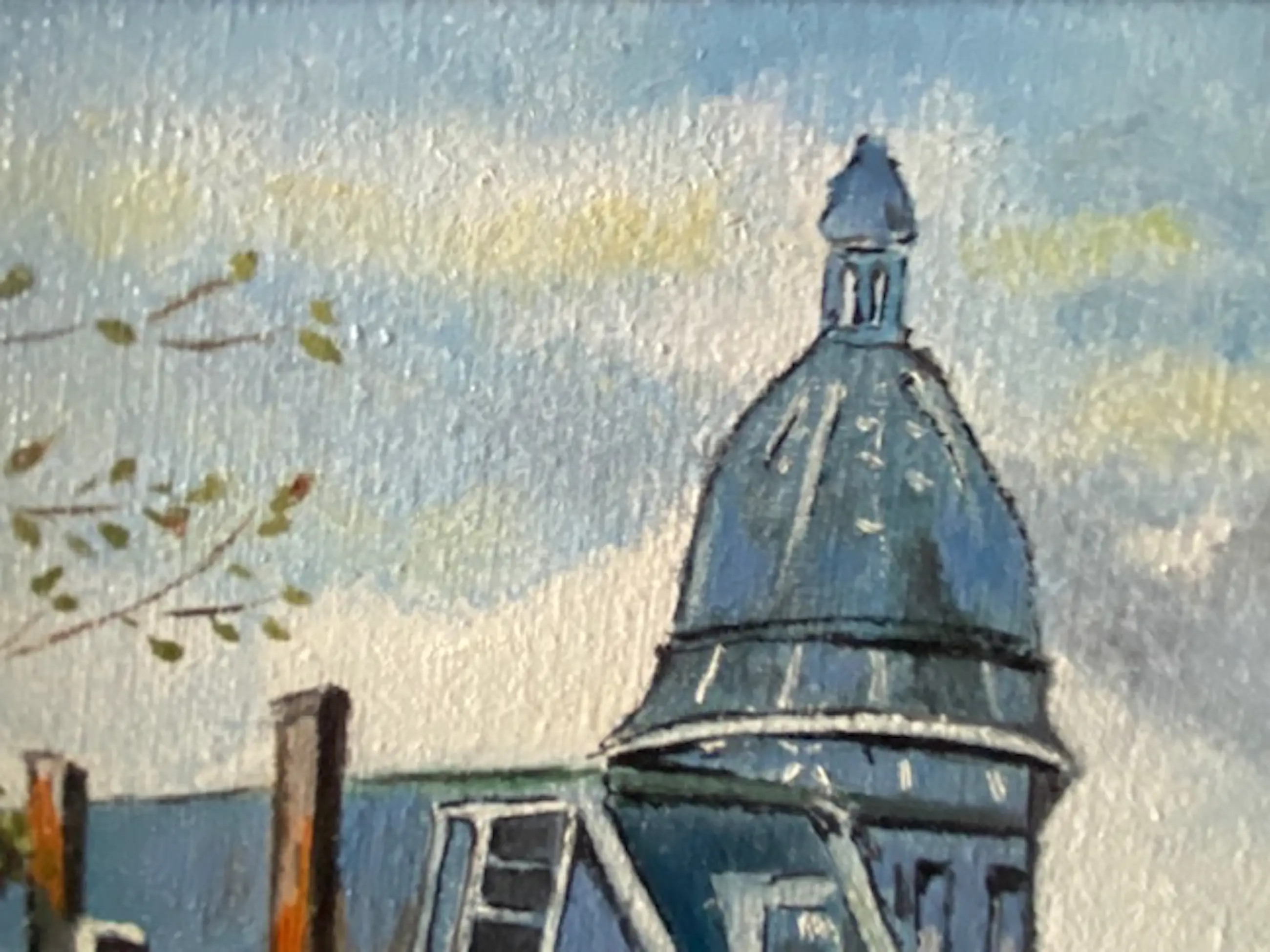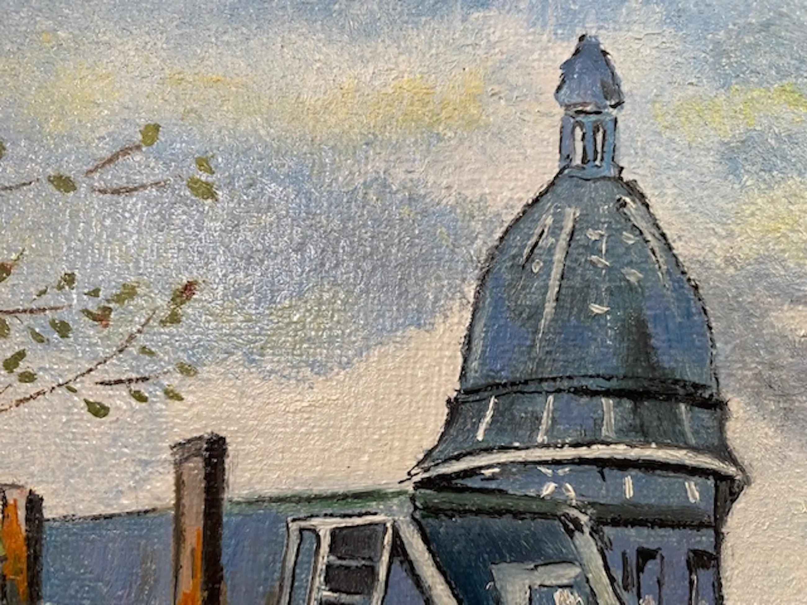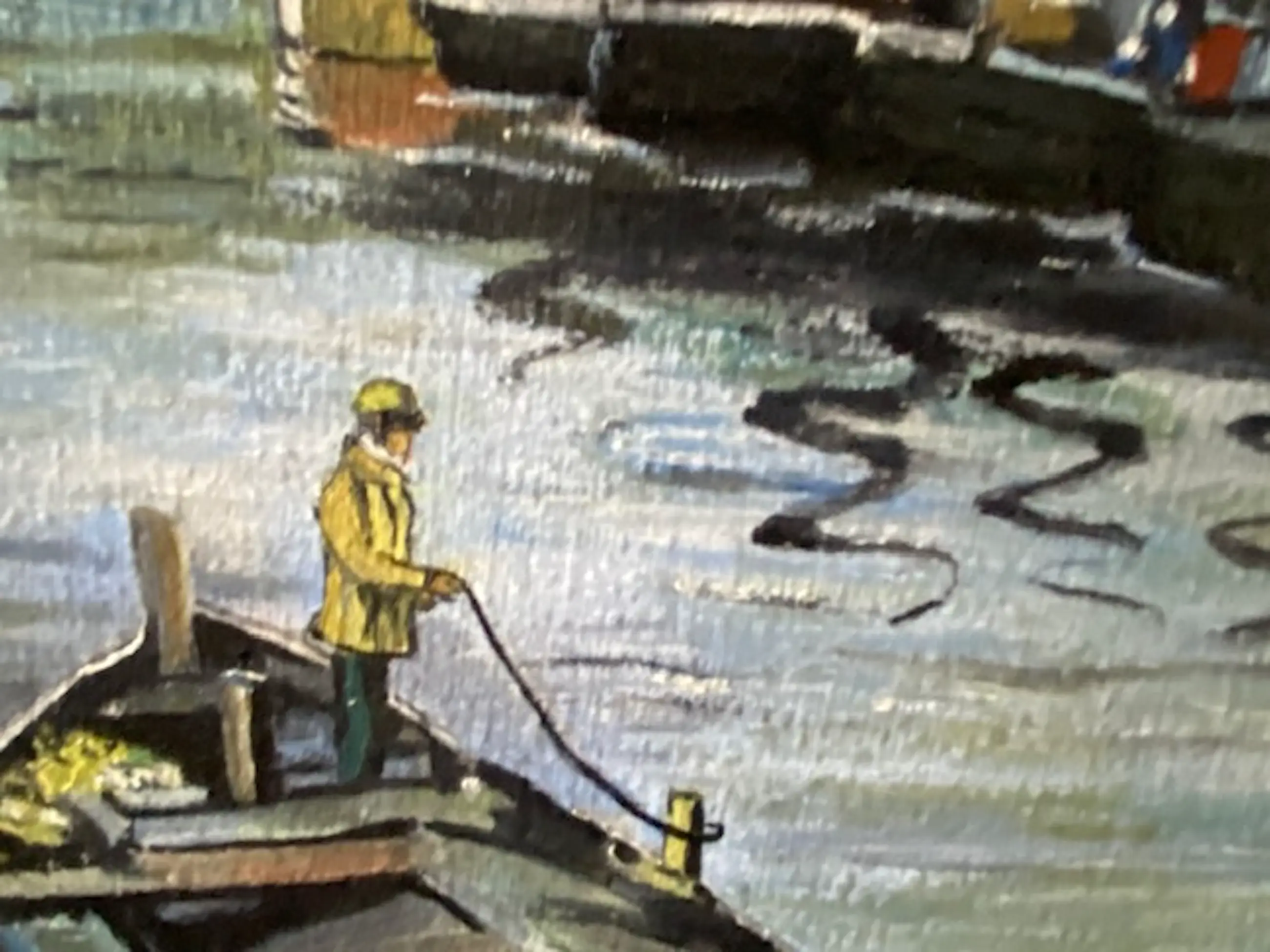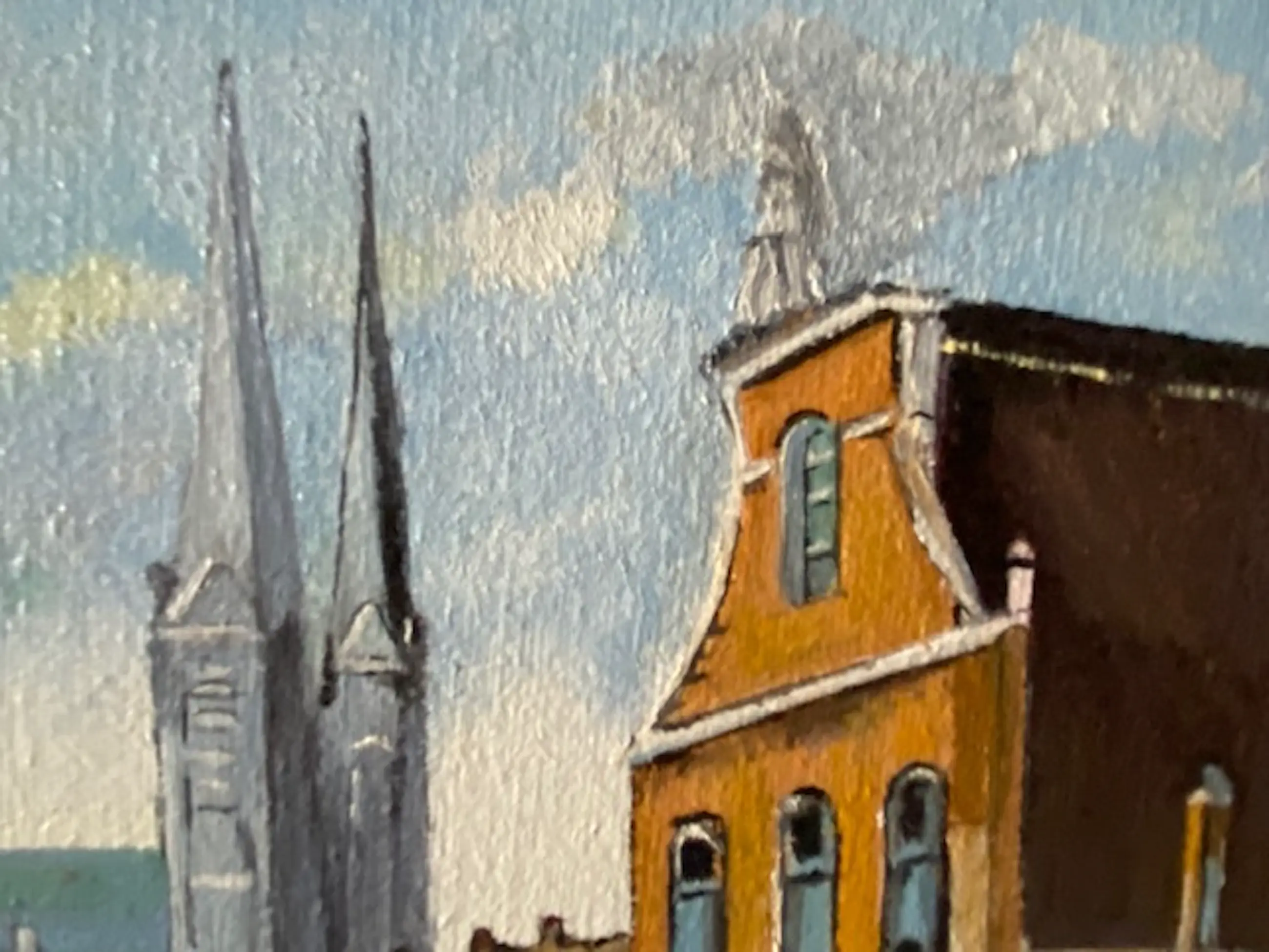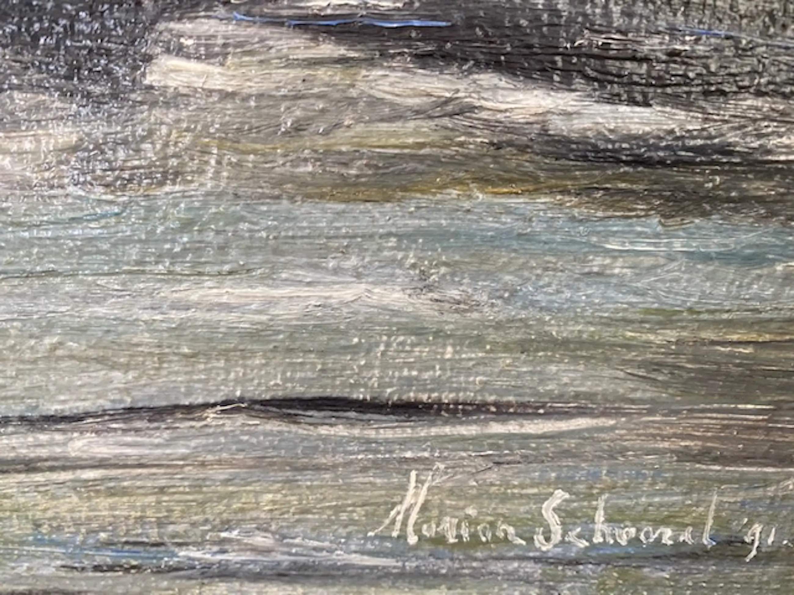 Dit schilderij is gemaakt aan een gracht in een voor mij onbekende stad. Het is gesigneerd Marion (Marian?) Schoorel 1991 (1990) en verbeeldt de verkoop van bloemen.
