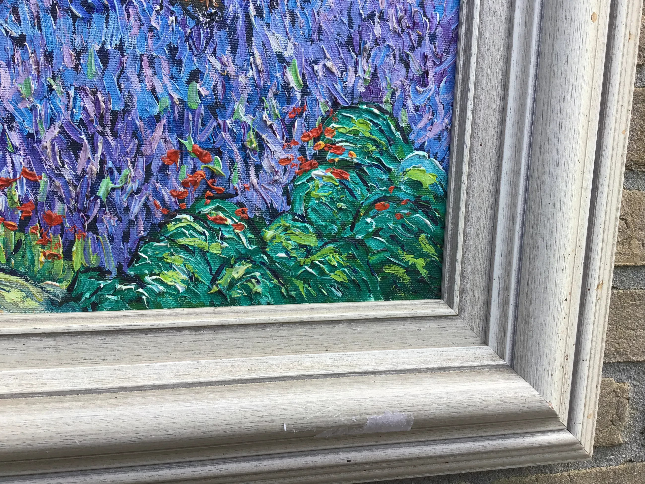 Uitbundig bloeiende bomen in een Zuid-Frans aandoend landschap. Impressionistisch werk met een heel duidelijke invloed van Vincent van Gogh. De maker heeft niet op verf bezuinigd!