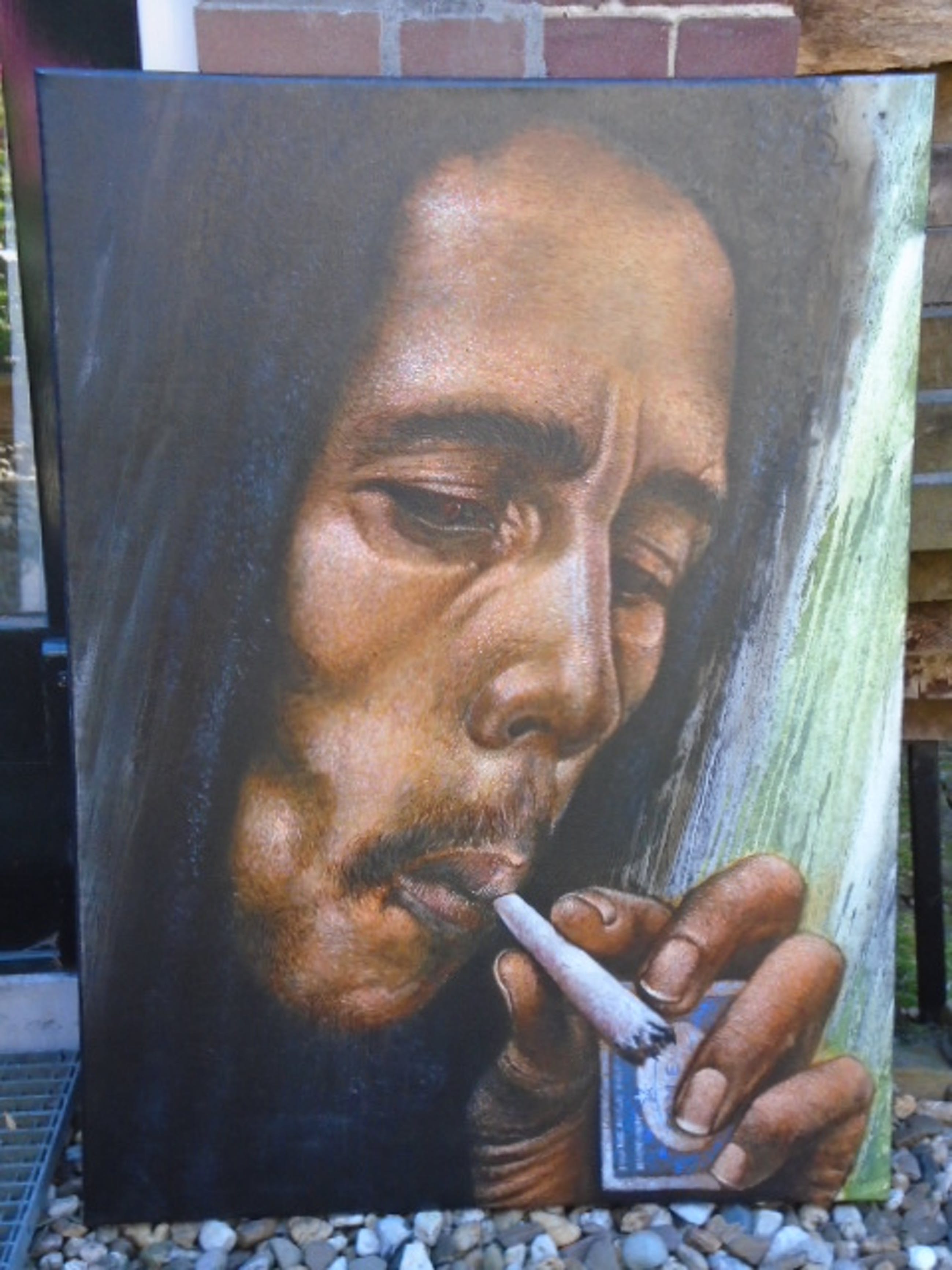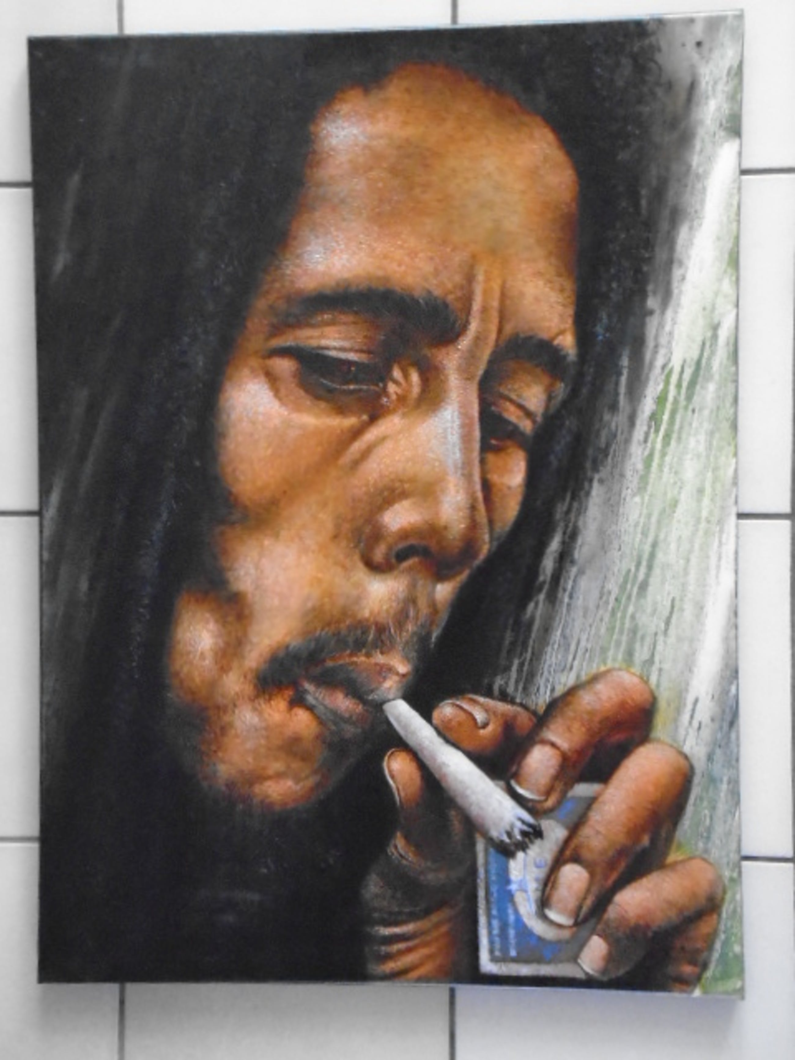 Iconisch schilderij van de bekende reggaezanger uit Jamaica die in 1981 is overleden.Het doek is zonder lijst.Geen signatuur kunnen vinden.