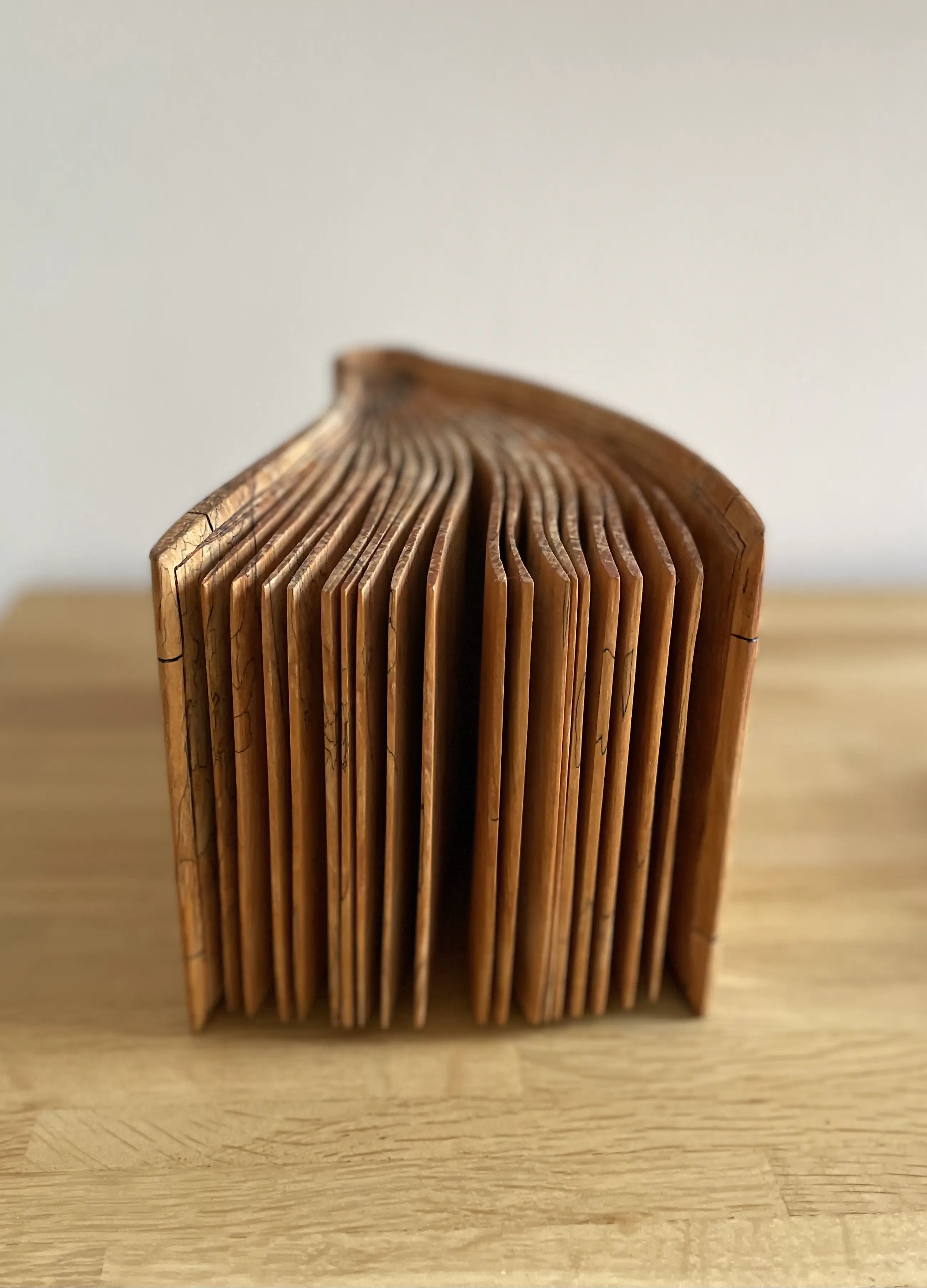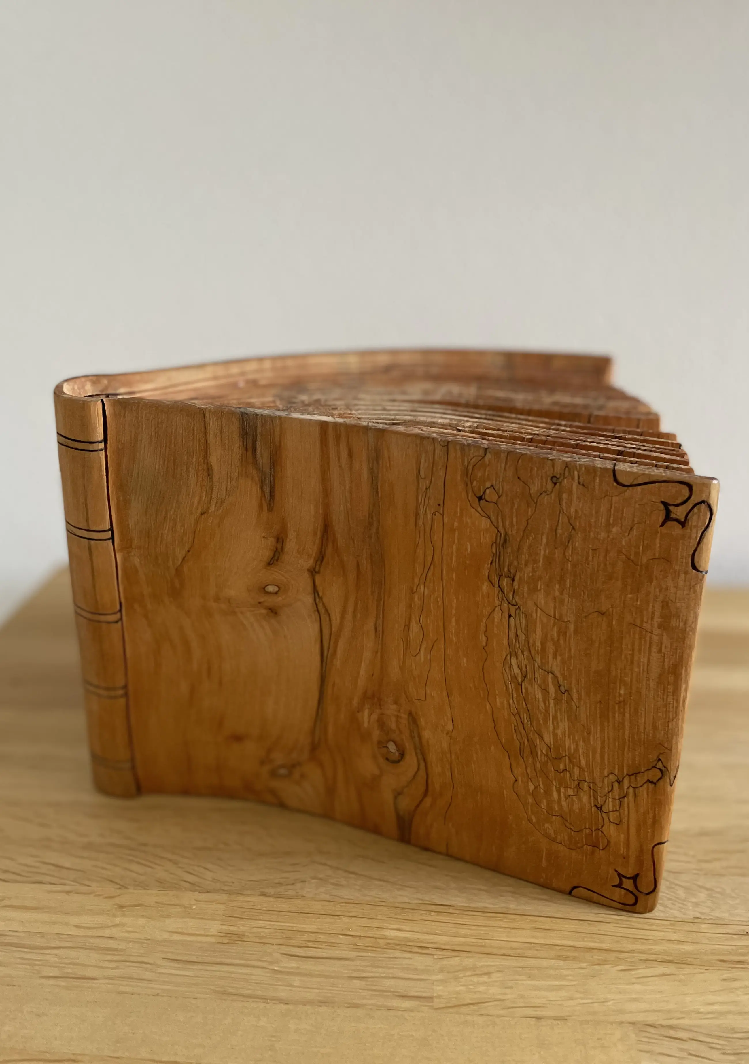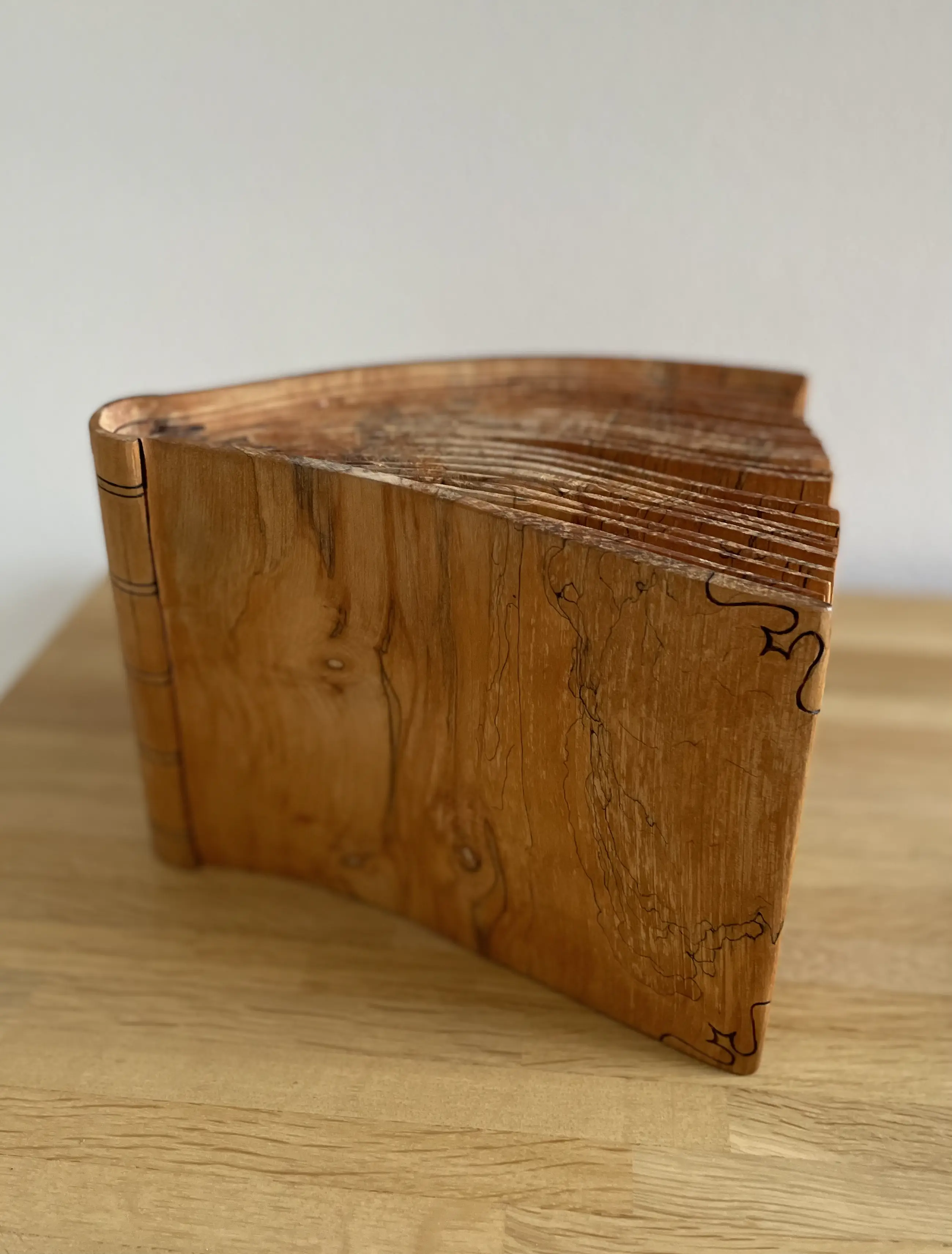 Uit een blok hout met fraaie tekening is dit 'boek' gestoken, compleet met bladzijden
