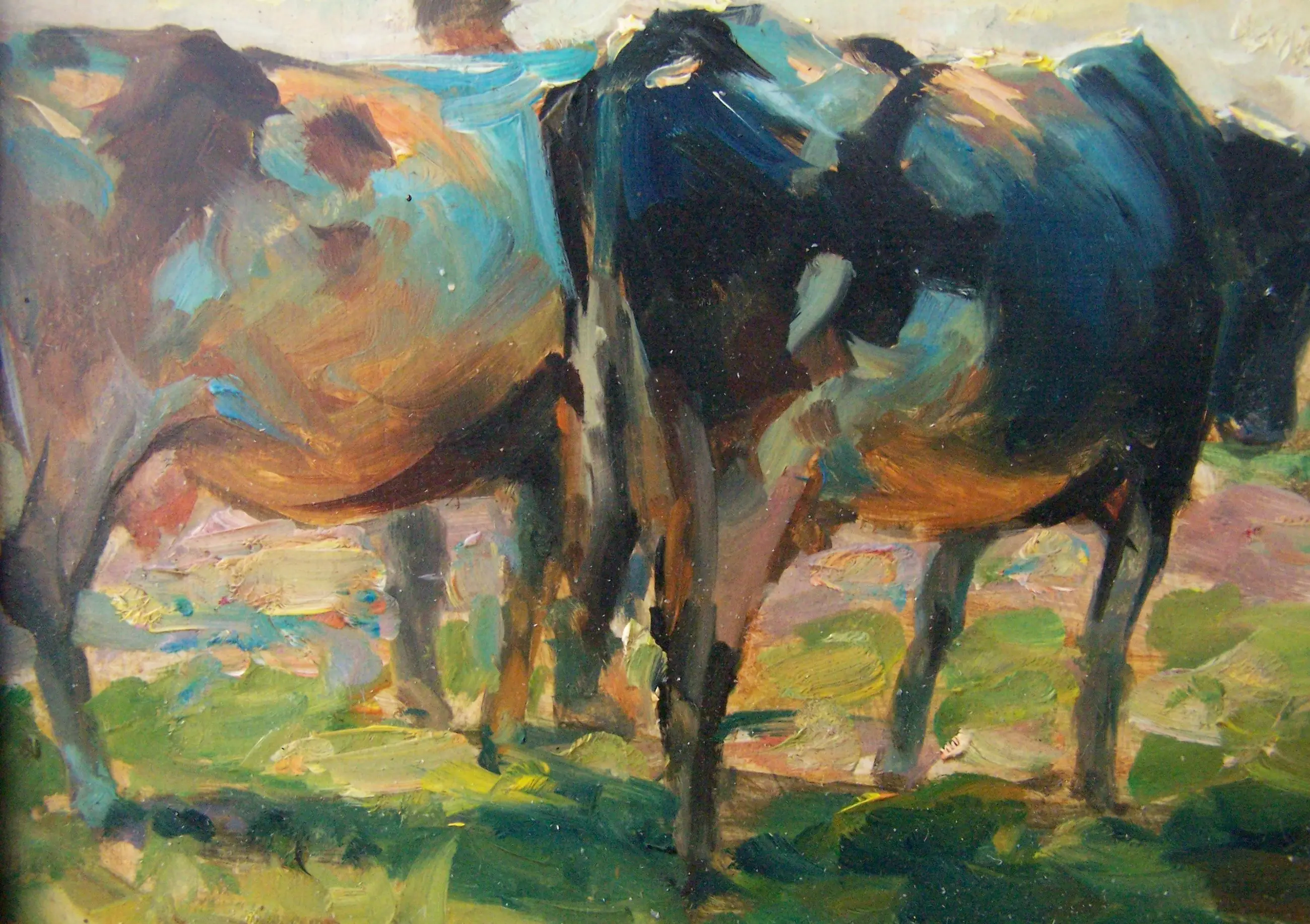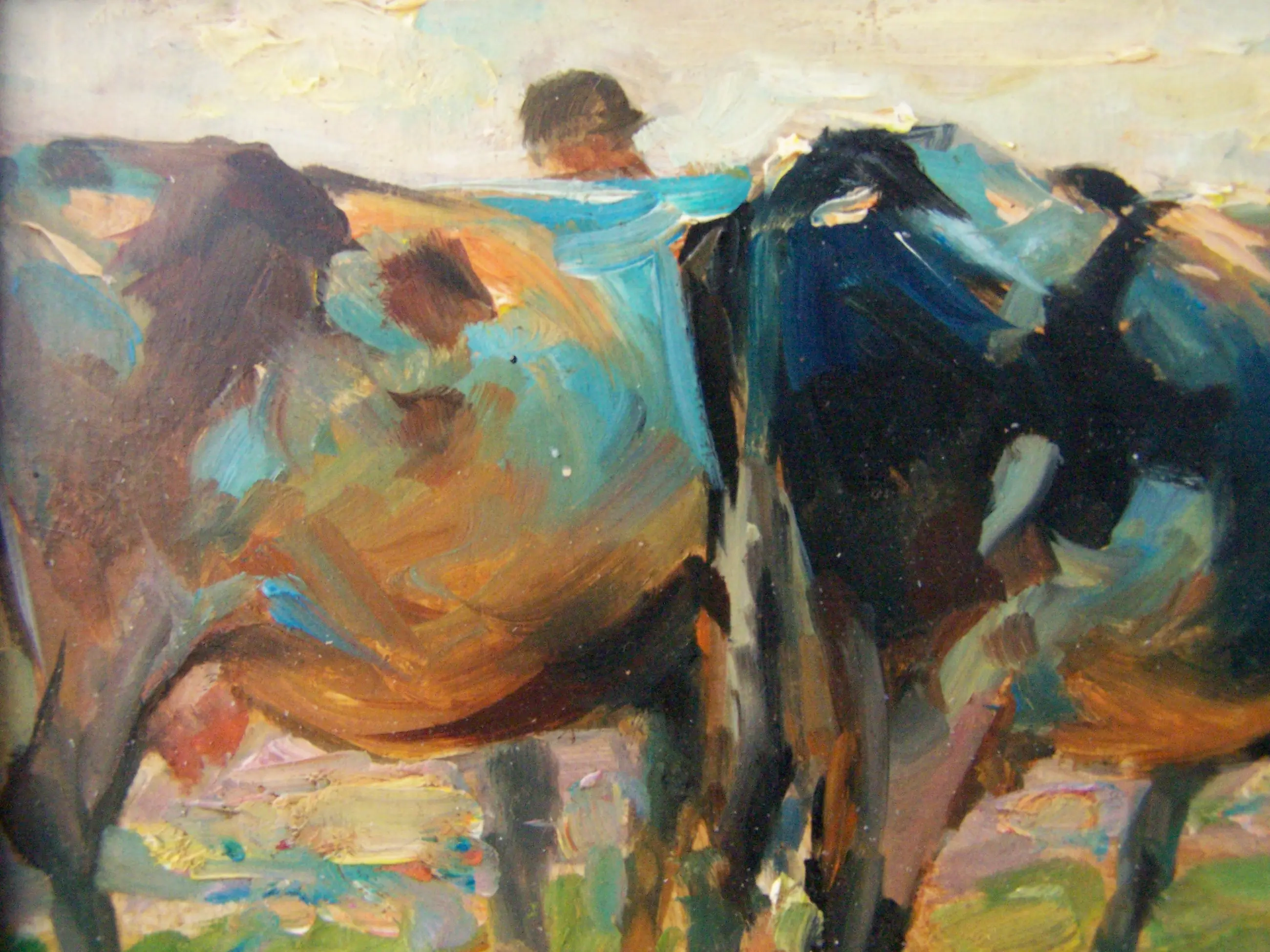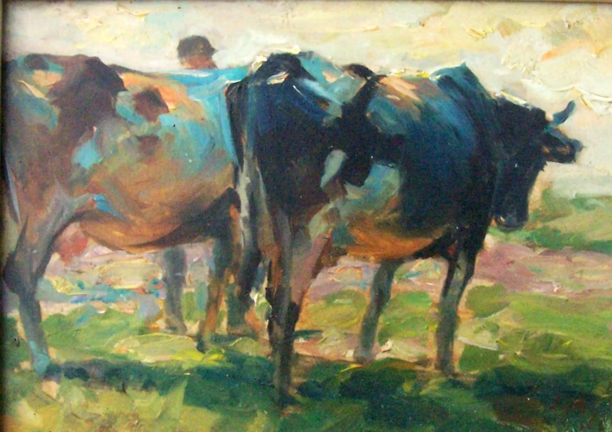 Mooi impressionistisch werk van een boer met tweet koeien.