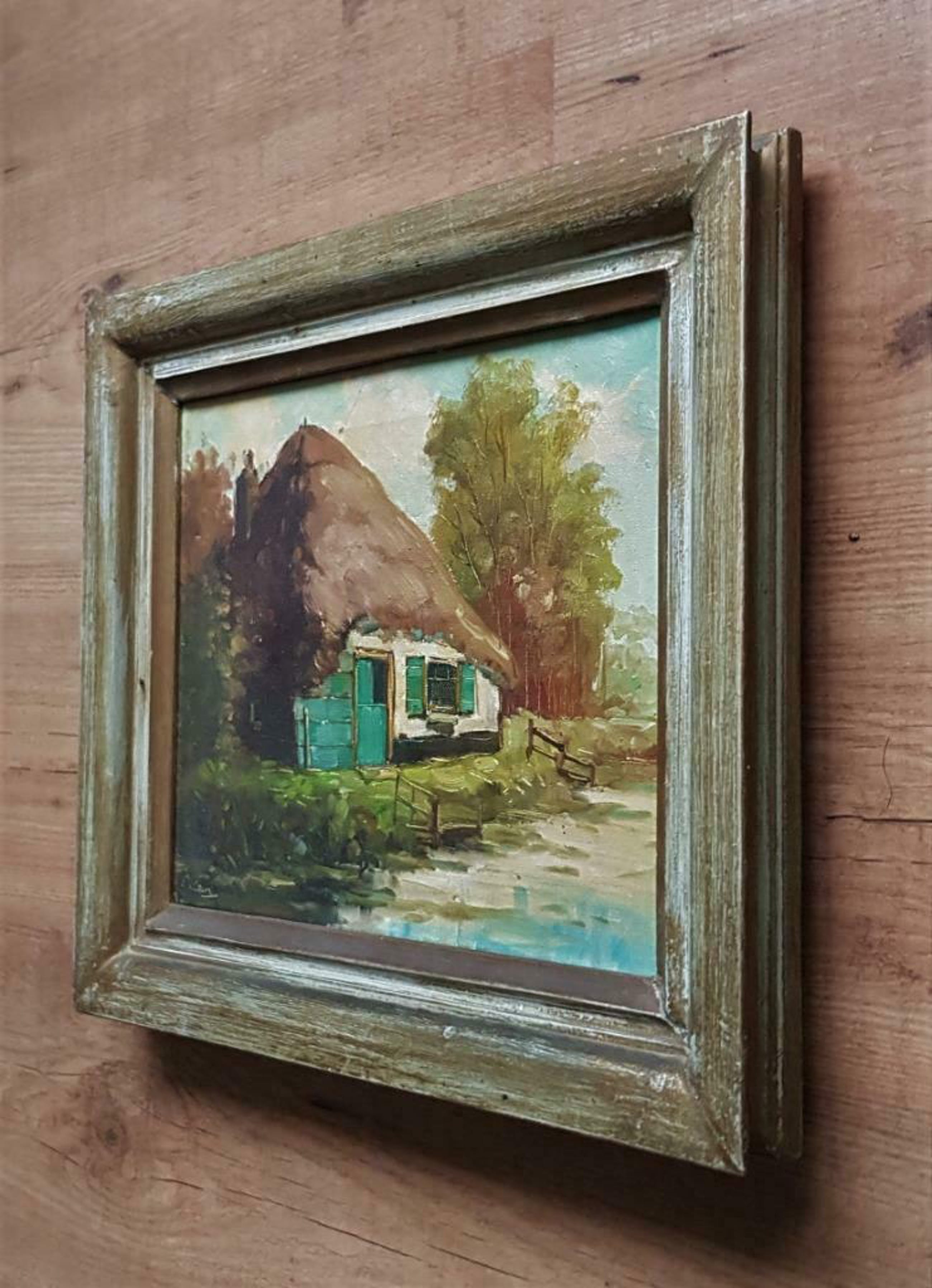 Hollandse school Boerderij bij sloot Olieverf op doek Afmetingen: 24 x 30 cm - met lijst 34 x 40 cm In goede staat - zie foto's