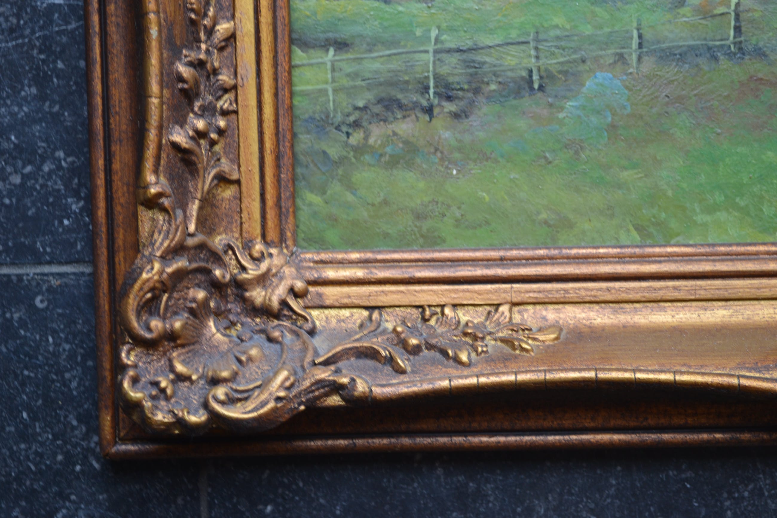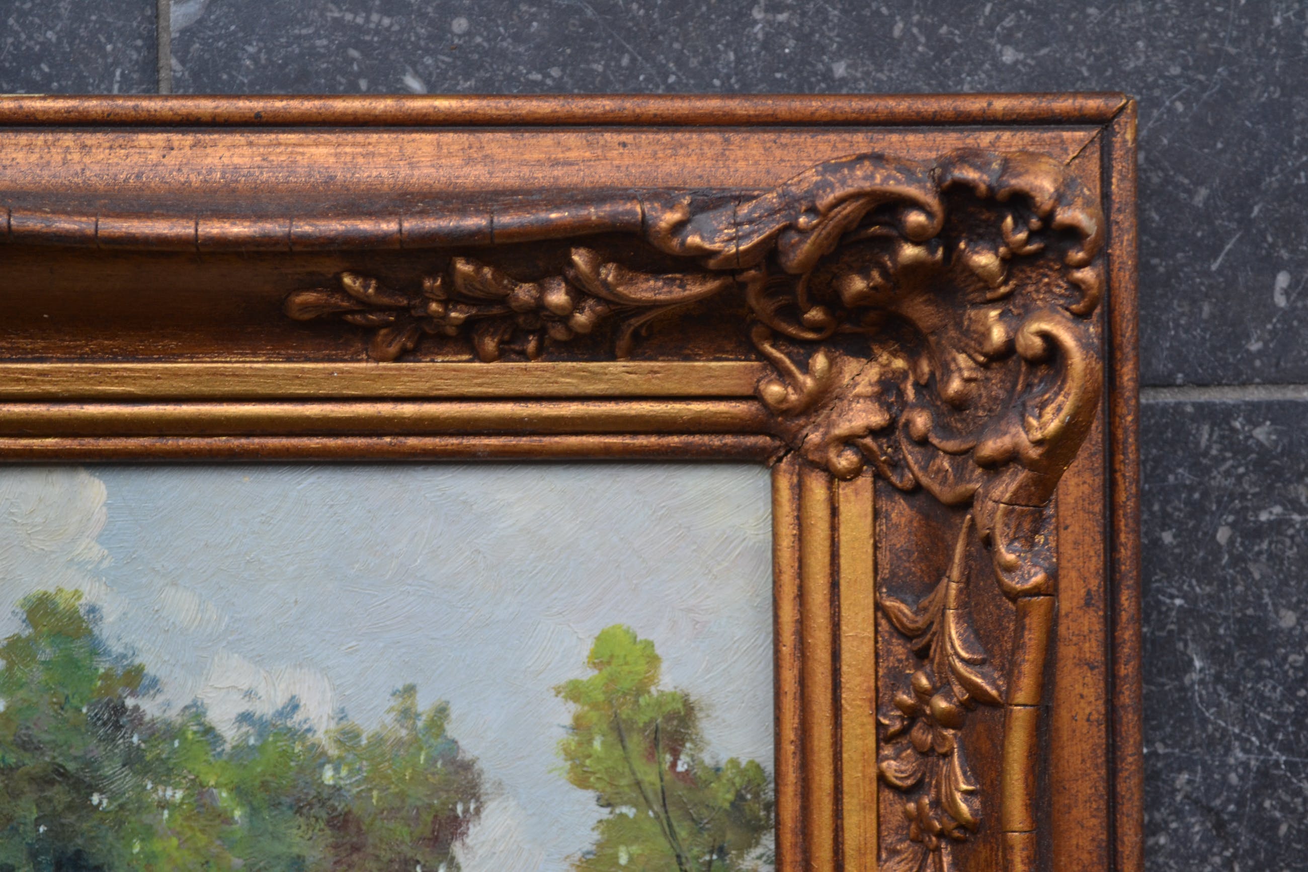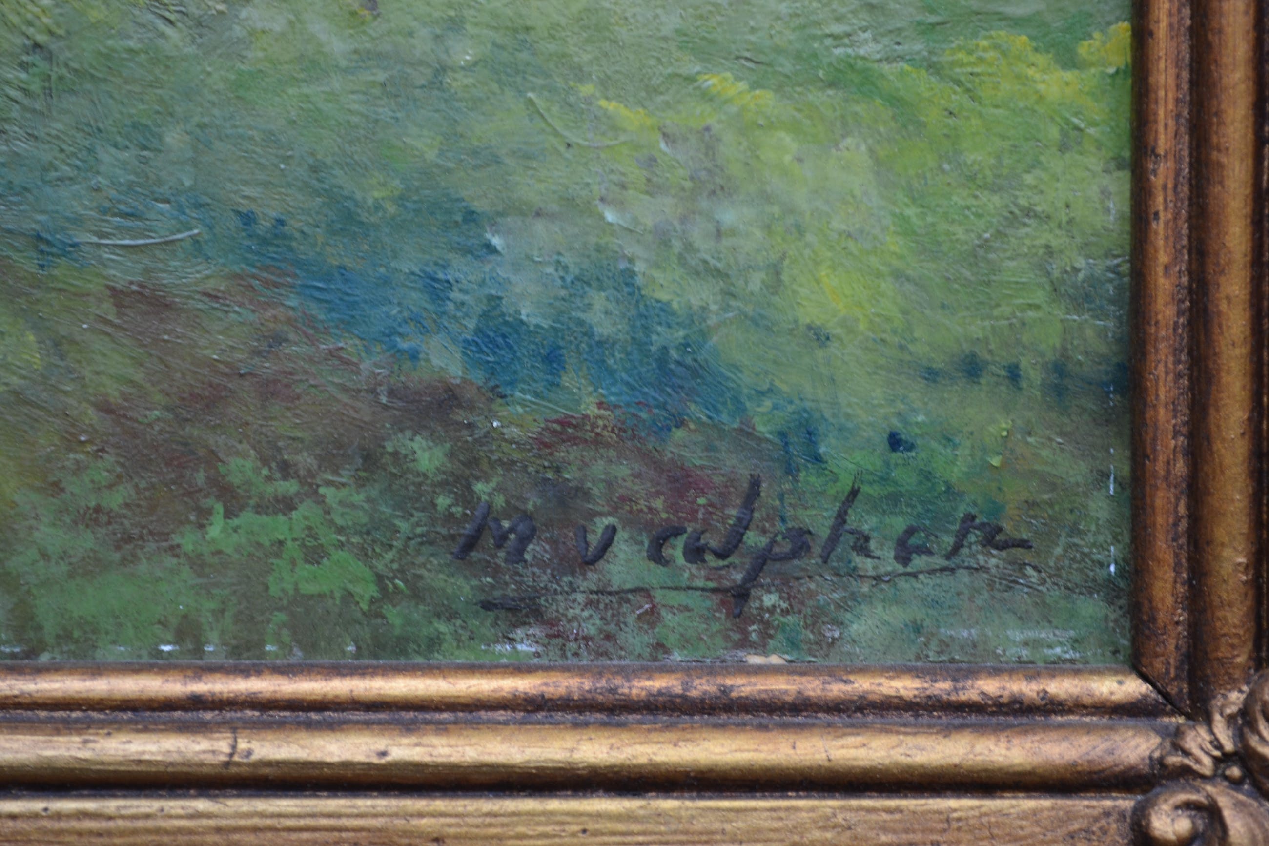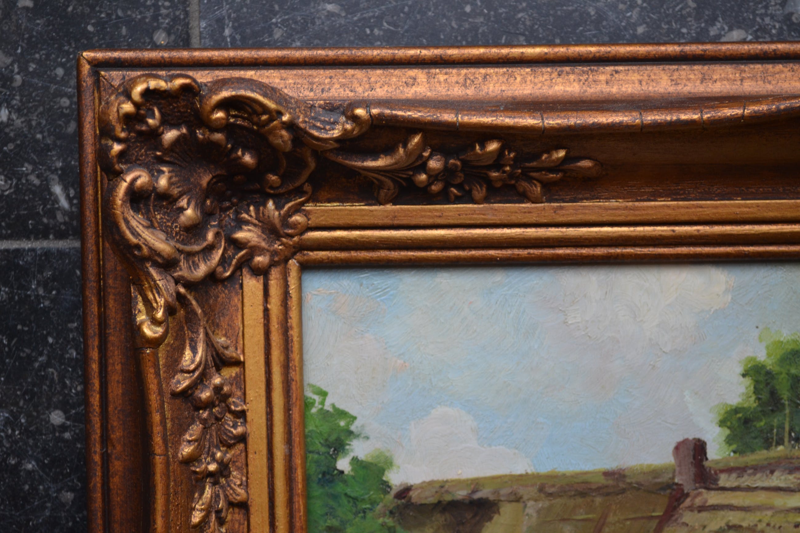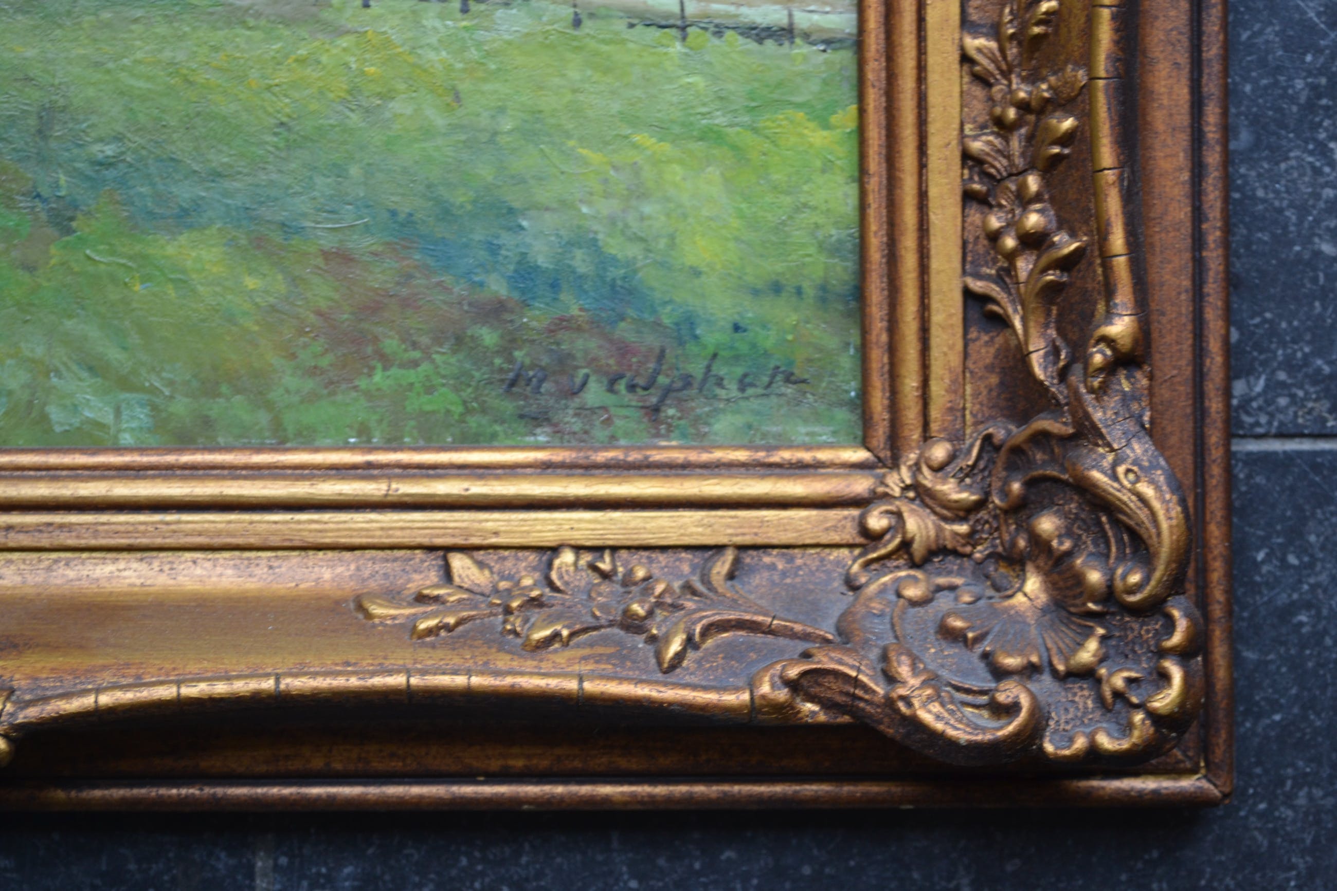 Schilderij van een boerderij in een Hollands landschap, rechtsonder gesigneerd (M. van Alphen ?). Olieverf op paneel en in goede staat. Voorzien van fraaie lijst.