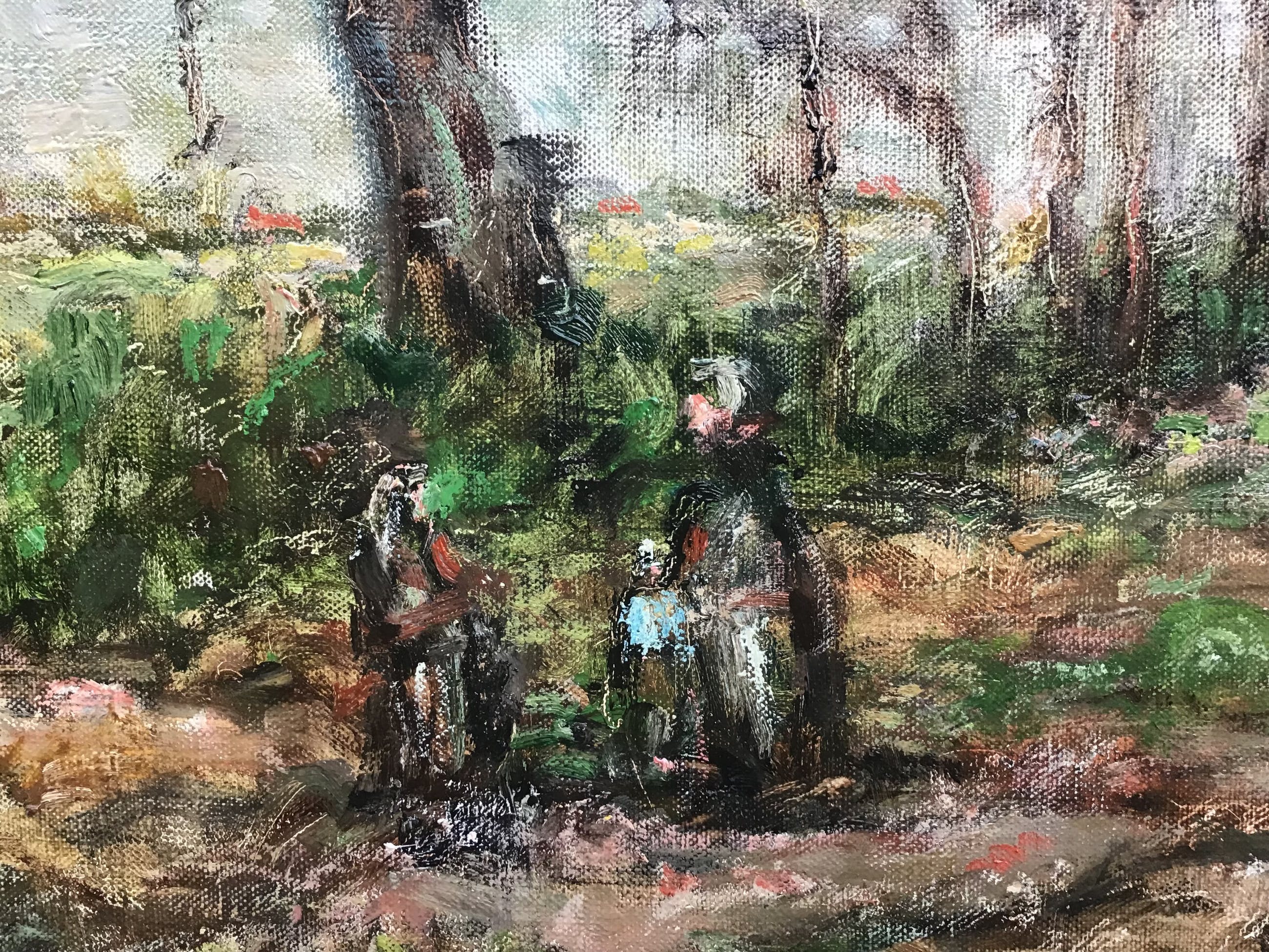 Impressionistisch beeld van boeren op het werk op een akker omzoomd door knotwilgen.