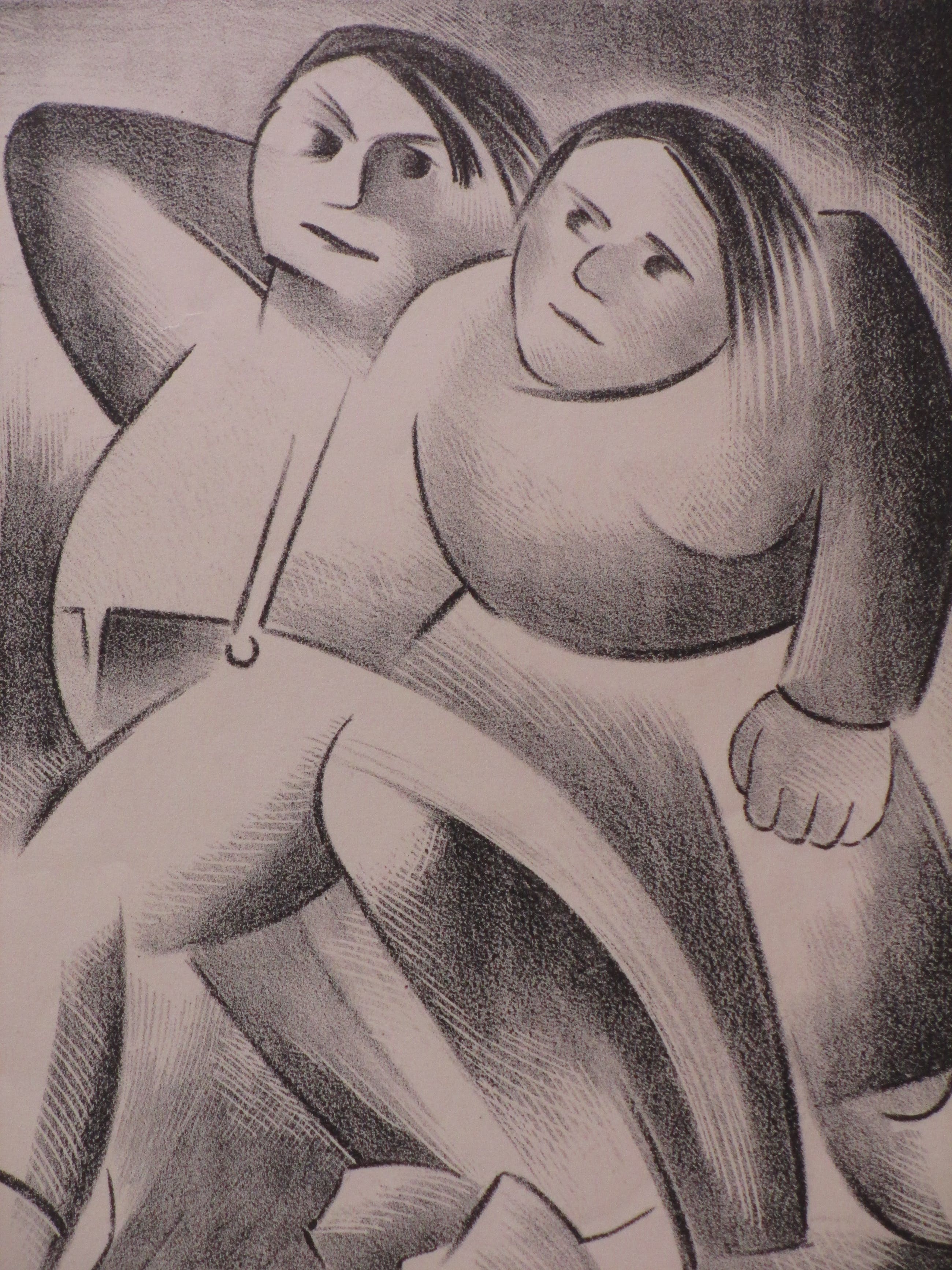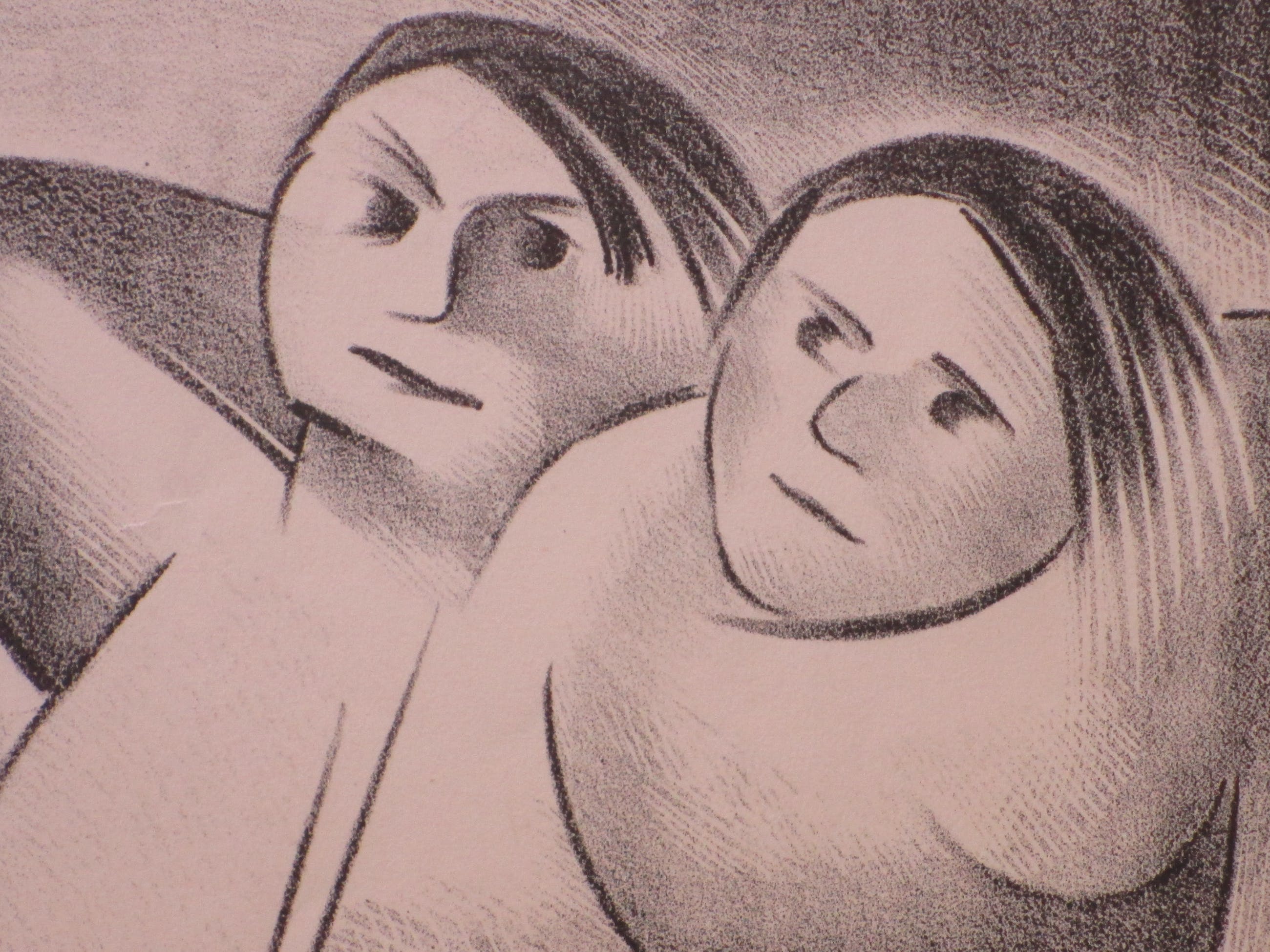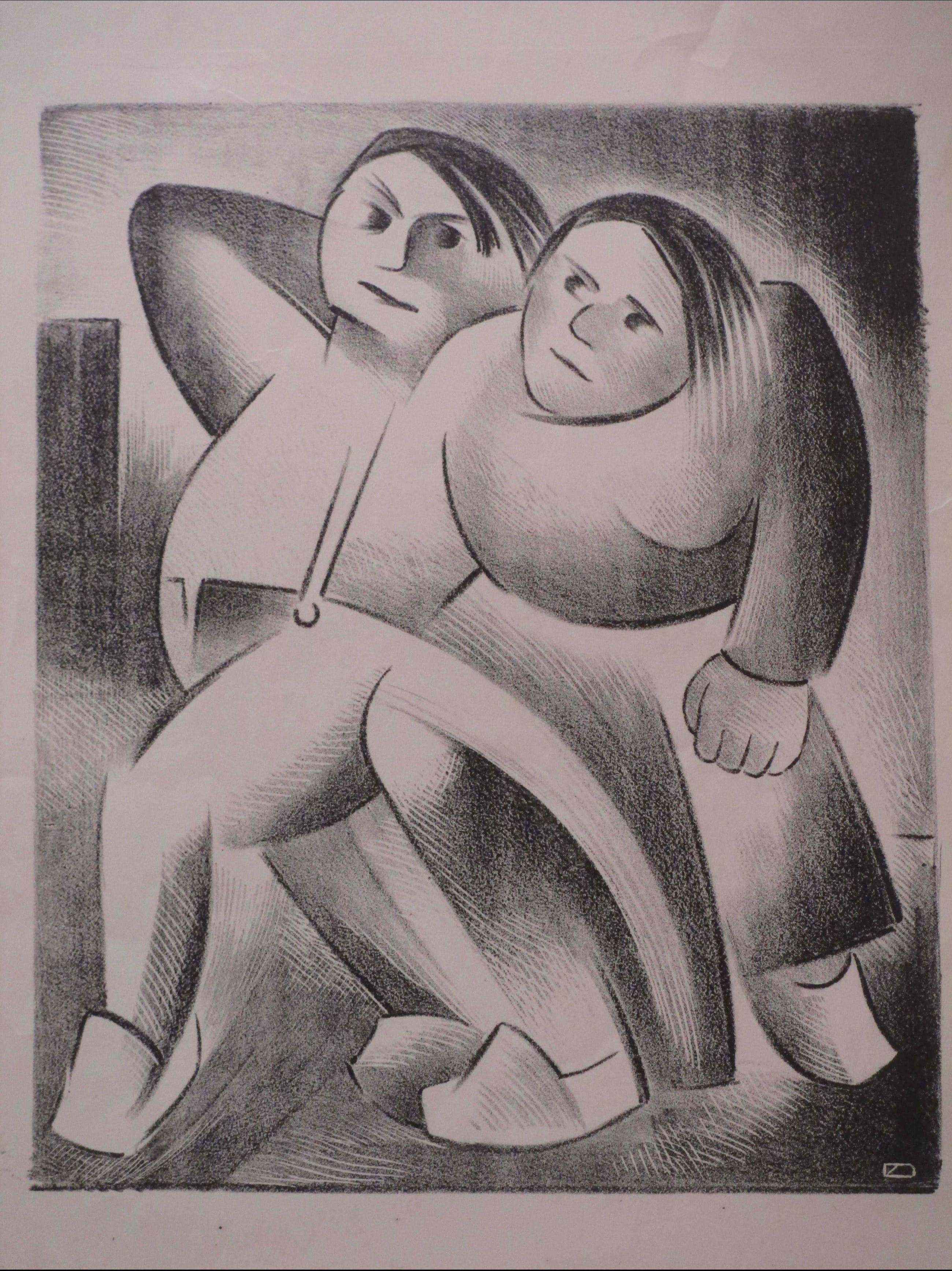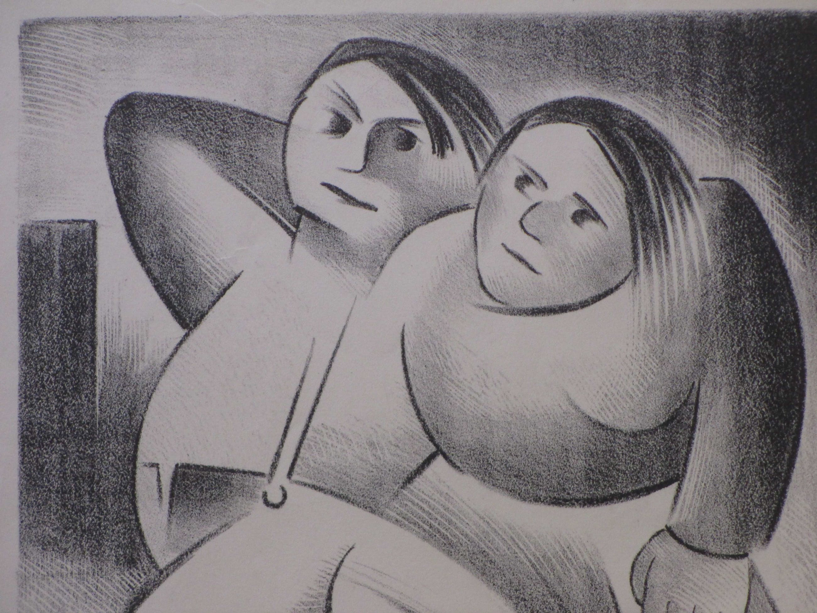 Litho in de trant van de Belgische School. Voorstelling van een boerenpaar. Losbladig, beeldmaat 31x26, bladmaat 48x32 Niet gesigneerd, gemonogrammeerd rechtsonder