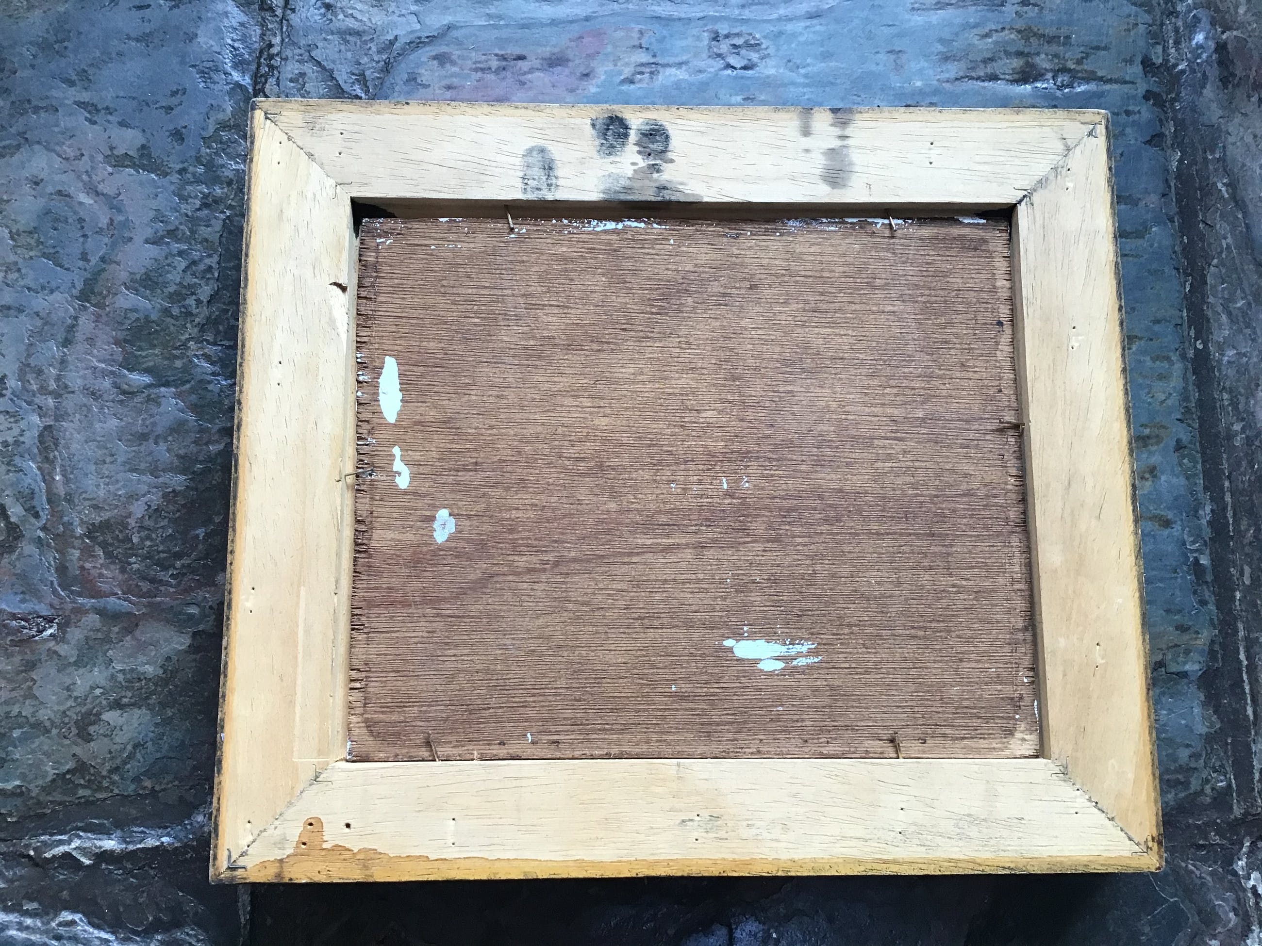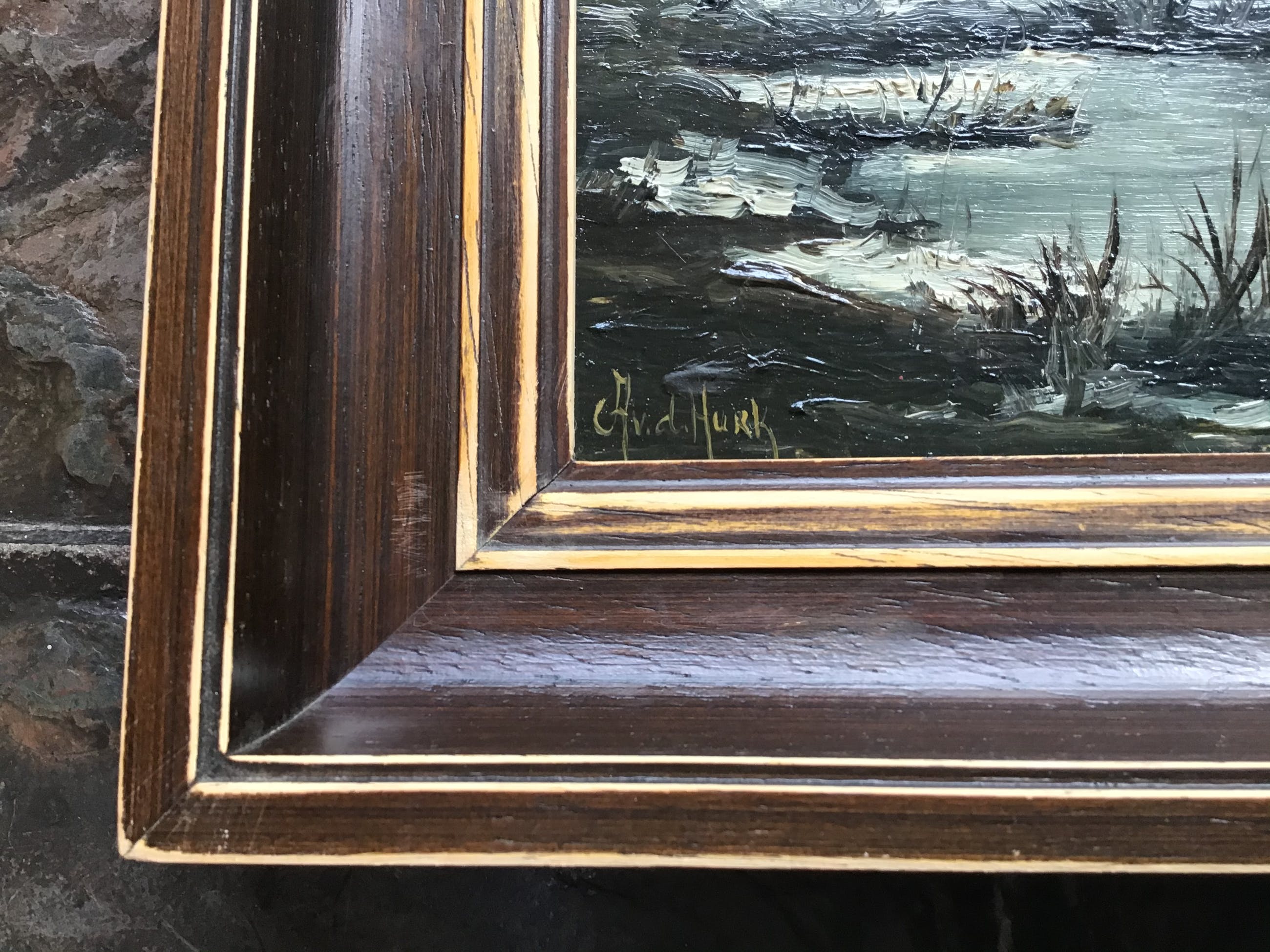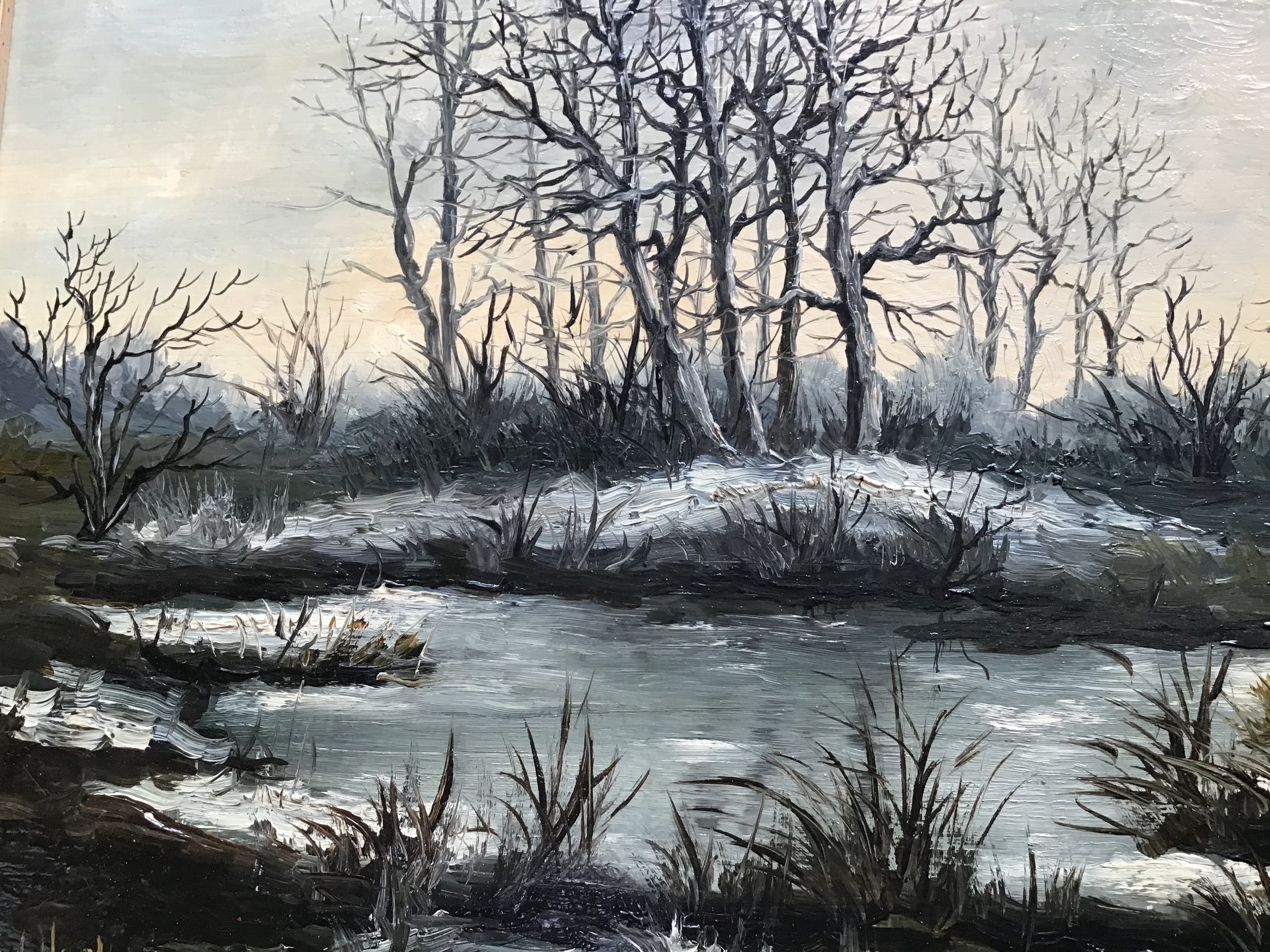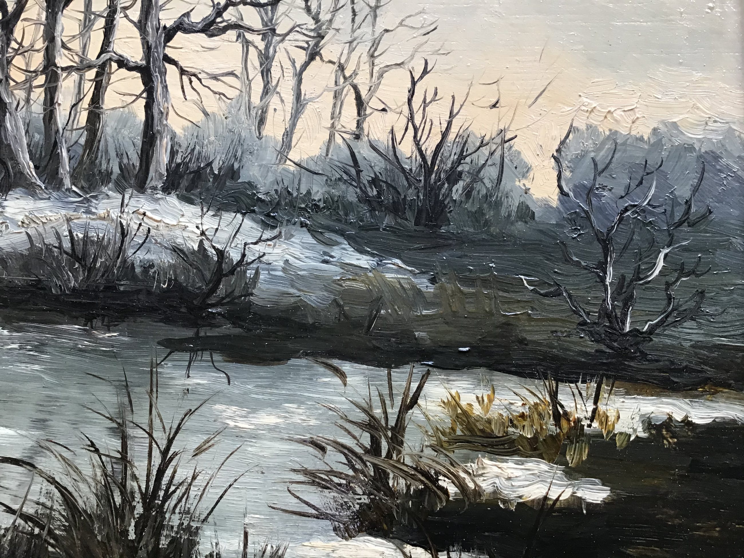 Winterlandschapje van een groepje bomen in de Peel. Olieverf op paneel met een dichte achterzijde.