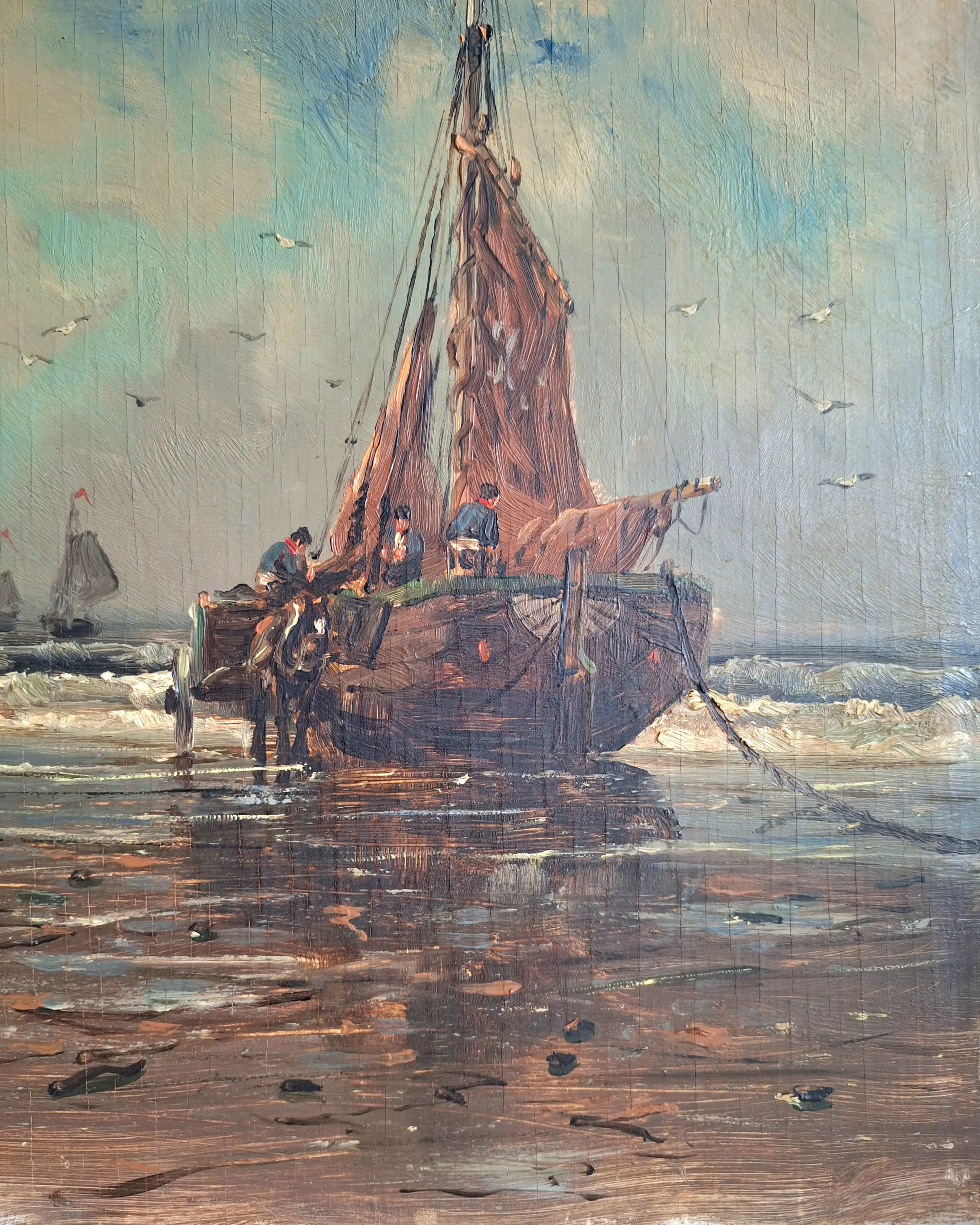 Het schilderij toont een traditionele Nederlandse vissersboot, een bomschuit, op het strand in de branding.