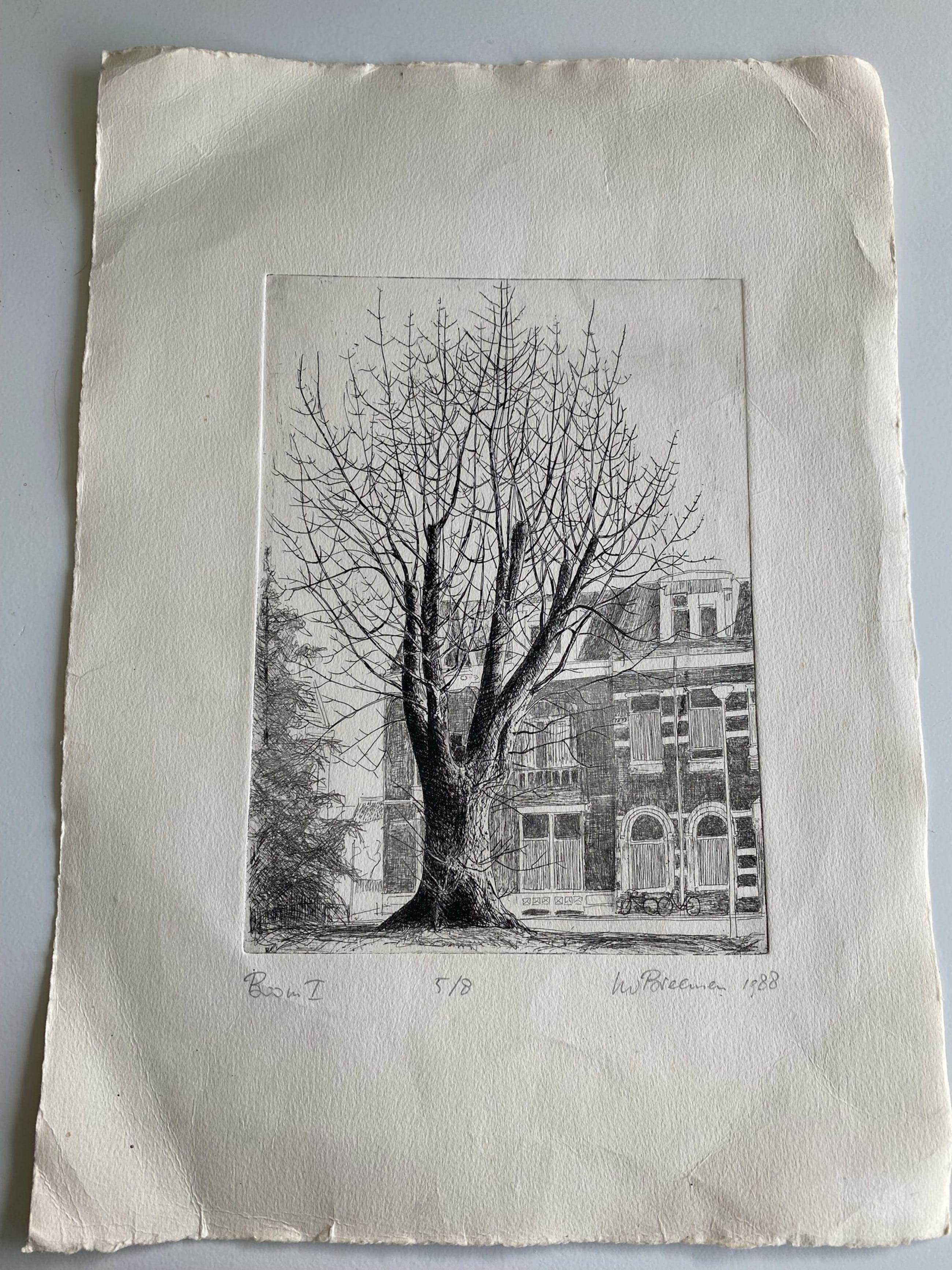 Betreft een ets (Boom I) met daarop afgebeeld een stadsgezicht met boom. Gesigneerd (H. van Breemen?) en genummerd (5/8). Ets formaat 16,5x22,5cm.
