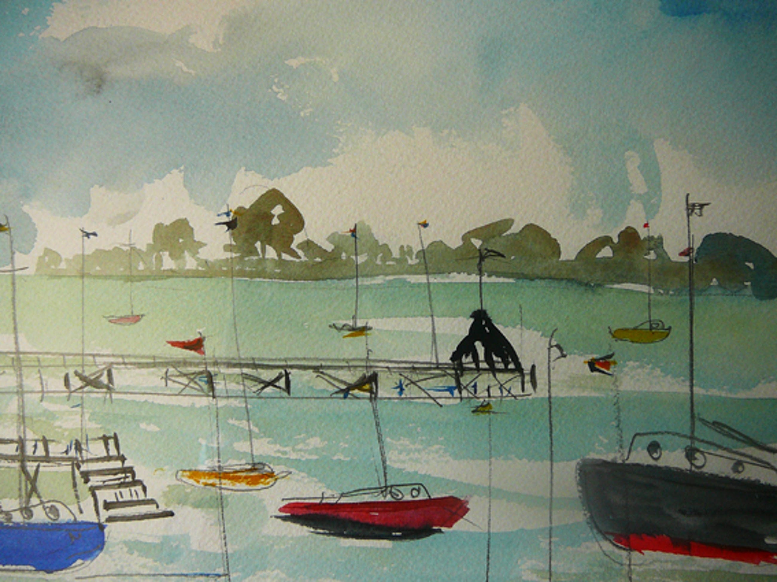 Mooie impressionistische aquarel in zeer goede staat met een voorstelling van bootjes aan het strand, vermoedelijk Caribische kust.