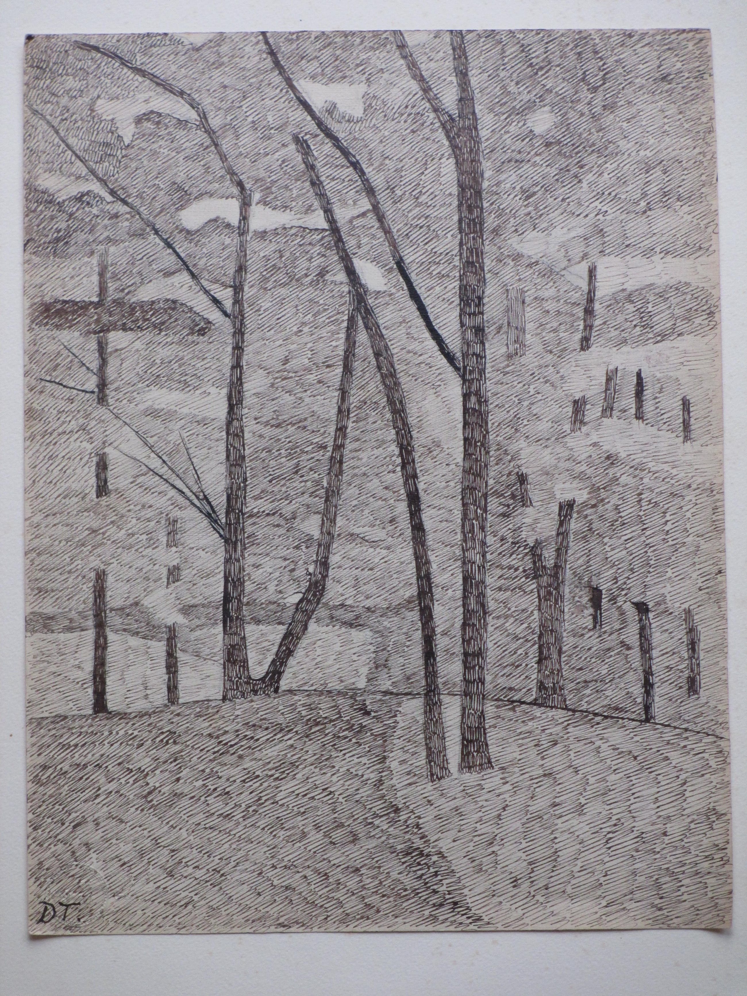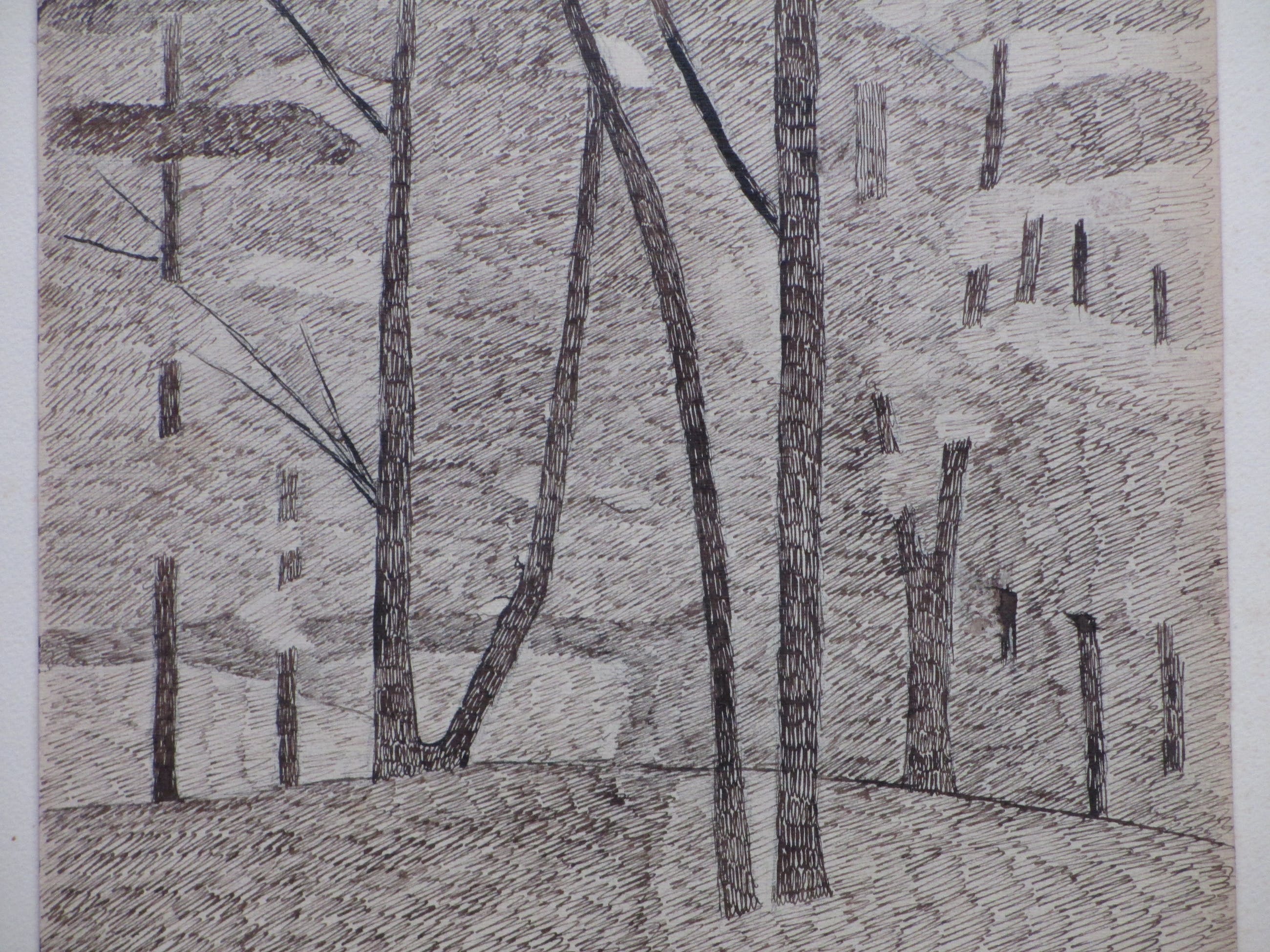 Gemonogrammeerde tekening 'D.T.' - Dirk Trap?Minimalistische voorstelling van een bosLosbladig, beeldmaat 32x24,5Gemonogrammeerd in inkt l.o. ' D.T.'