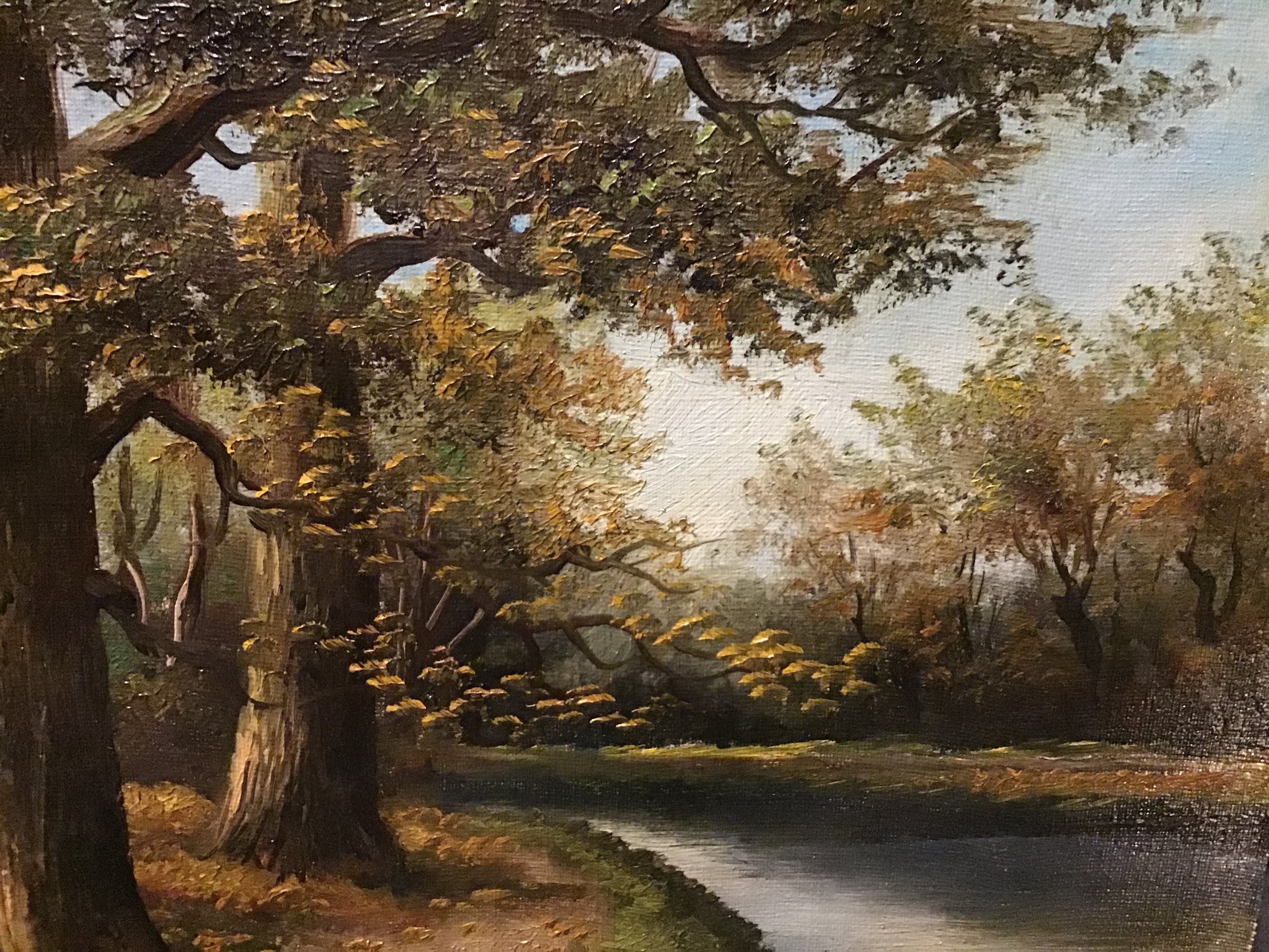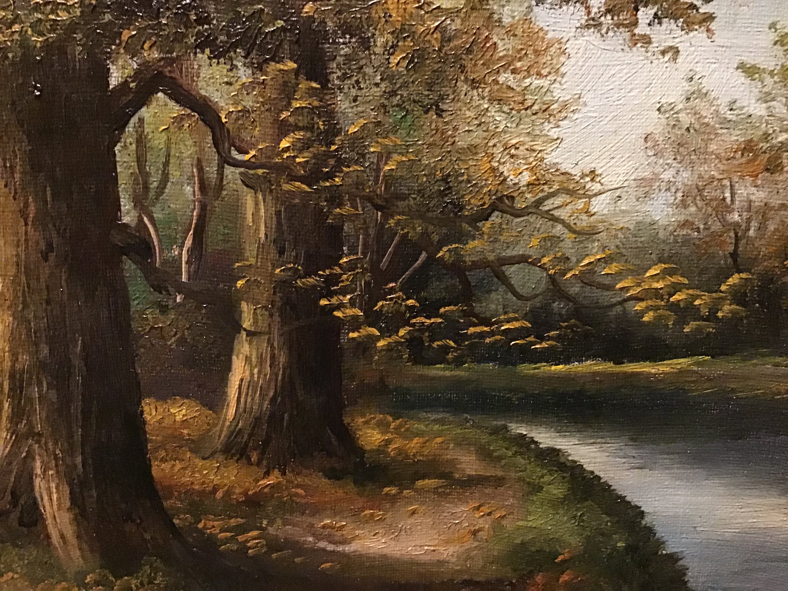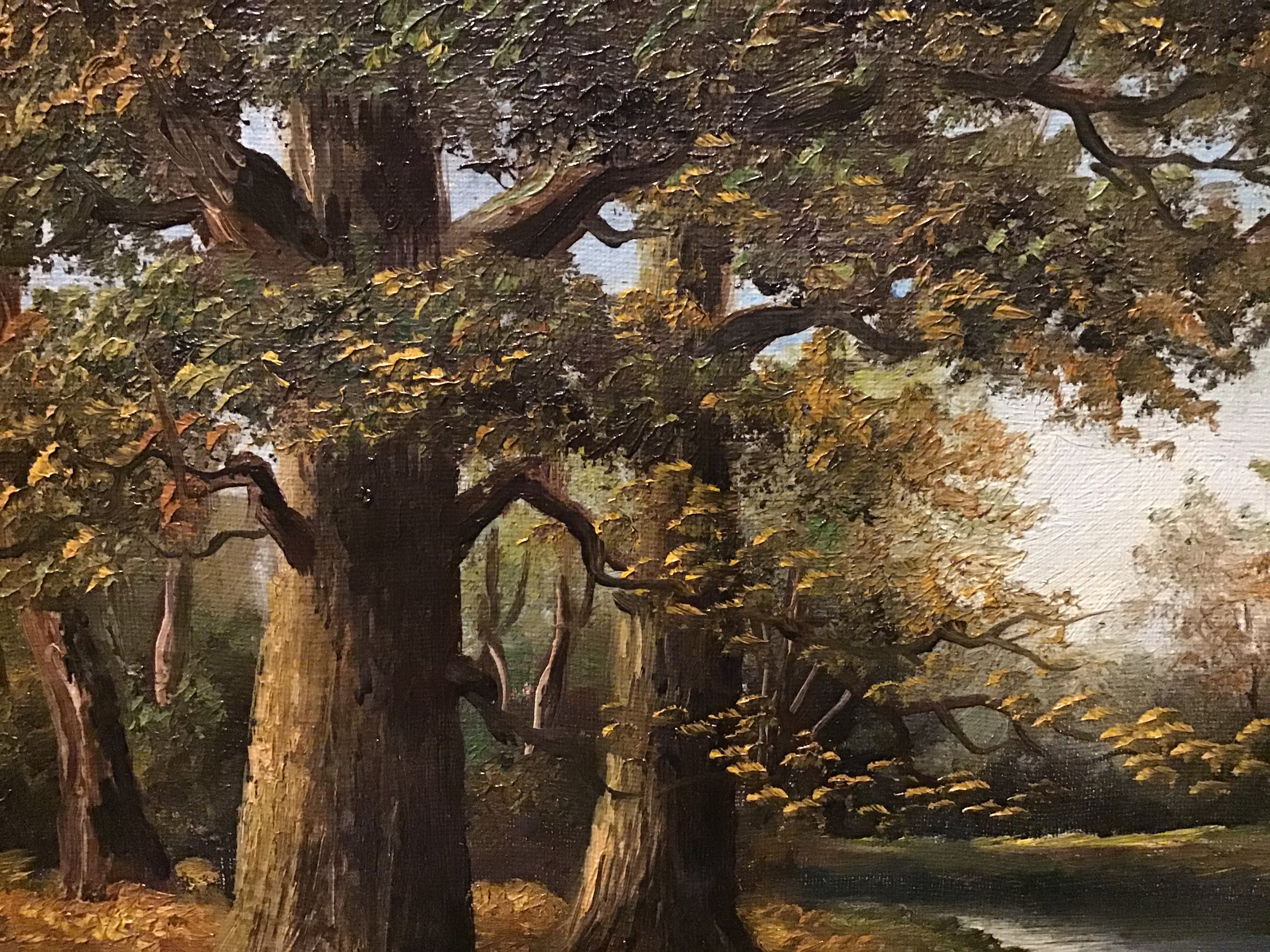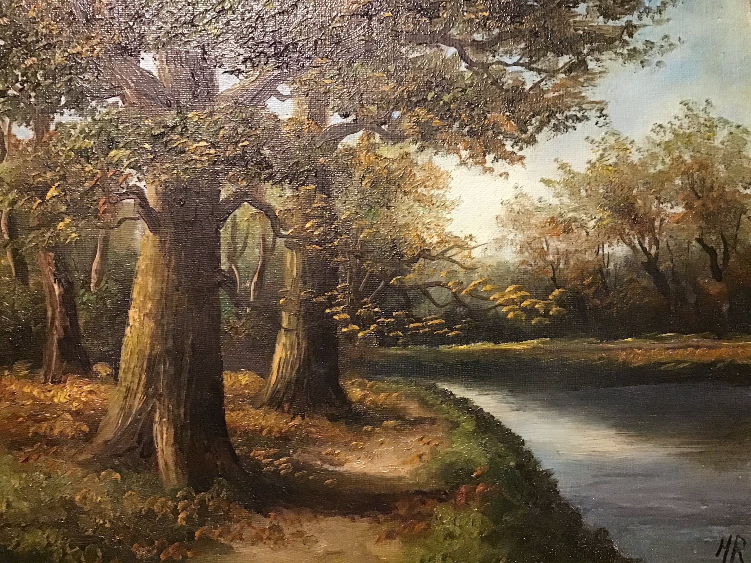Olieverf op doek op paneel gelijmd. Erg mooie bomen in een bos met een riviertje. Enkel gesigneerd met de initialen HR.