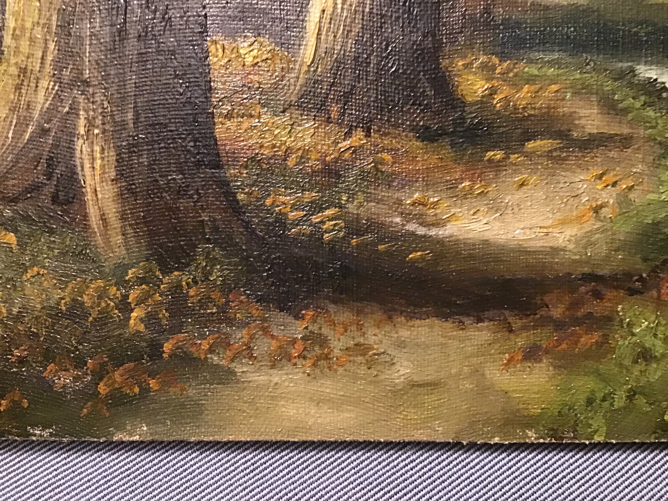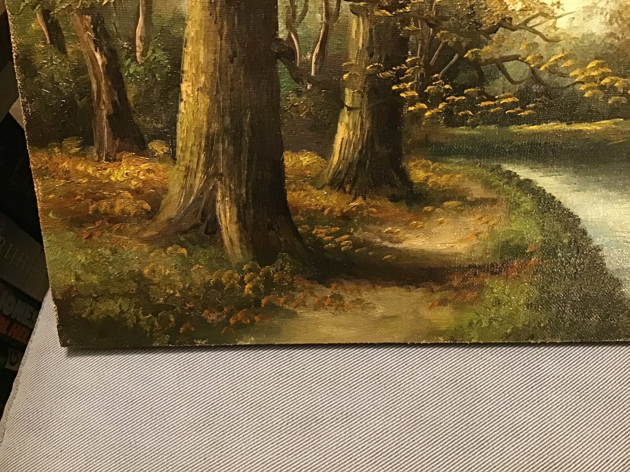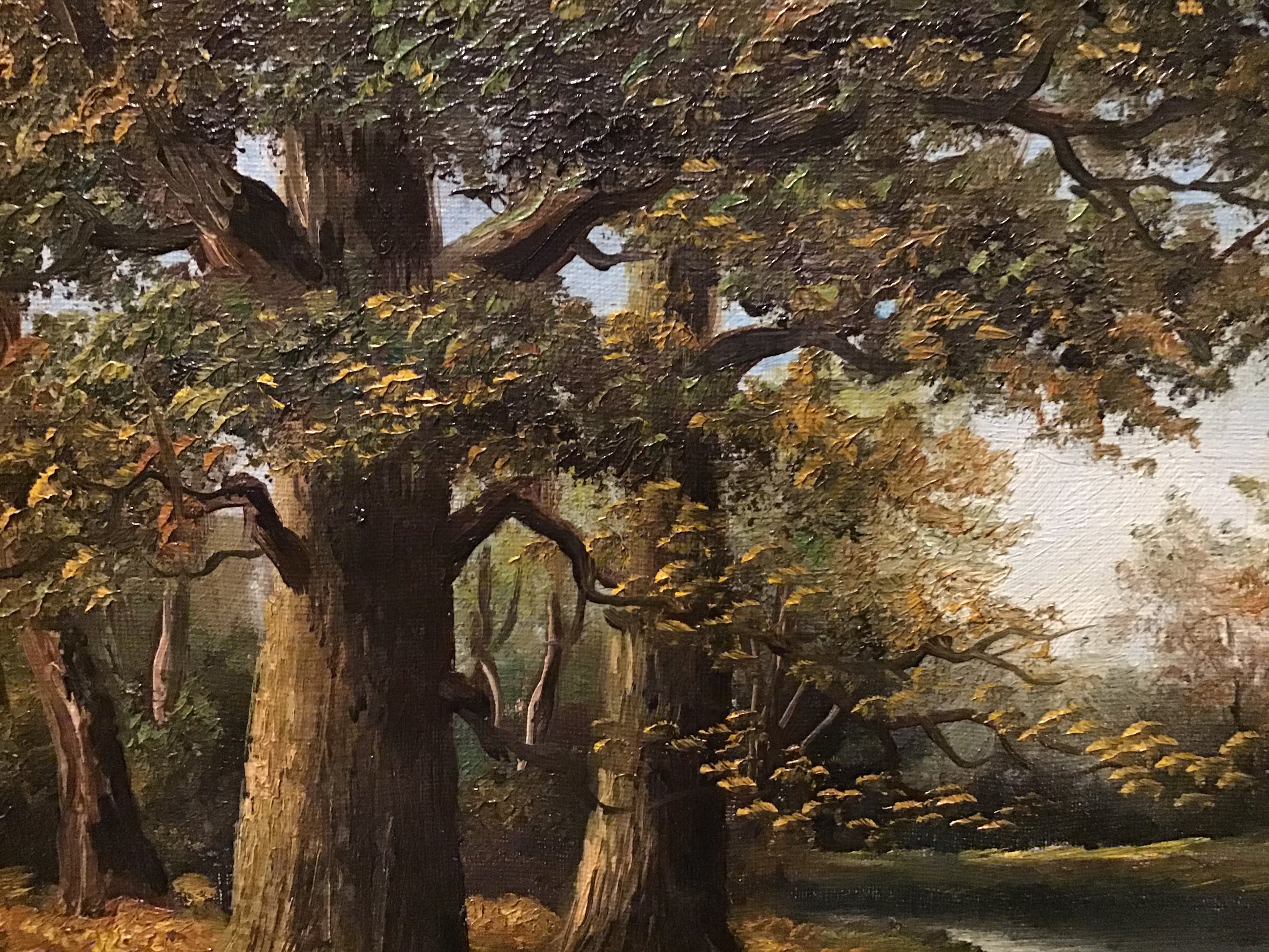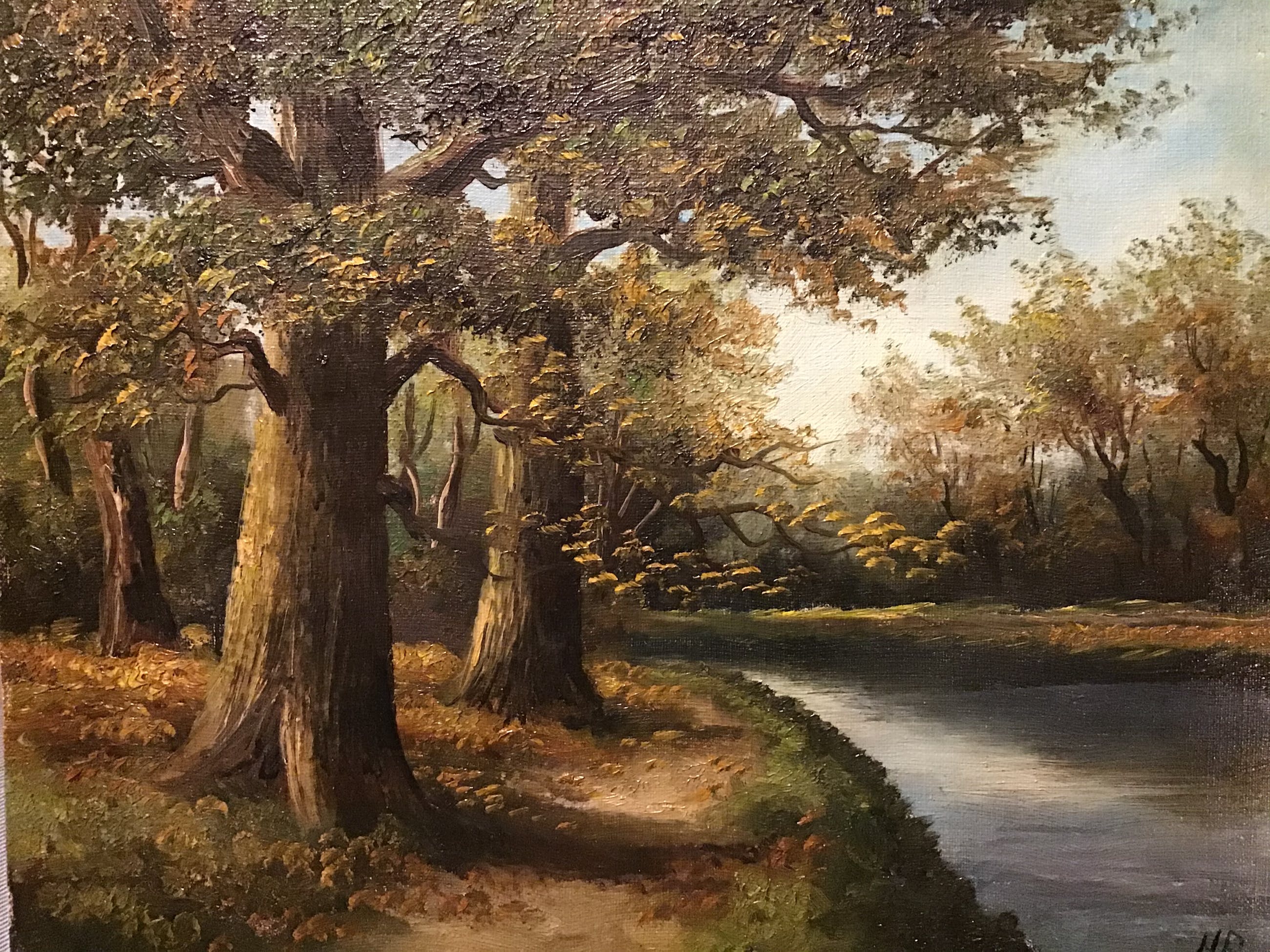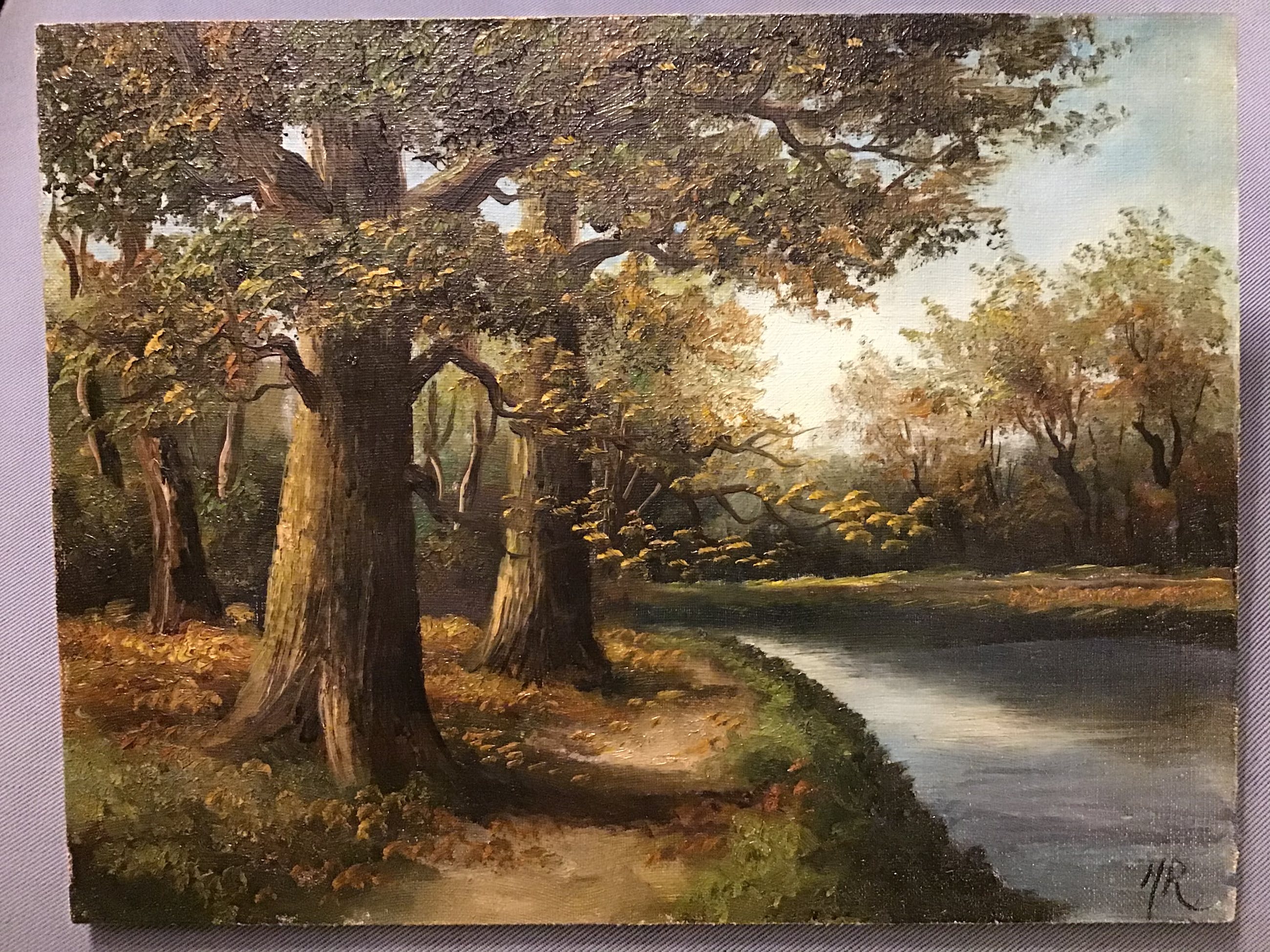 Olieverf op doek op paneel gelijmd. Erg mooie bomen in een bos met een riviertje. Enkel gesigneerd met de initialen HR.