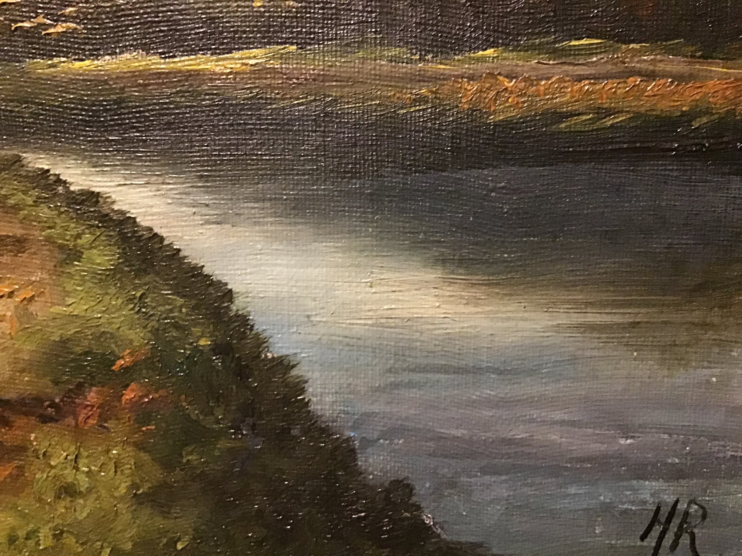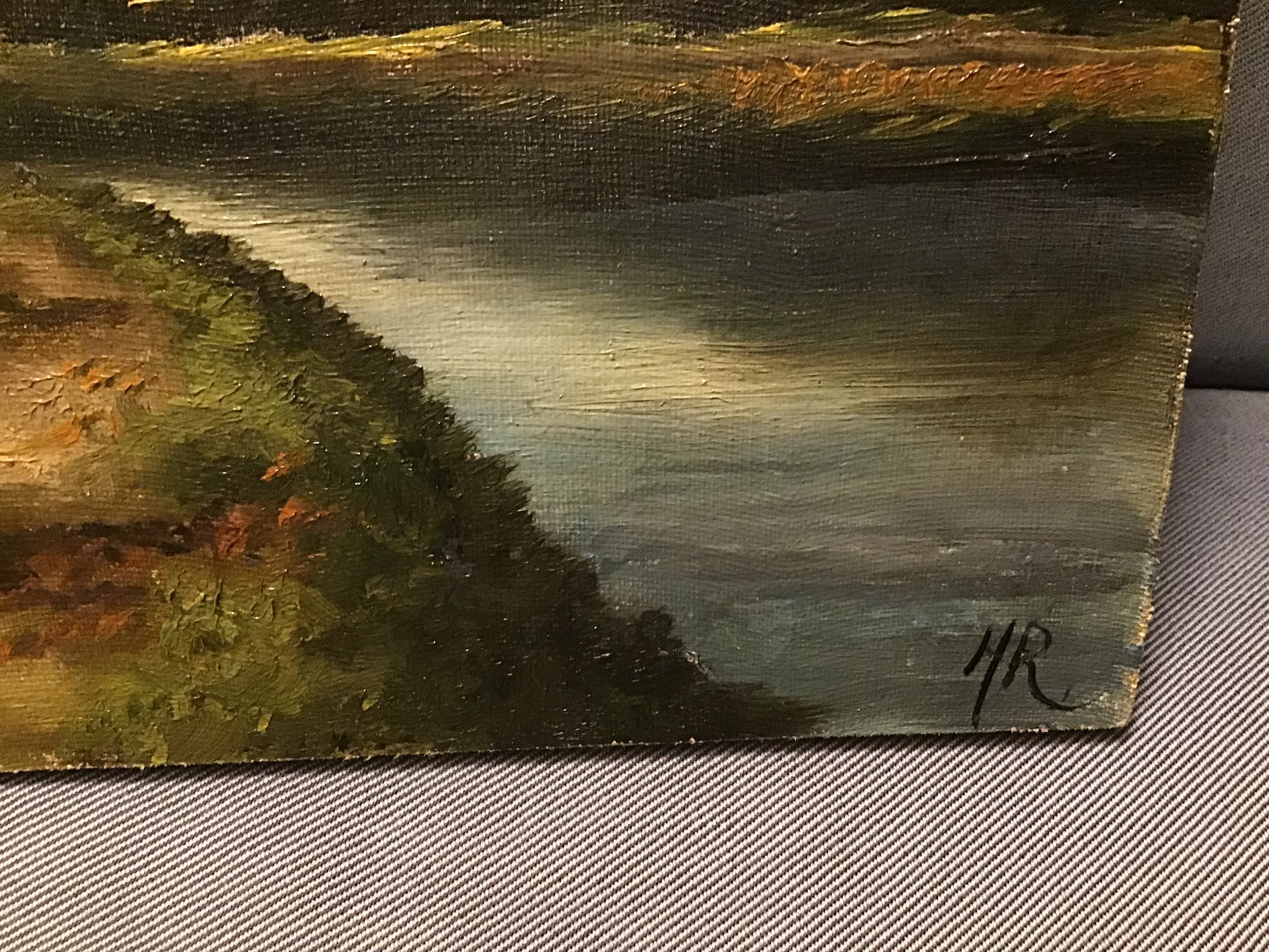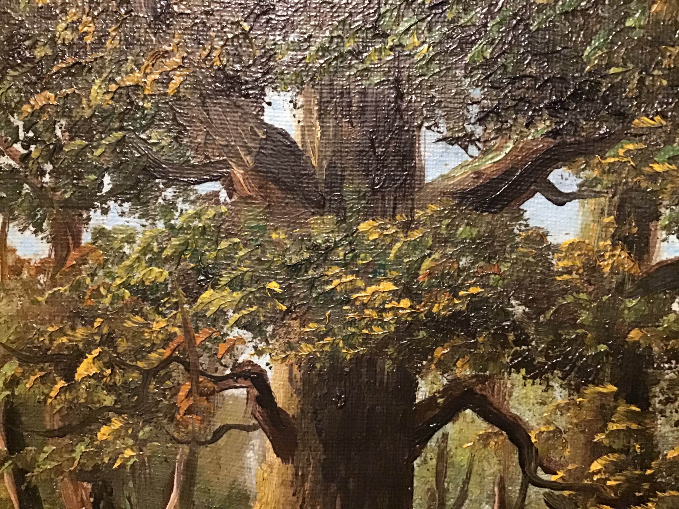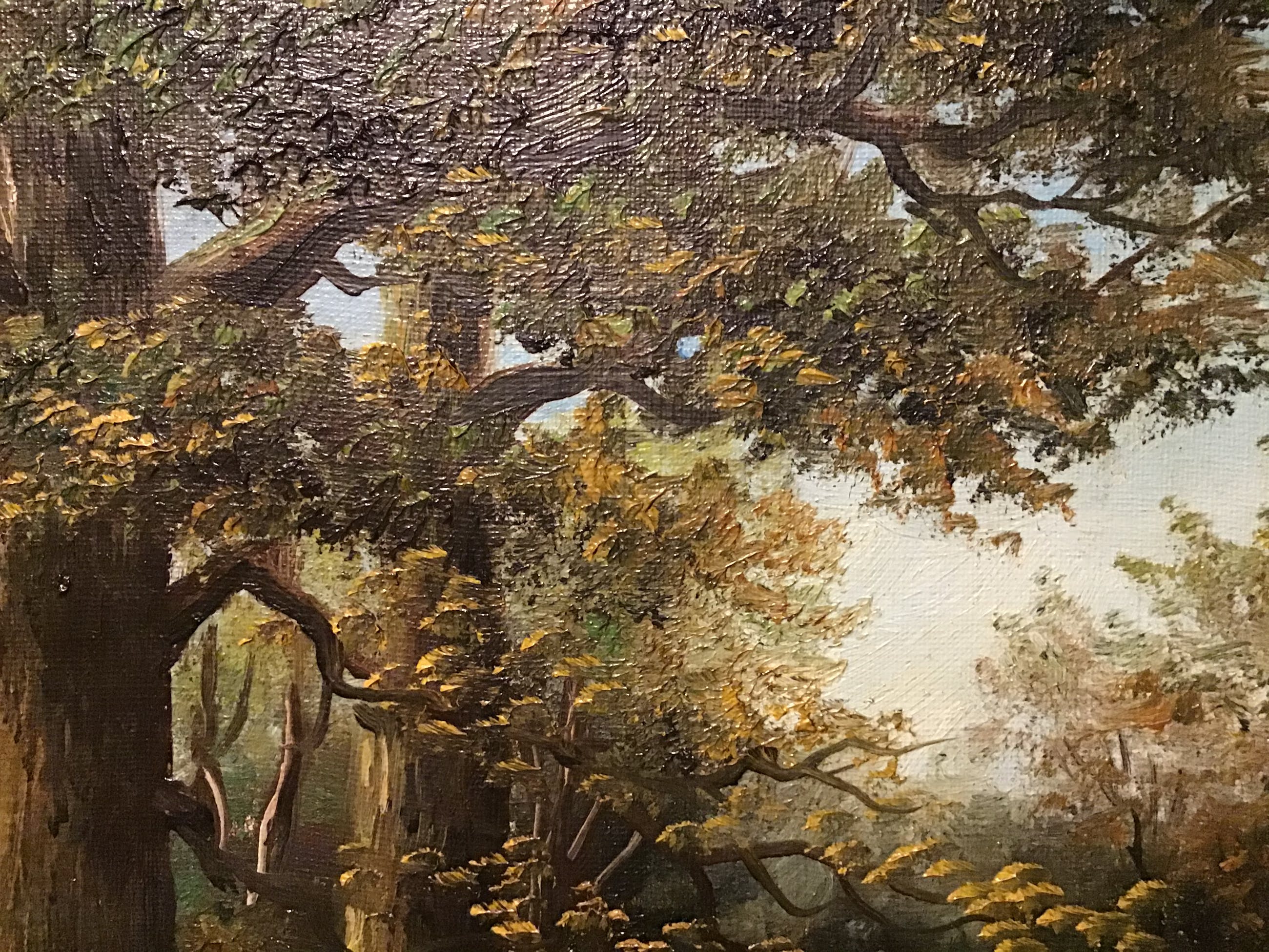 Olieverf op doek op paneel gelijmd. Erg mooie bomen in een bos met een riviertje. Enkel gesigneerd met de initialen HR.
