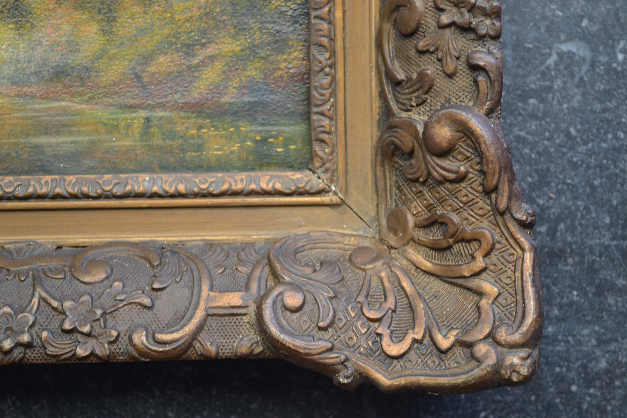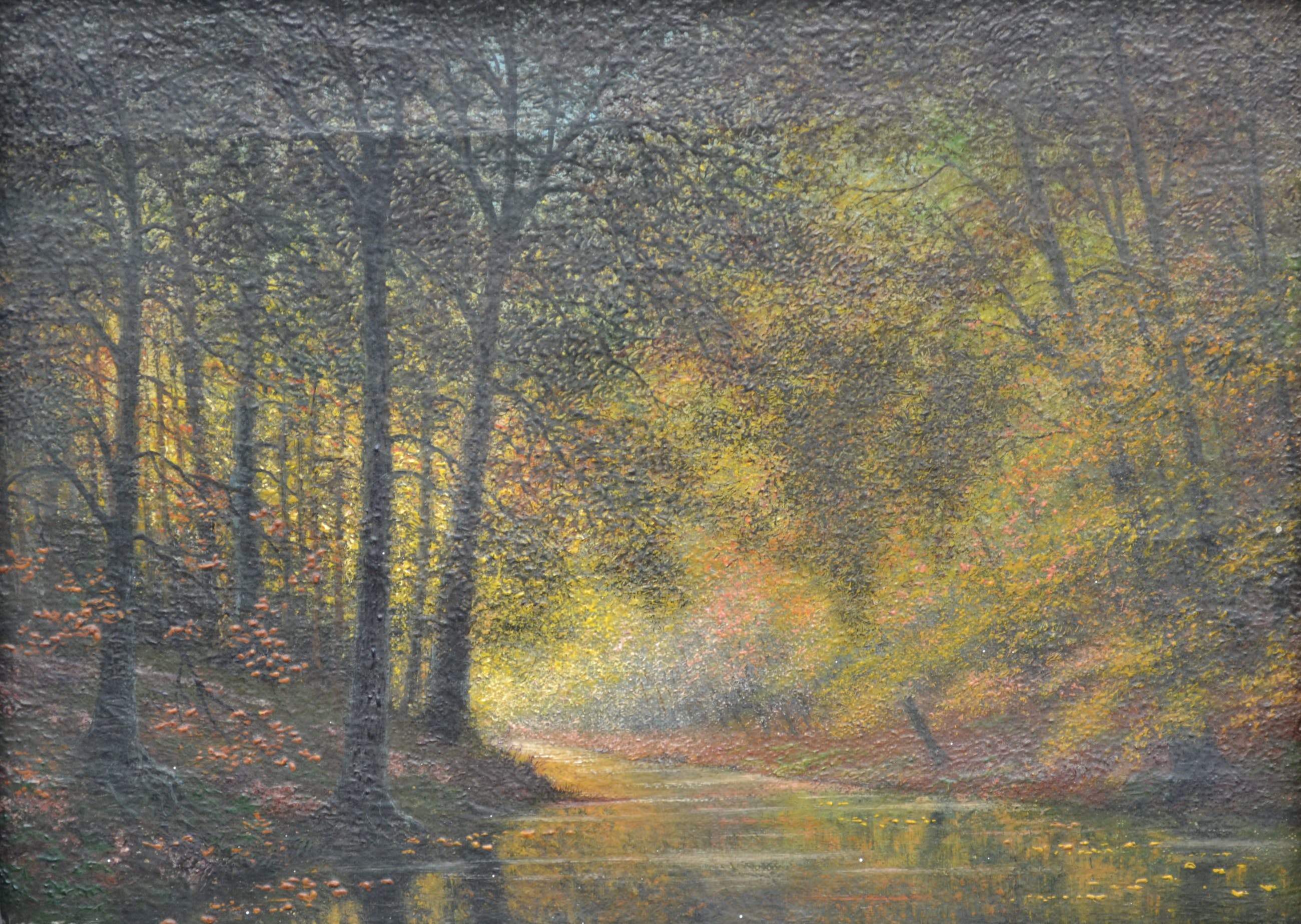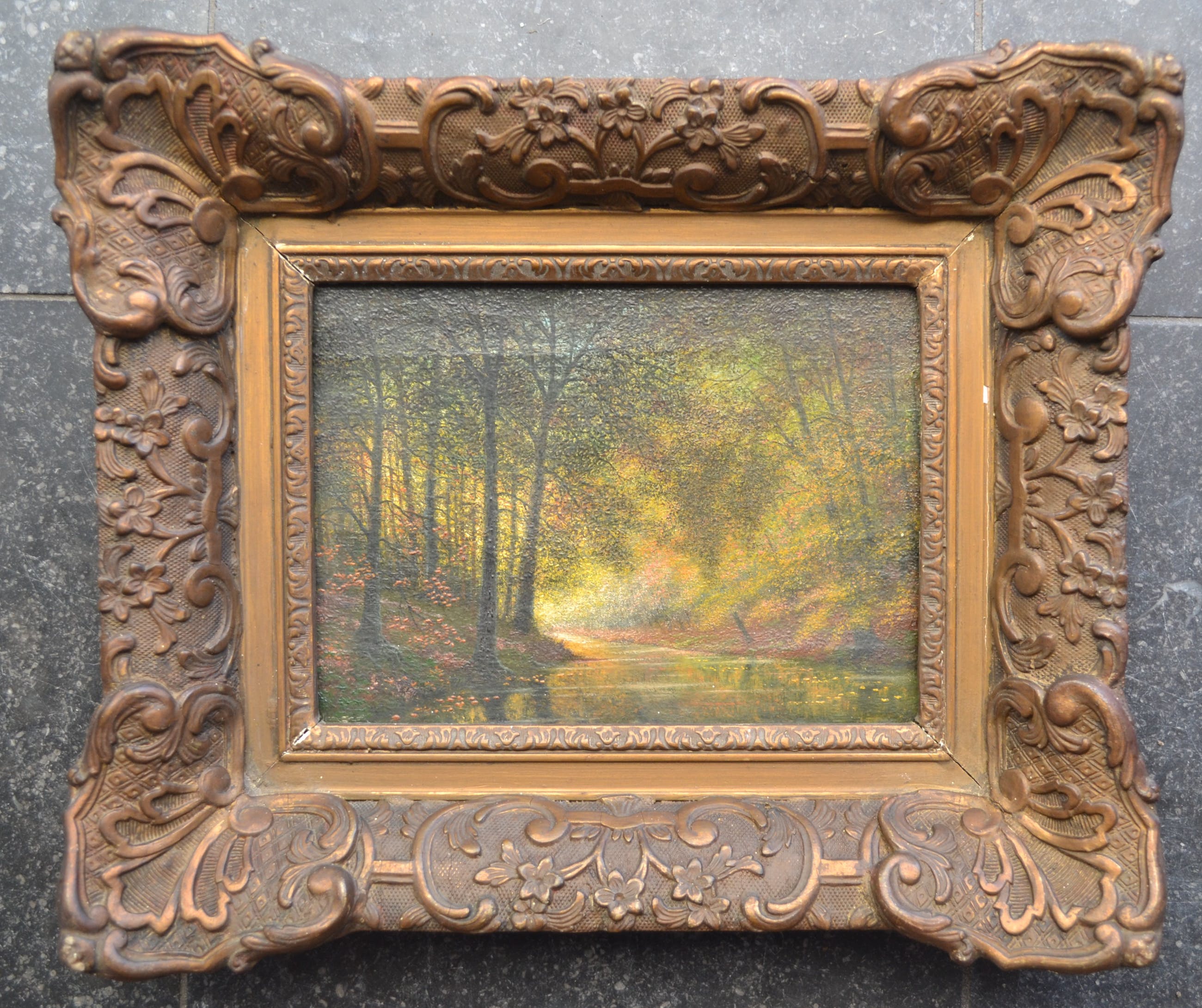 Sfeervol werkje van een boslandschap met rivier. Olieverf op doek en voorzien van fraaie barokke lijst (heeft wel enkele kleine beschadigingen). Linksonder gesigneerd maar niet goed leesbaar.