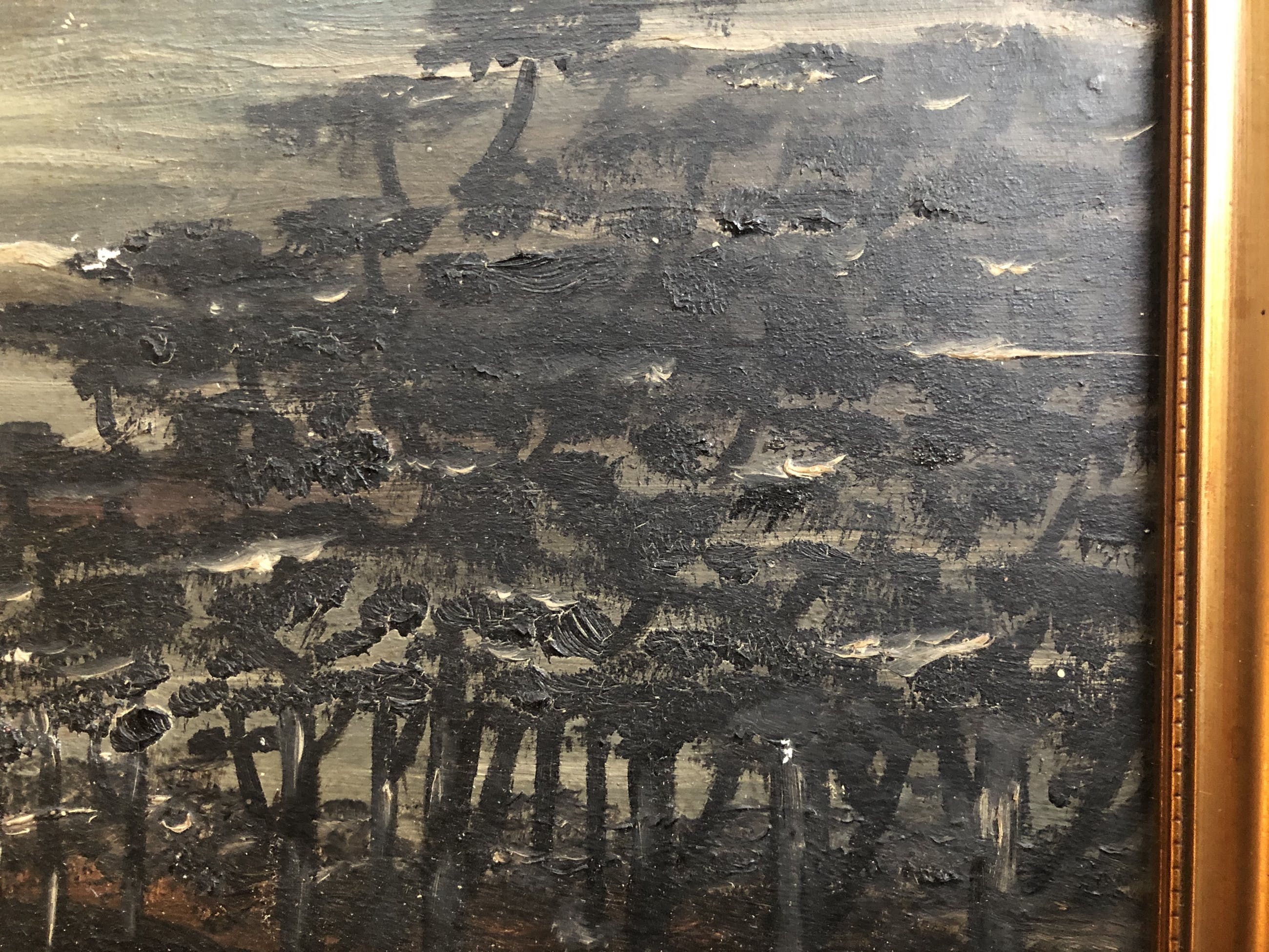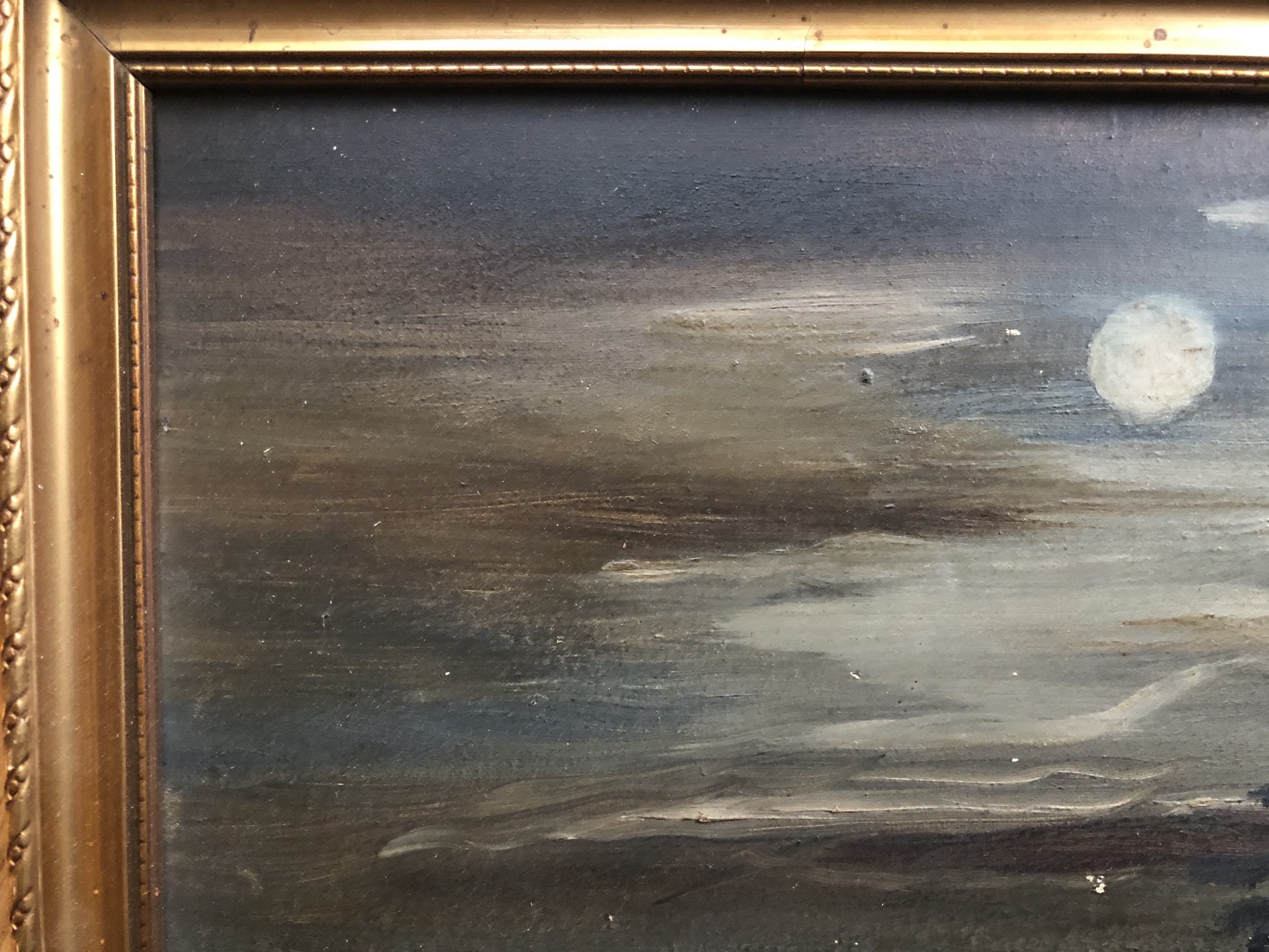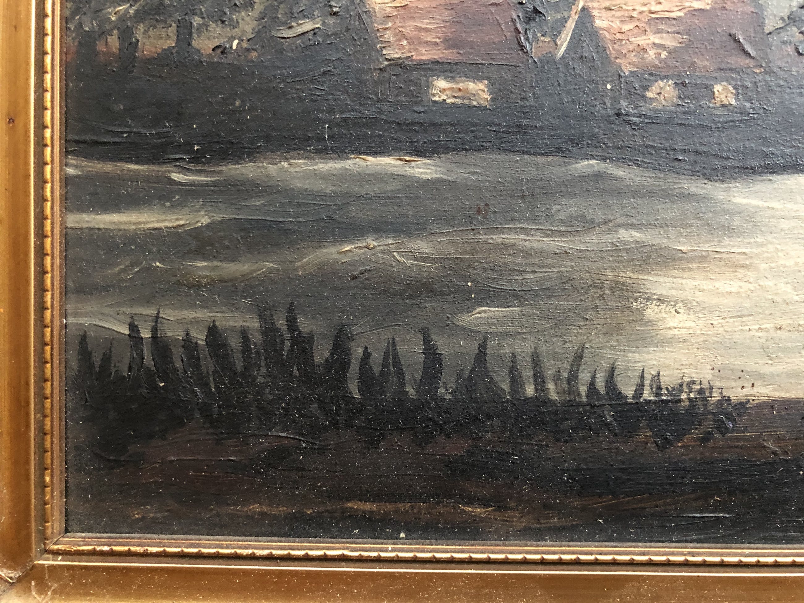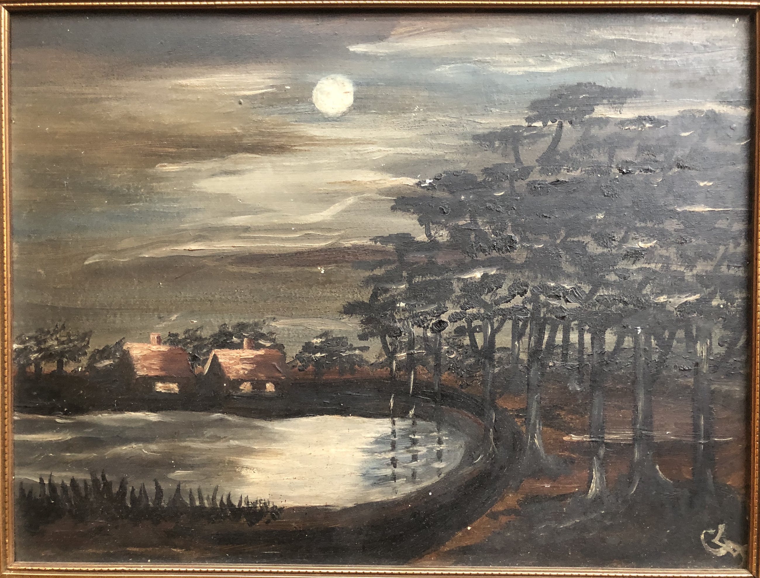 Olieverf schilderij op houten paneel. Woningen aan het water in een bosrijke setting. Nogal donkere kleuren, want bij nacht, de maan is zichtbaar.