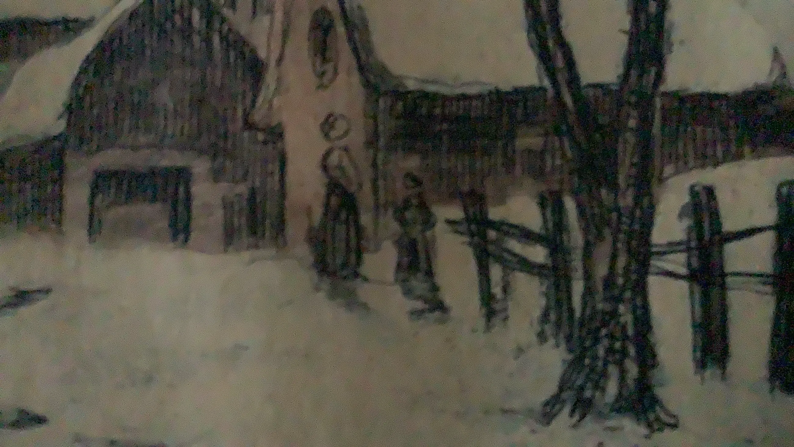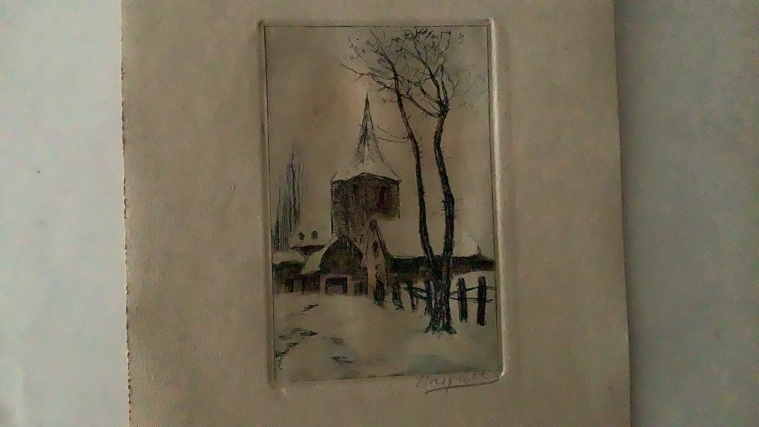 Een kleuren ets van een kerkje in sneeuw landschap.