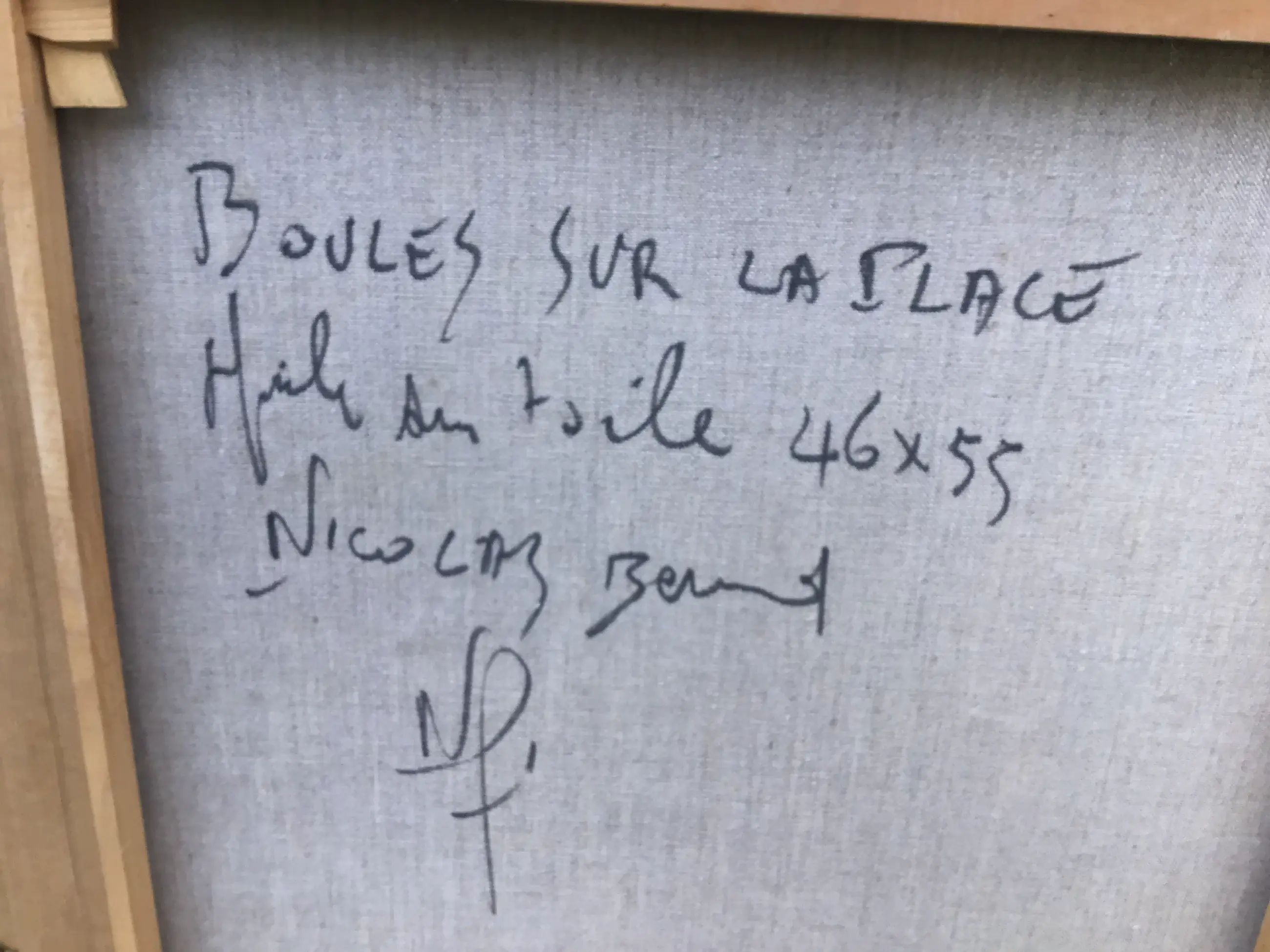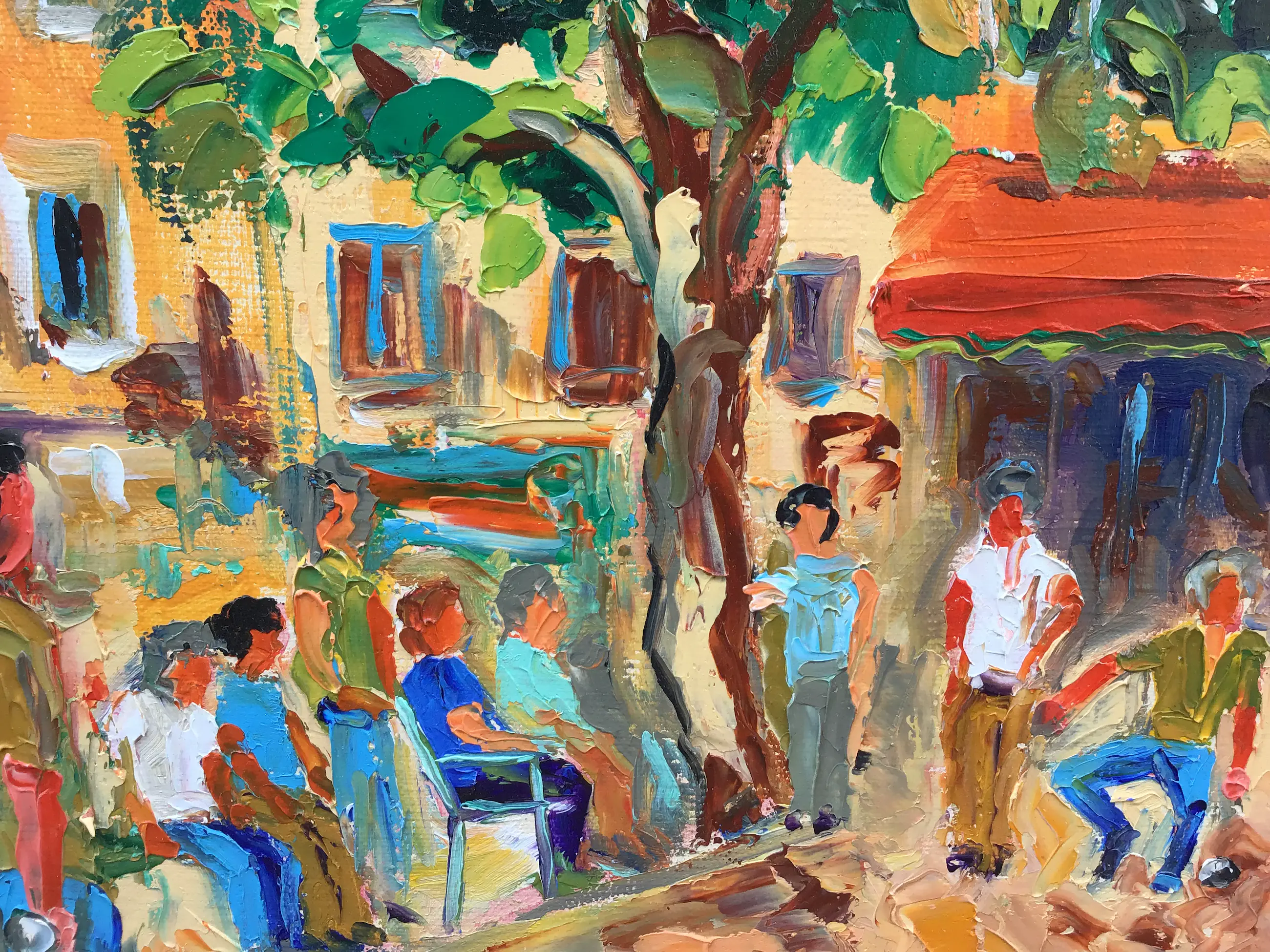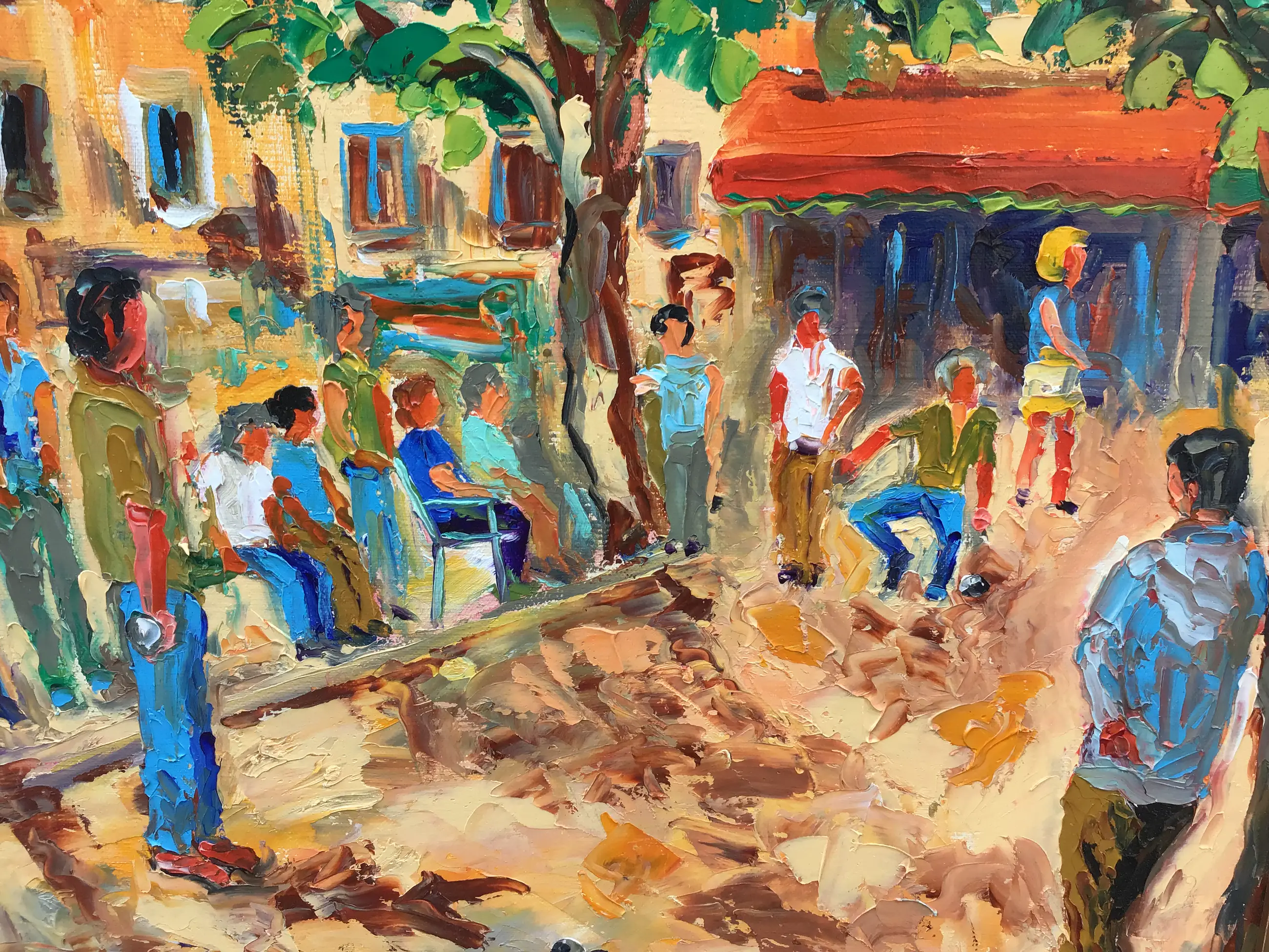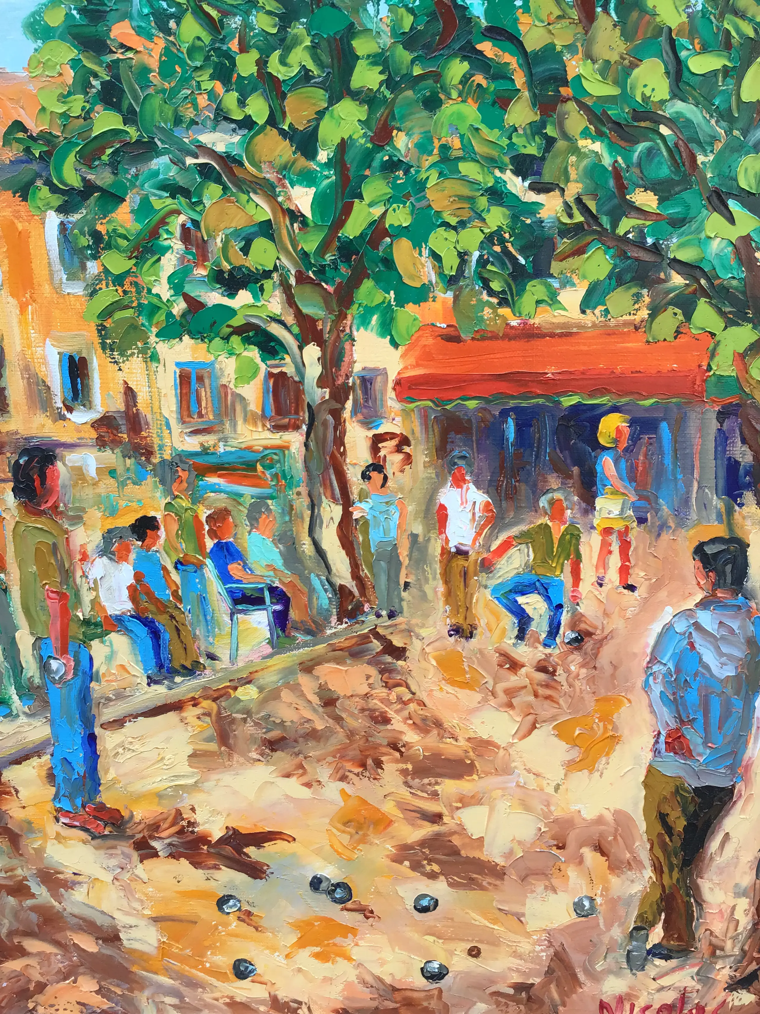 Franse school 20e eeuw. Vrolijk tafereel in een Frans dorpje. In felle vrolijke kleuren. Met paletmes opgezet, dik in de verf. Op de achterkant nogmaals gesigneerd samen met de titel.