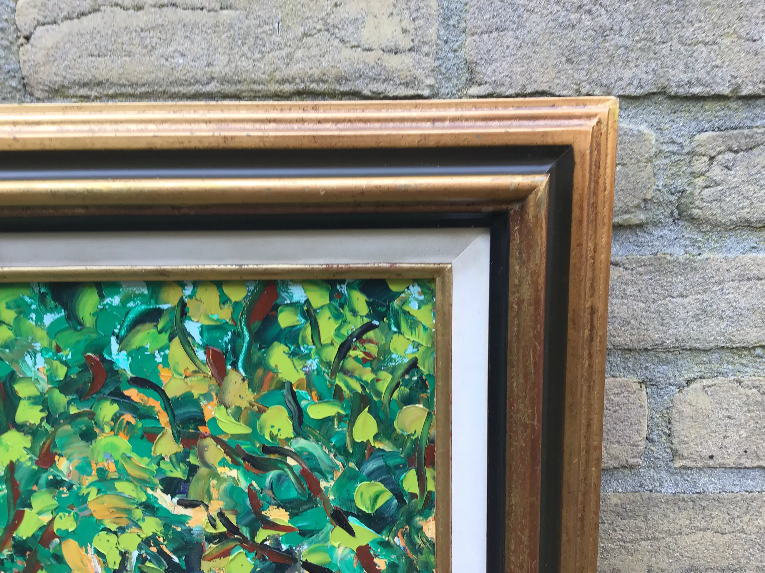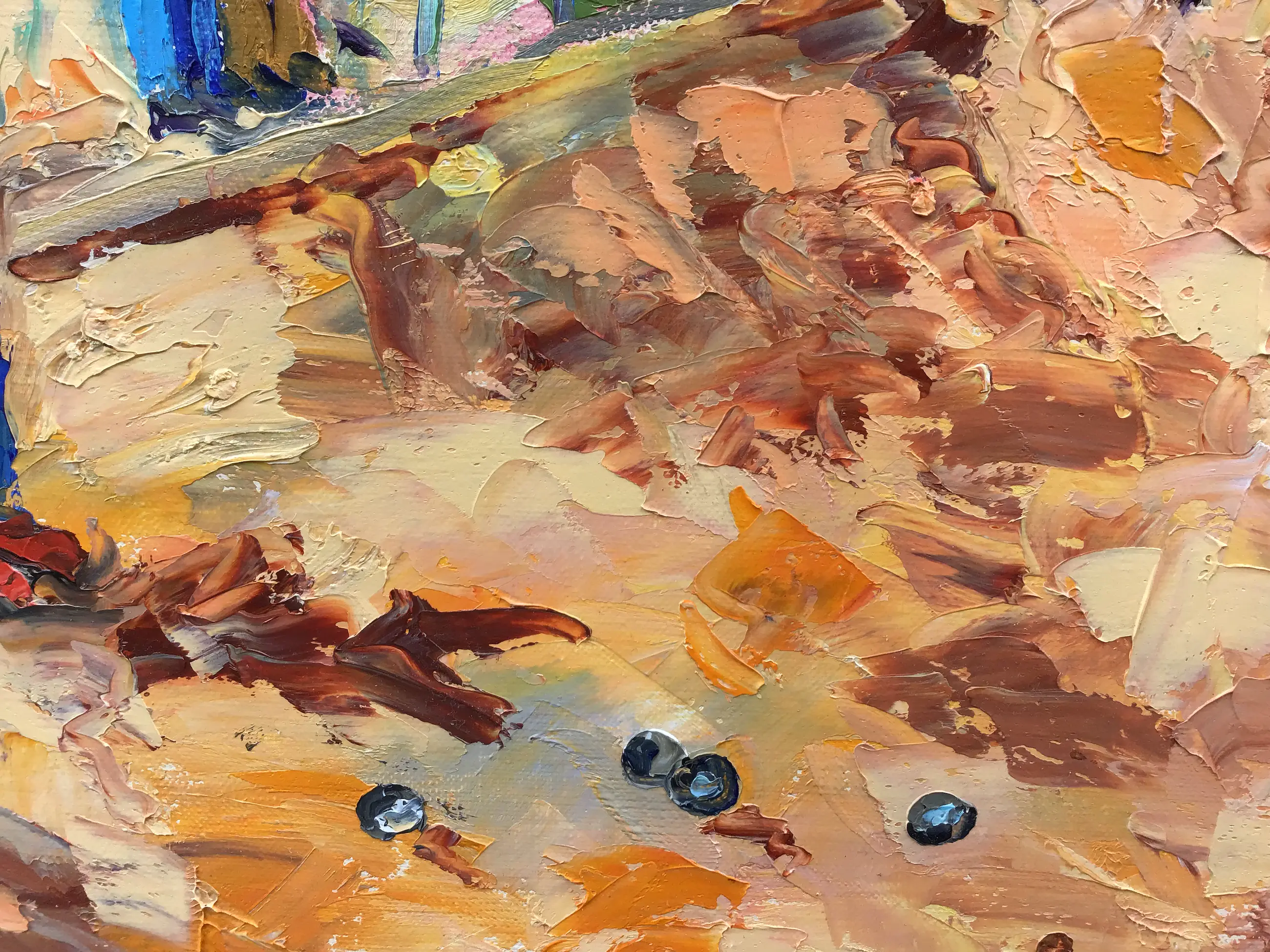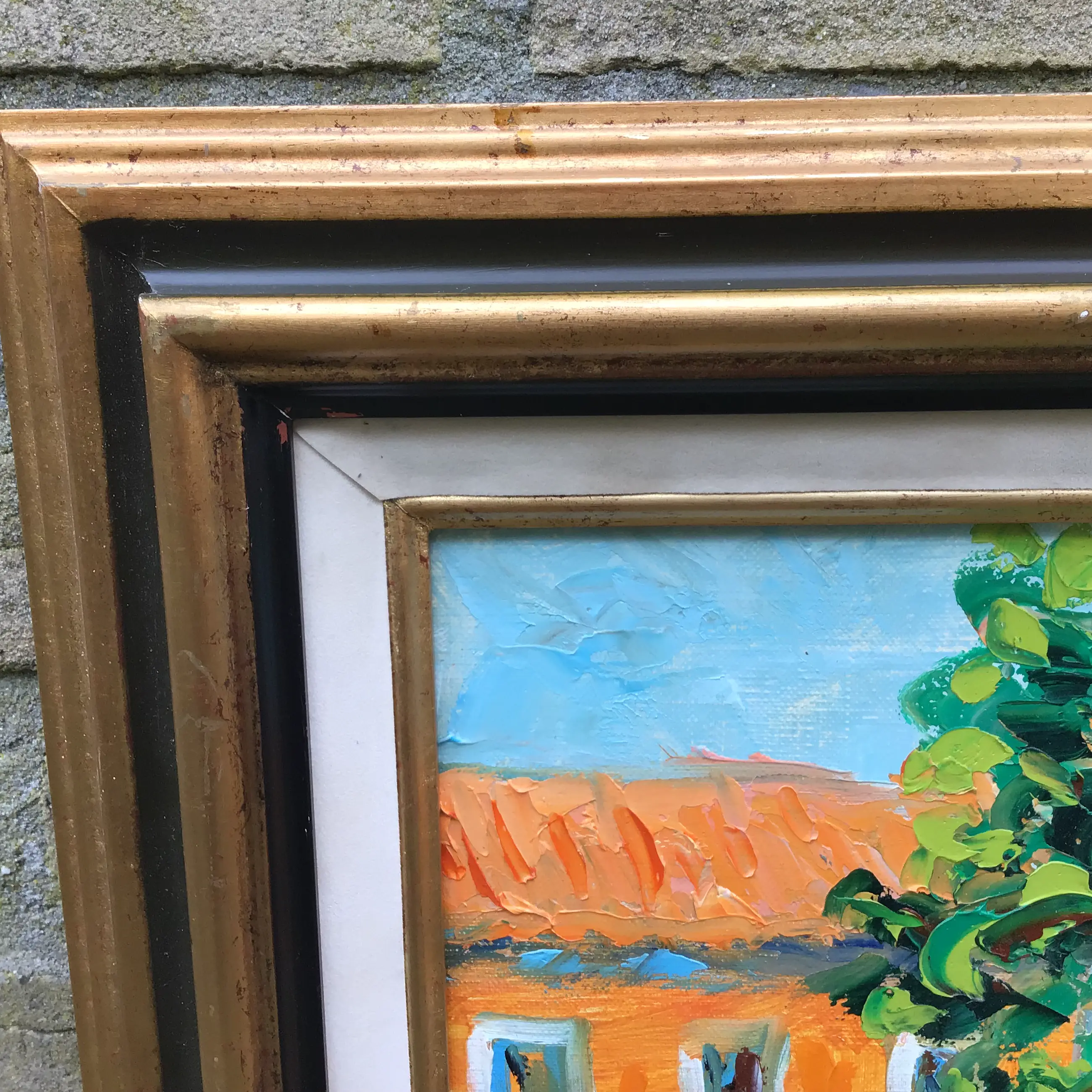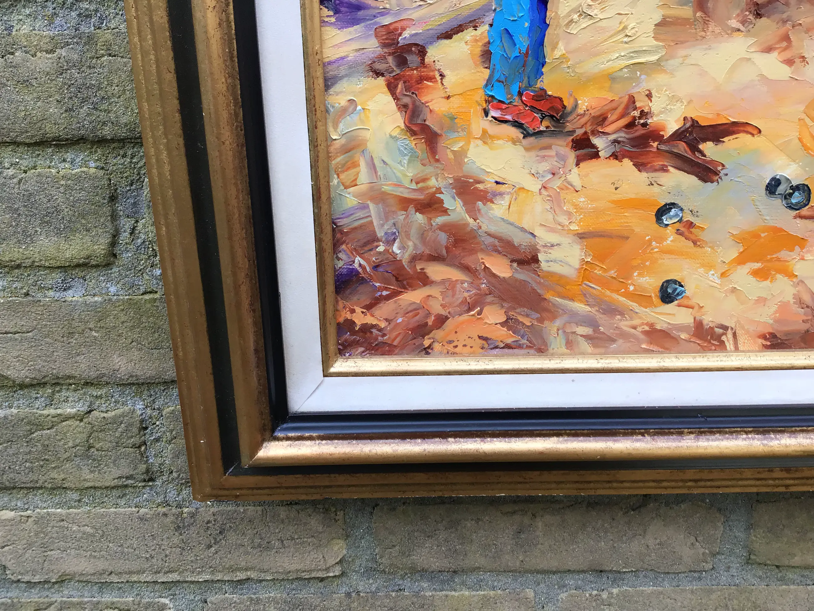 Franse school 20e eeuw. Vrolijk tafereel in een Frans dorpje. In felle vrolijke kleuren. Met paletmes opgezet, dik in de verf. Op de achterkant nogmaals gesigneerd samen met de titel.