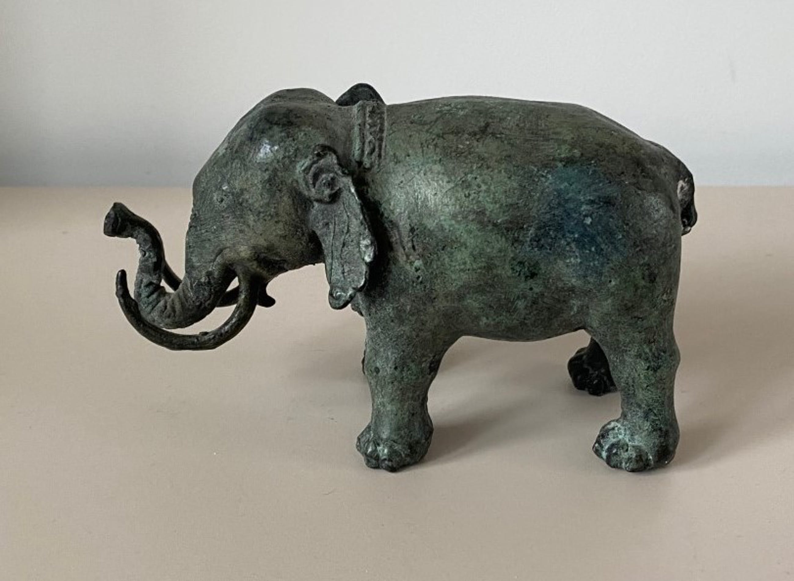 Bronzen beeld van een Indische Olifant, niet gesigneerd. Heeft helaas wat witte roest en gaatje bovenop het beeldje.