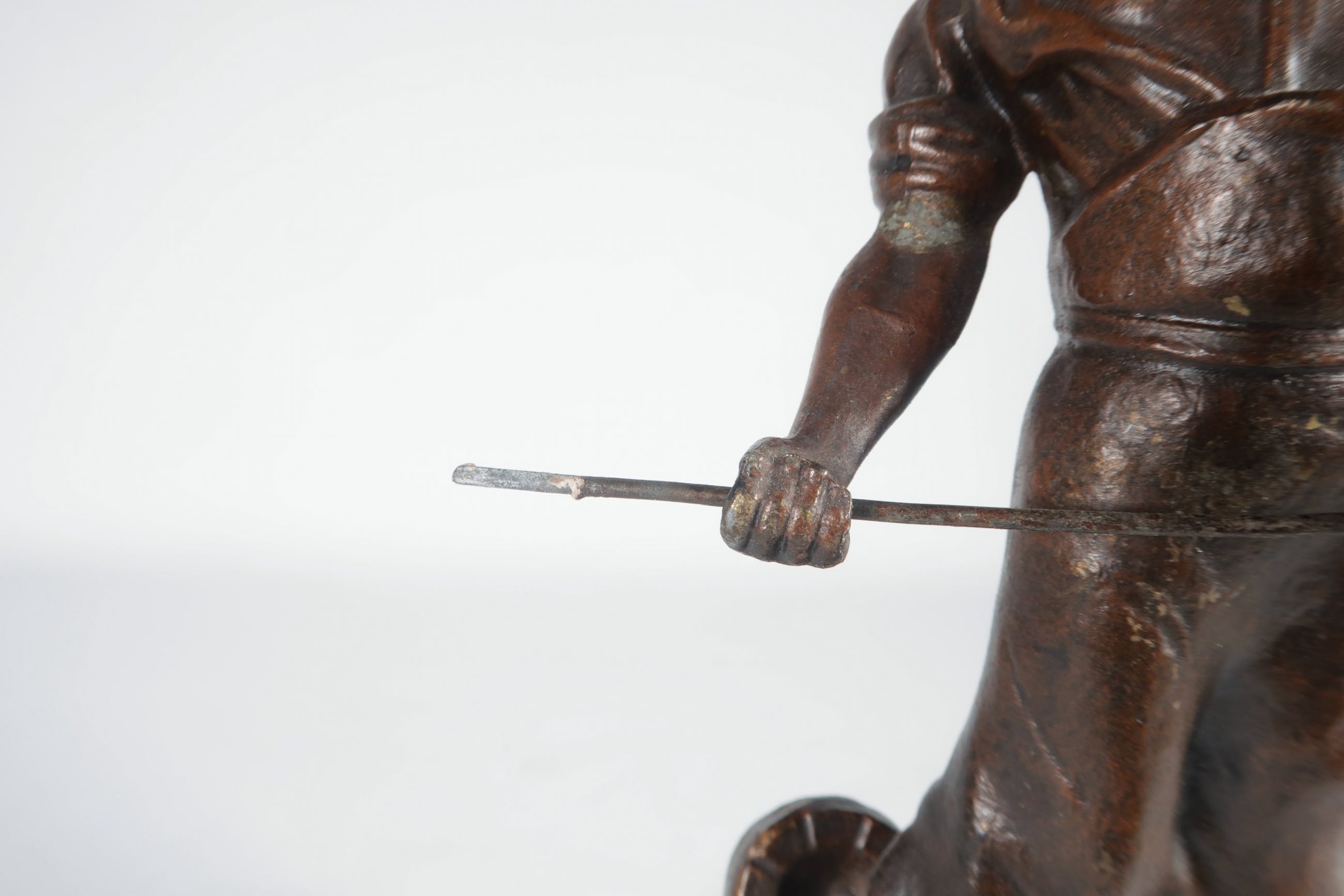 | Breuklijn/zichtbare reparatie in rechterarm boven elleboog en hamer ontbreekt | |||