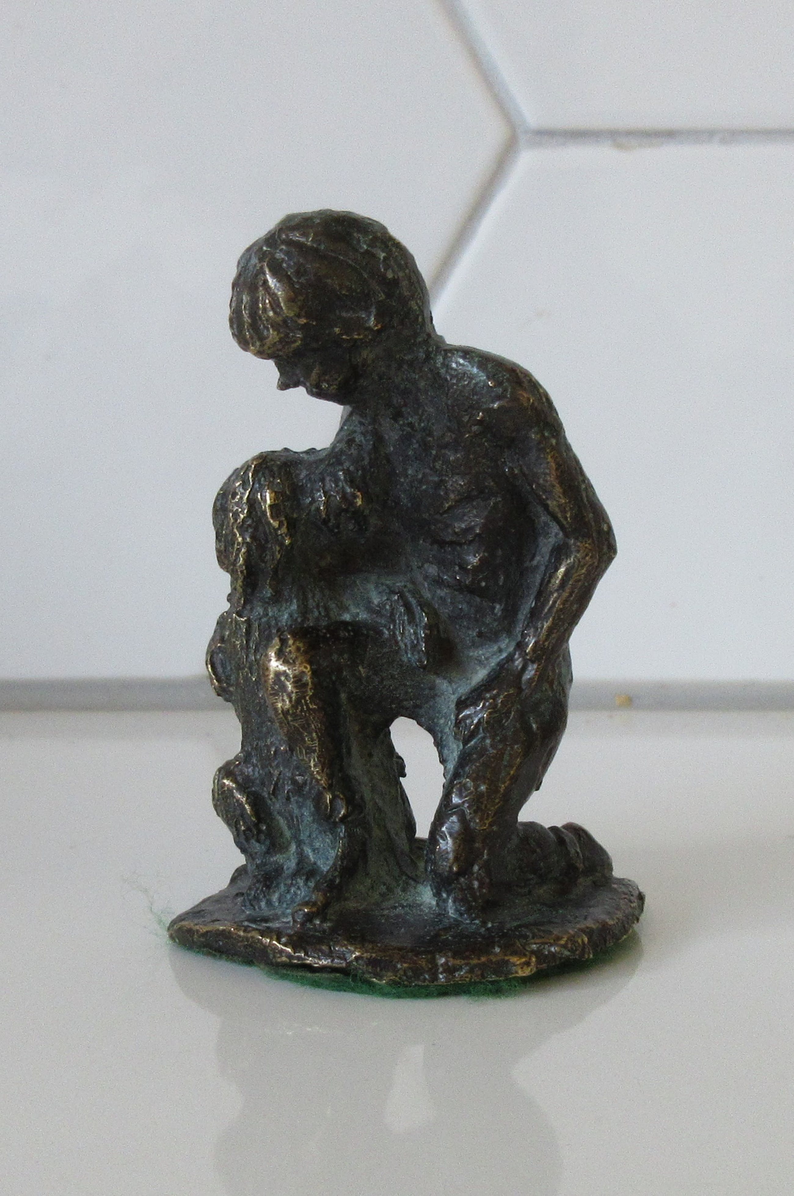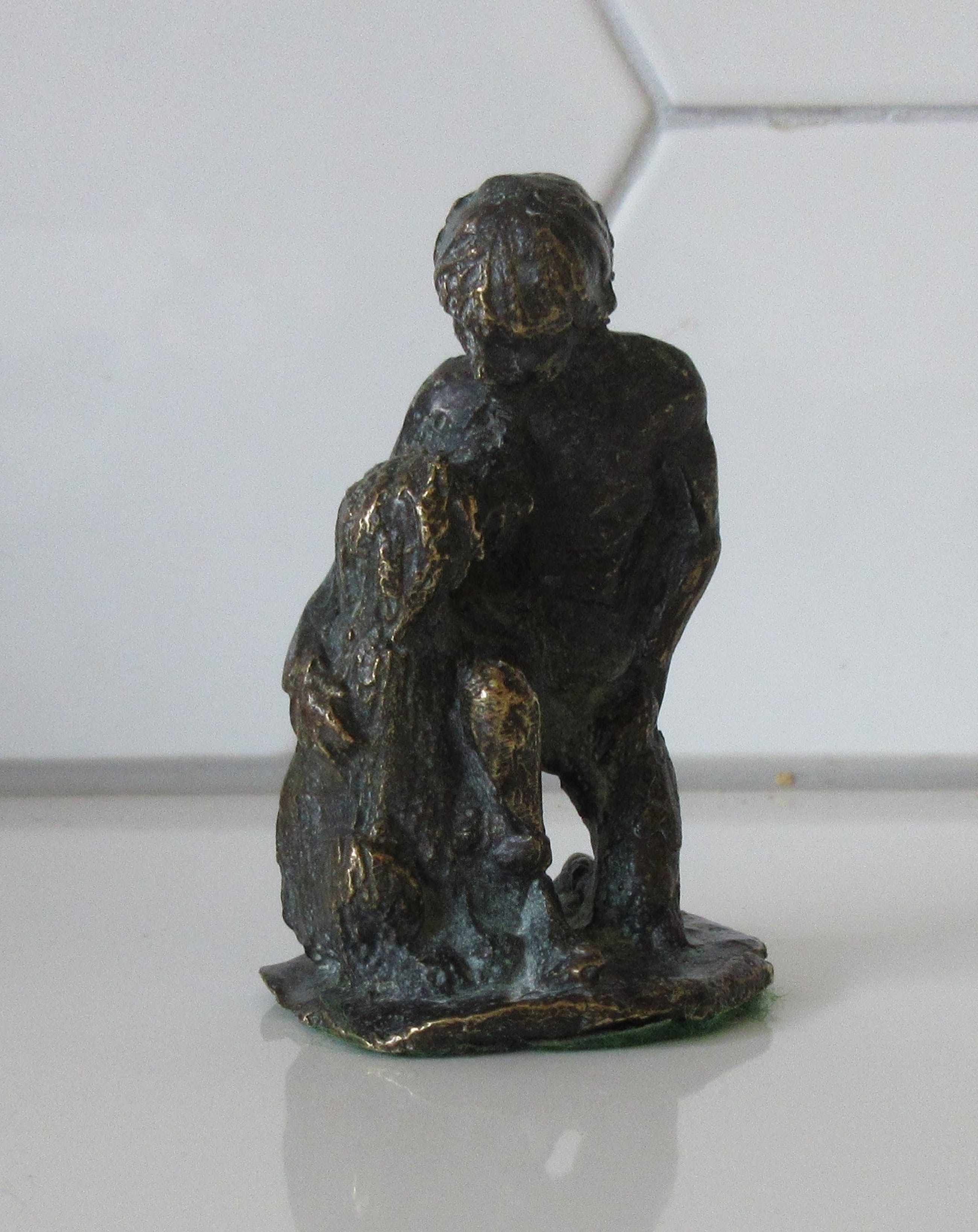 Bronzen beeldje van een jongemanen zijn hond. Klein van stuk maar mooi in detail. Niet voorzien van monogram of merk. Maker of kunstenaar dus onbekend.