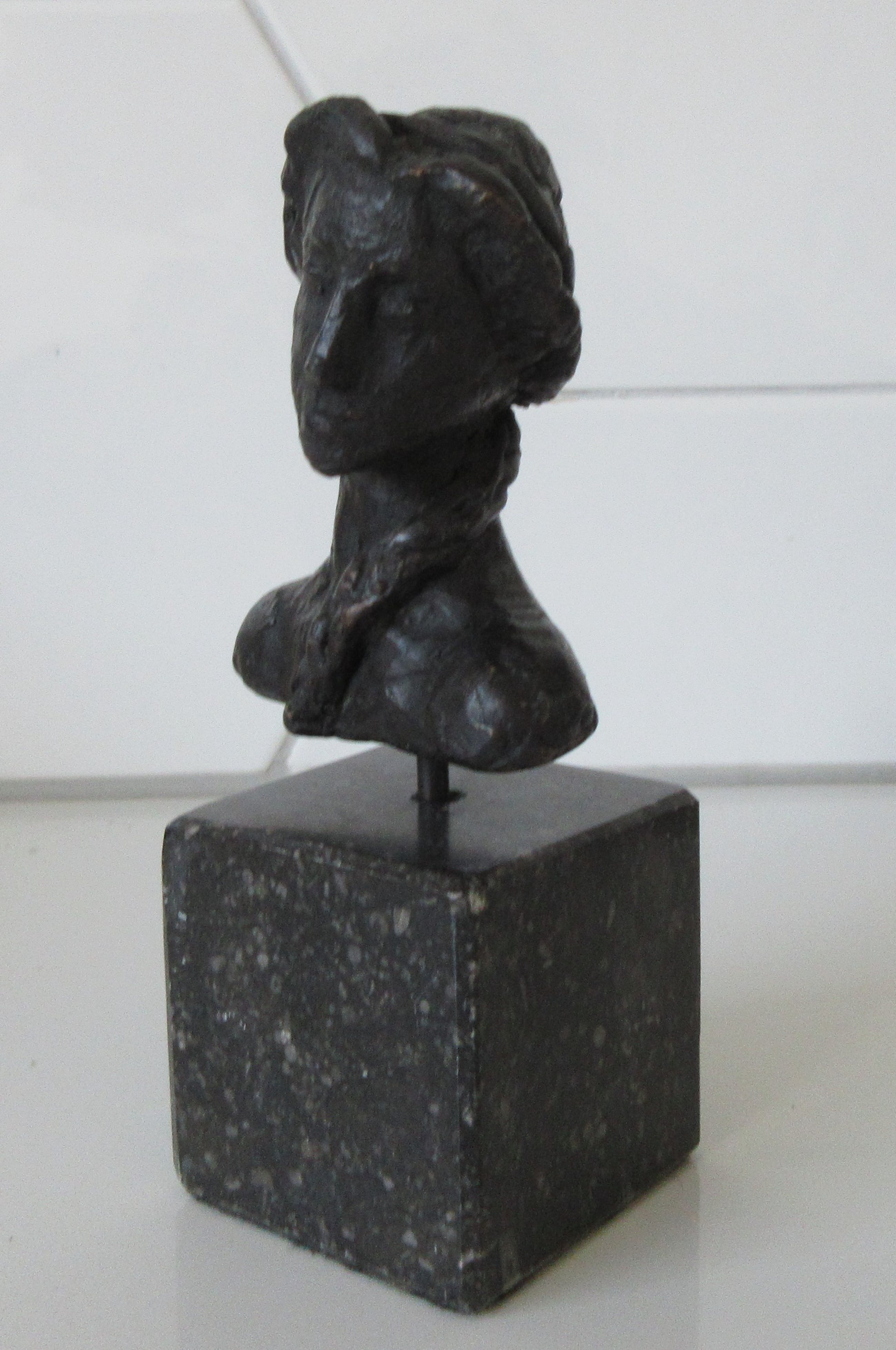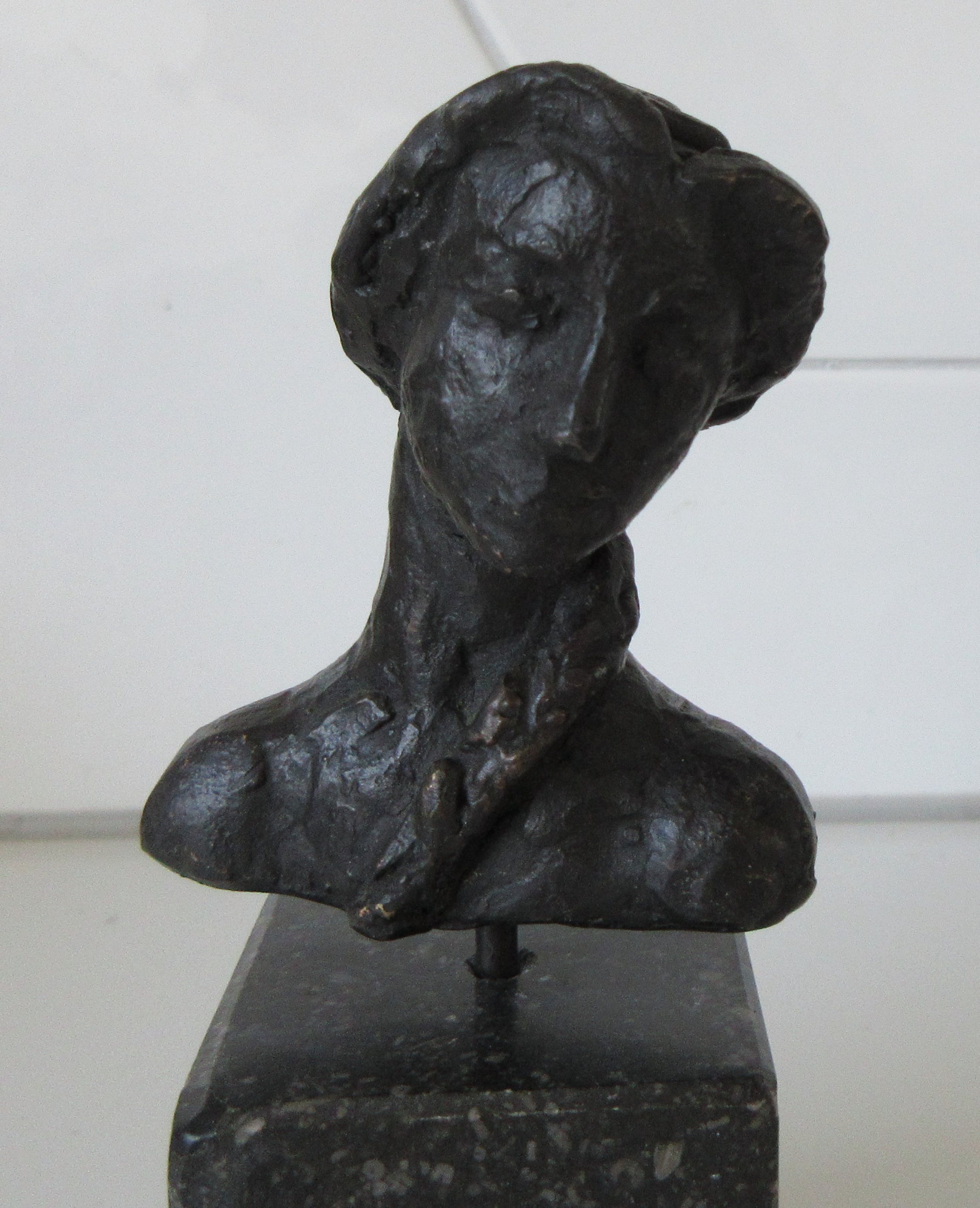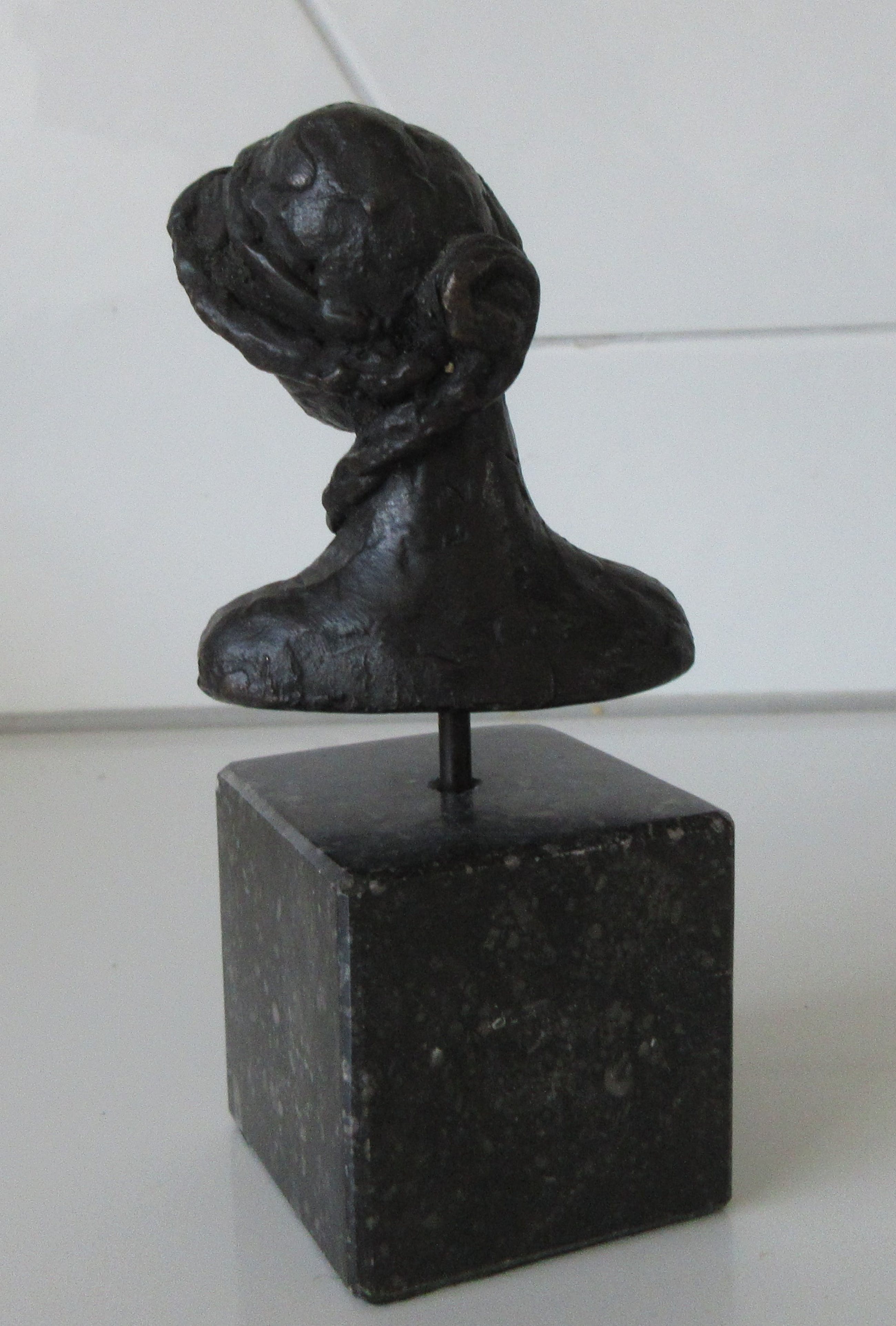 Bronzen Buste van een vrouw met paardenstaart op sokkel. Maker onbekend want niet voorzien van monogram of merk. De sokkel heeft patina en wat kleine butsjes.