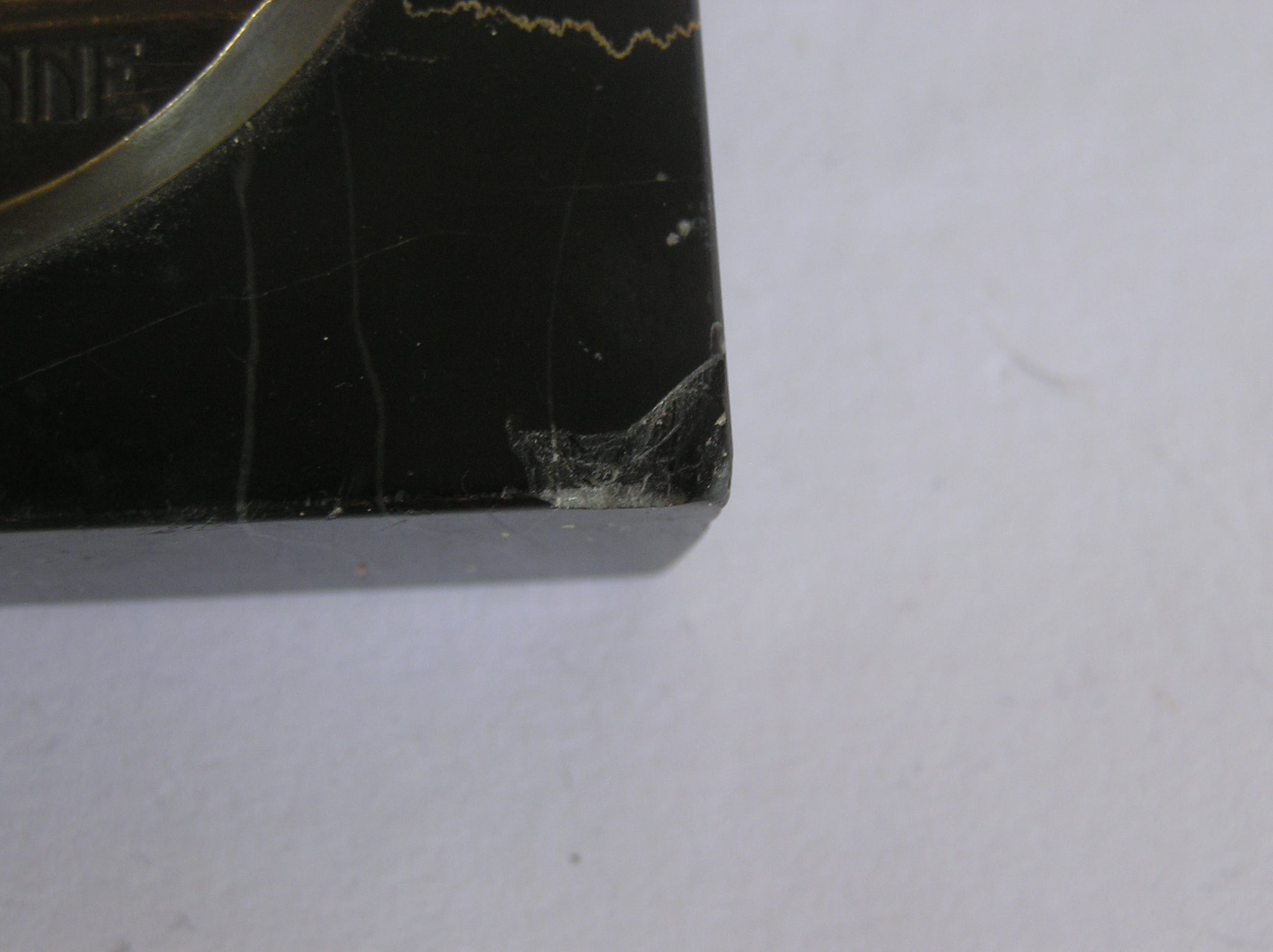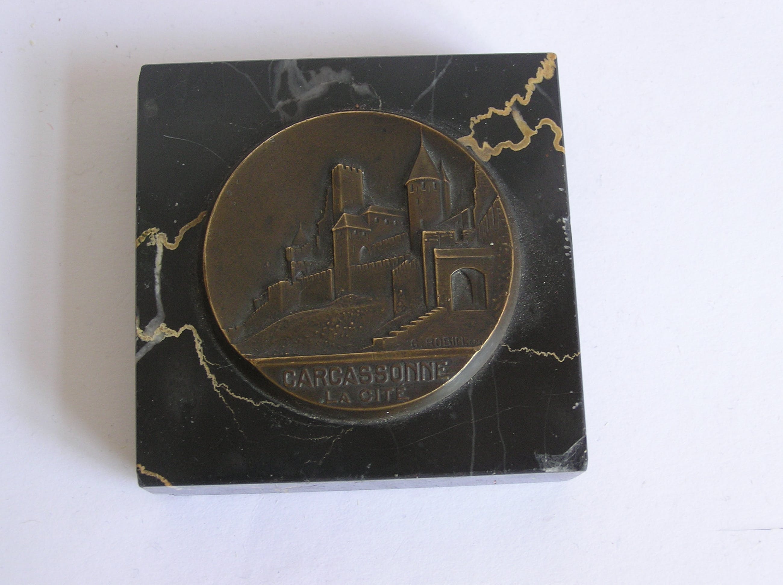 Bronzen medaille op marmeren voet - afbeelding van Carcassonne La Cité, gesigneerd G. Robin. In goede conditie, de zwart marmeren voet heeft wel kleine beschadigingen.