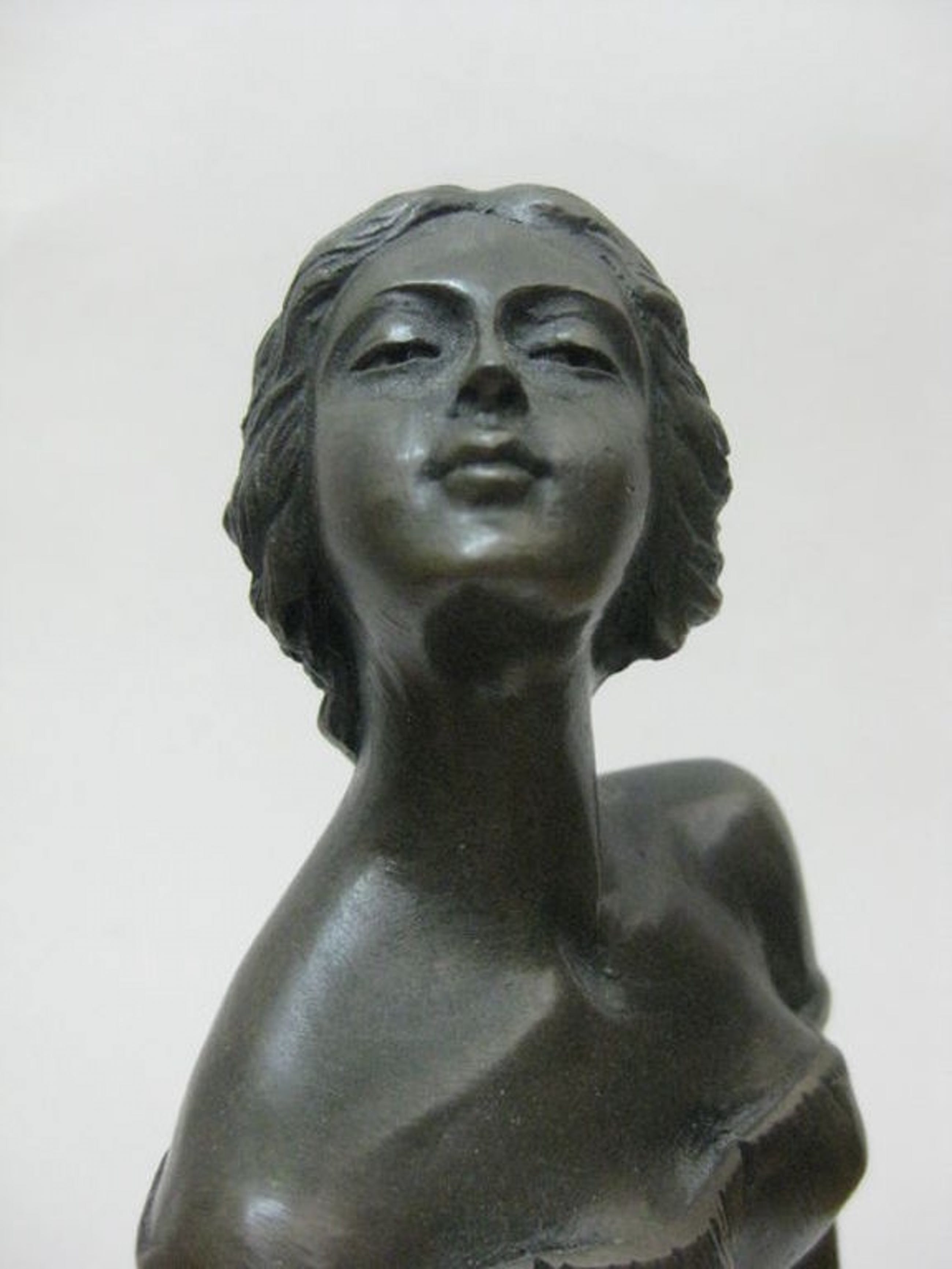 Een prachtig bronzen sculptuur van een vrouw op een marmeren voetstuk. Gesigneerd en voorzien van een bronszegel. Afmeting: 37 cm. hoog (met voetstuk). Conditie: zeer goed.