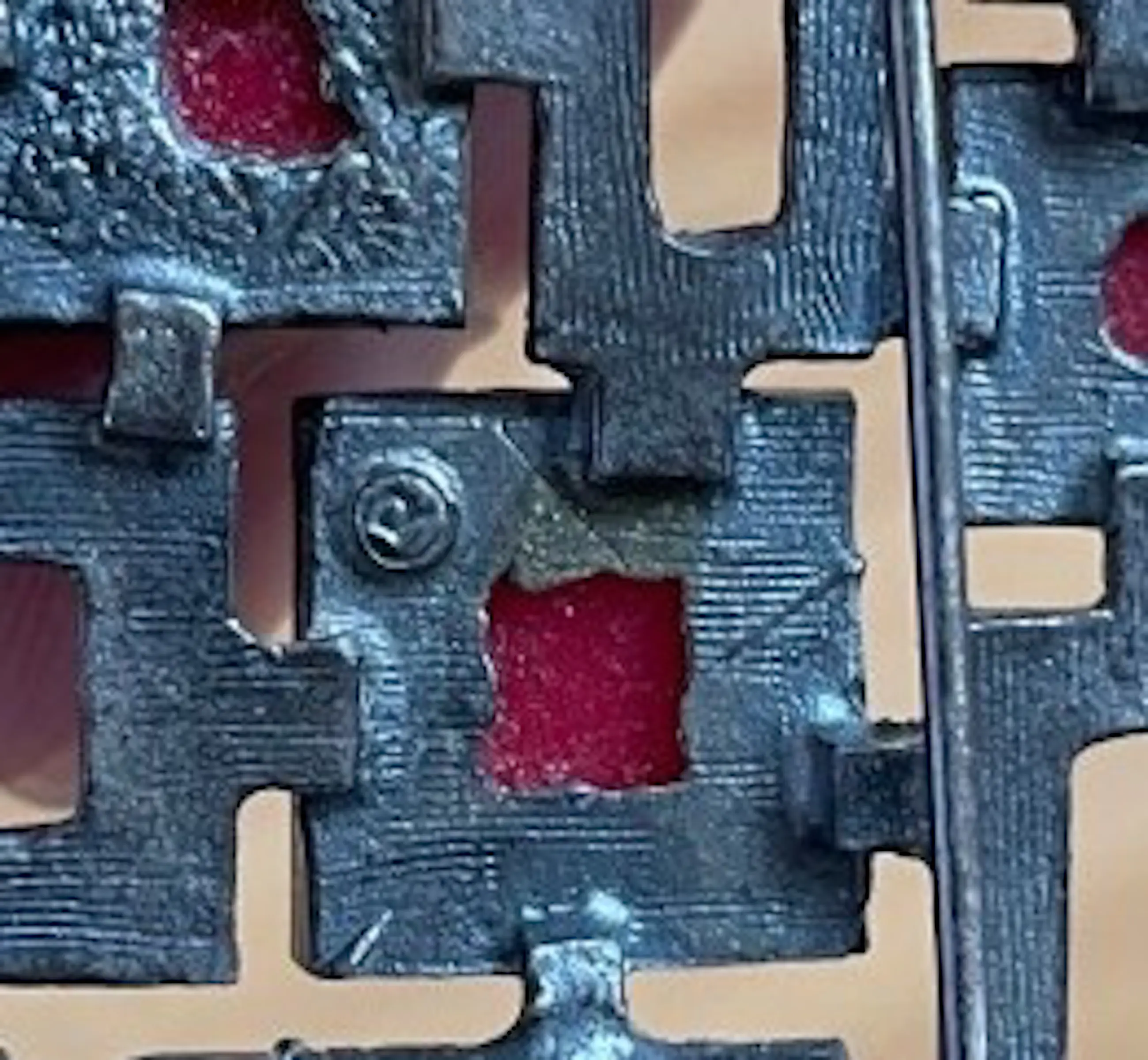 Onbekend - Brutalistische metalen broche voorzien van drie geslepen stuks bloedkoraal - Verkocht