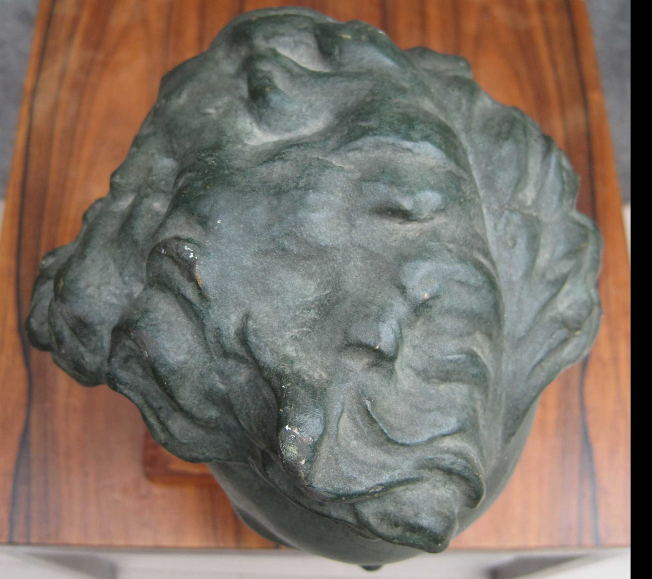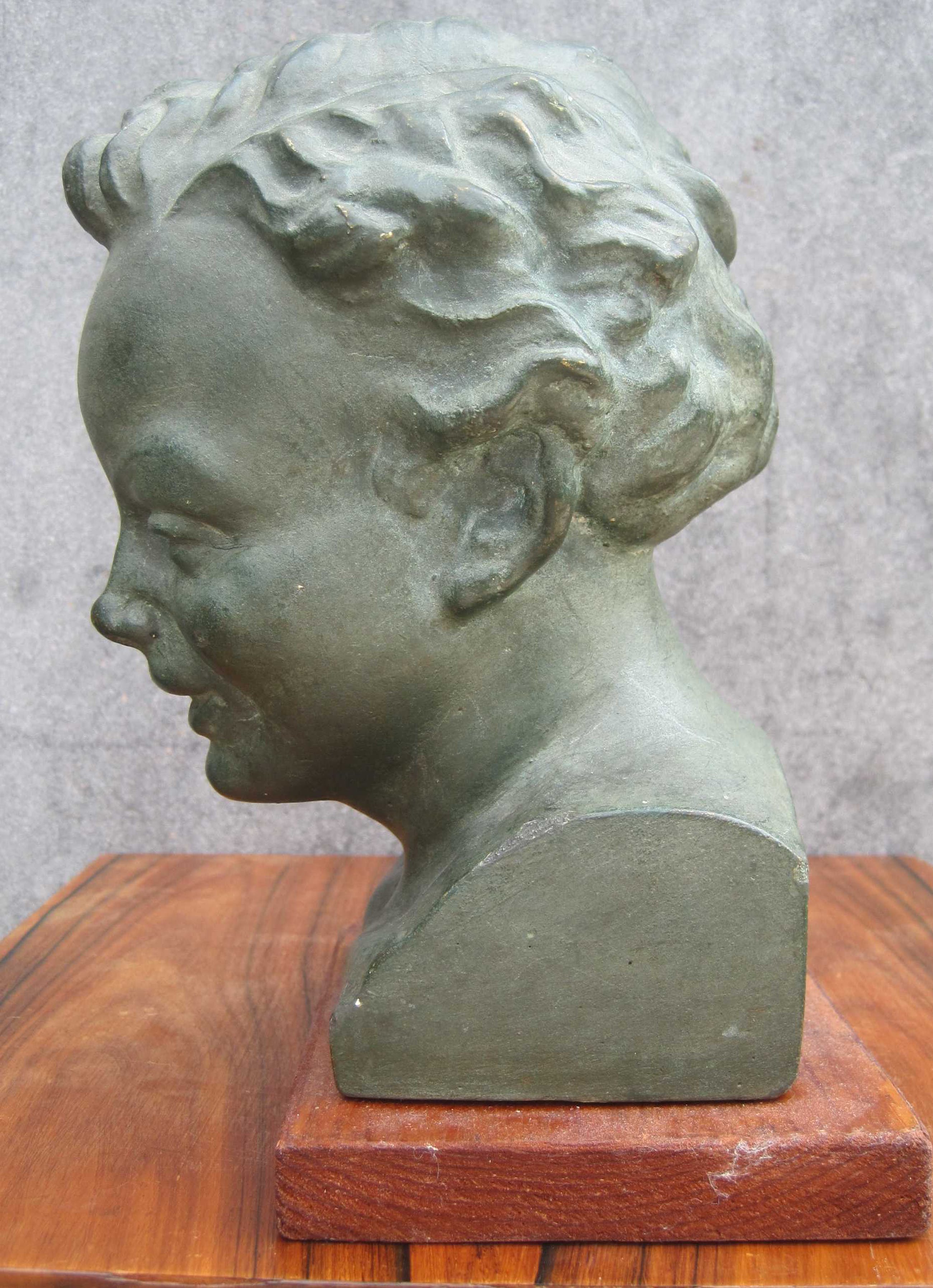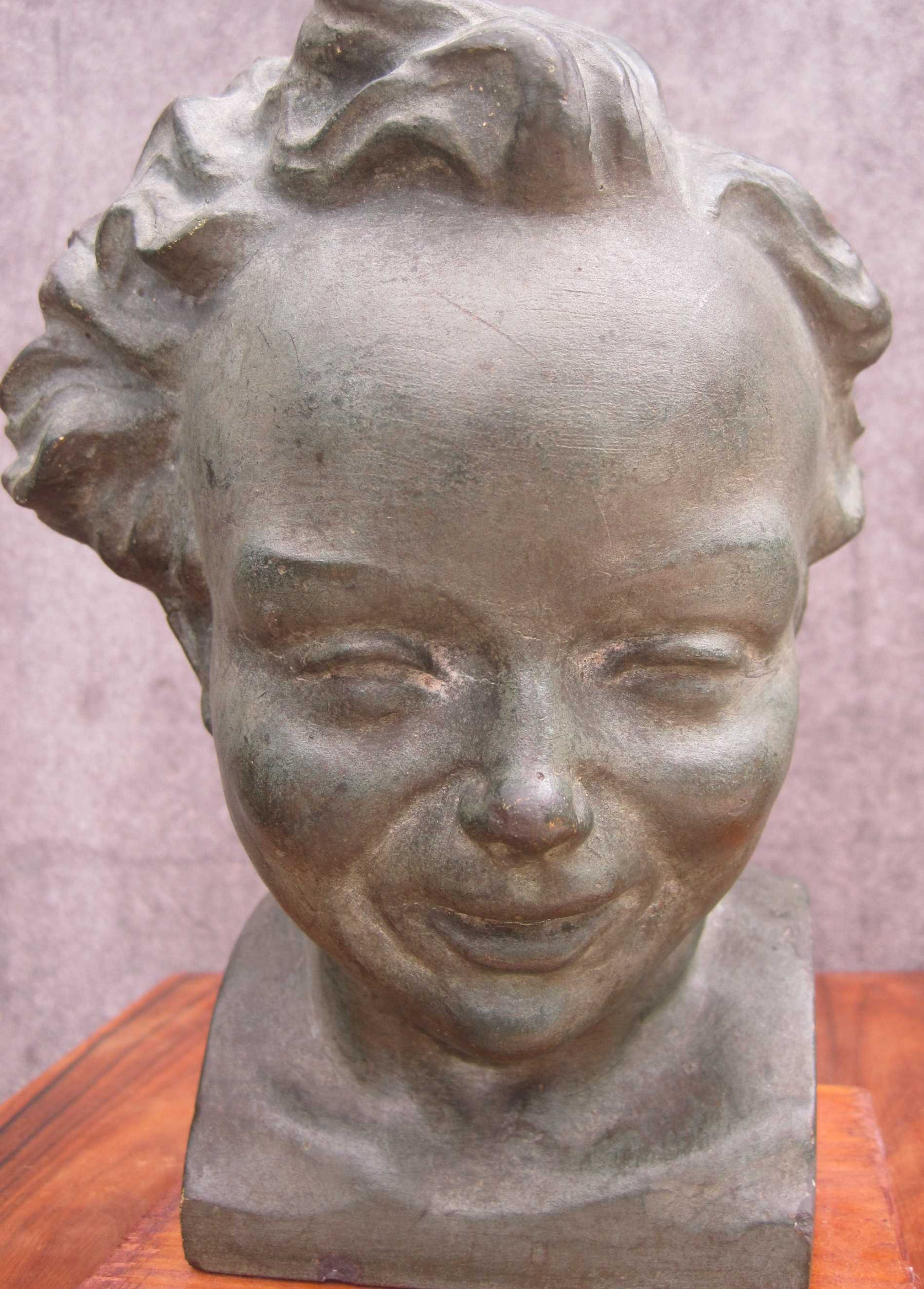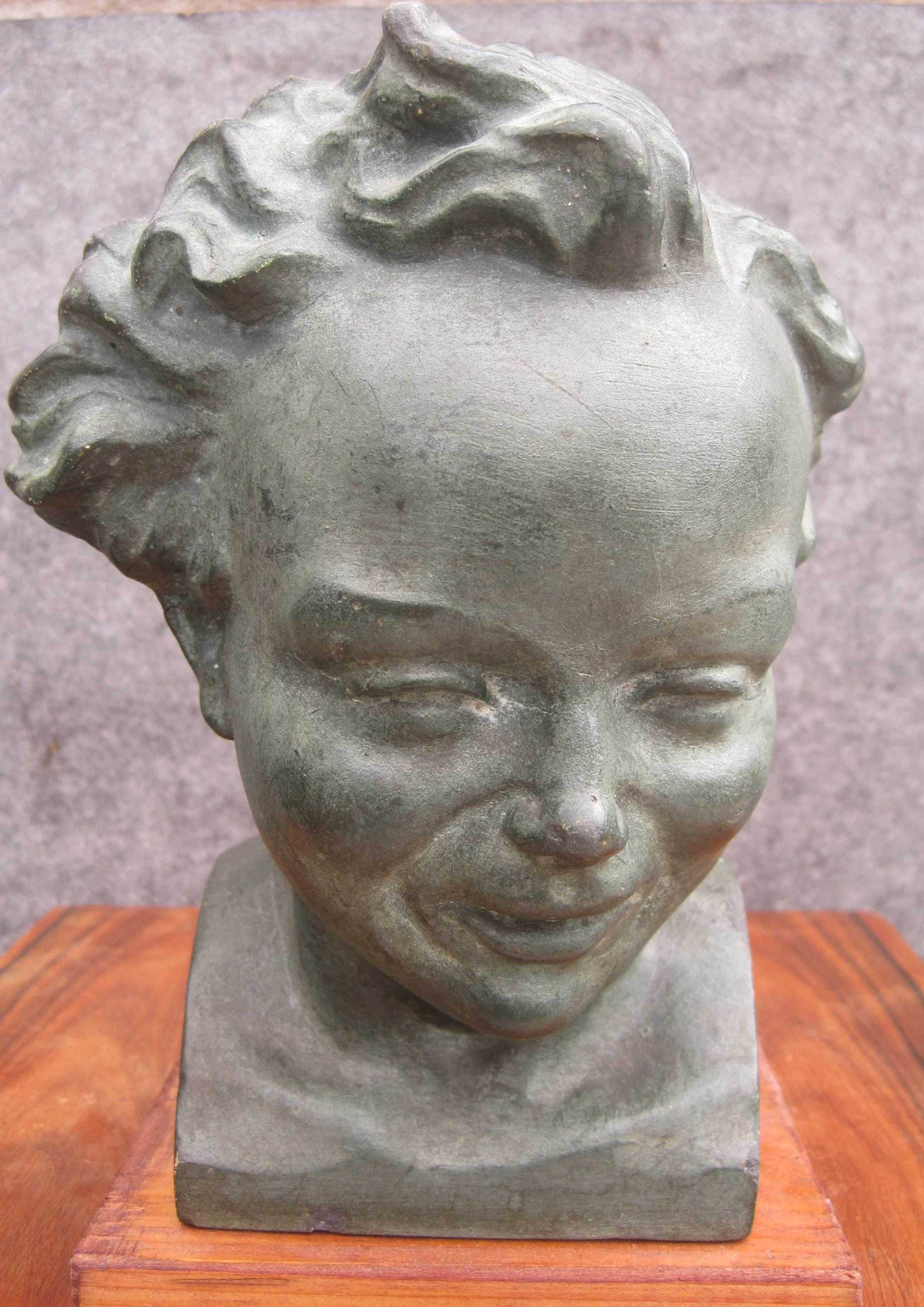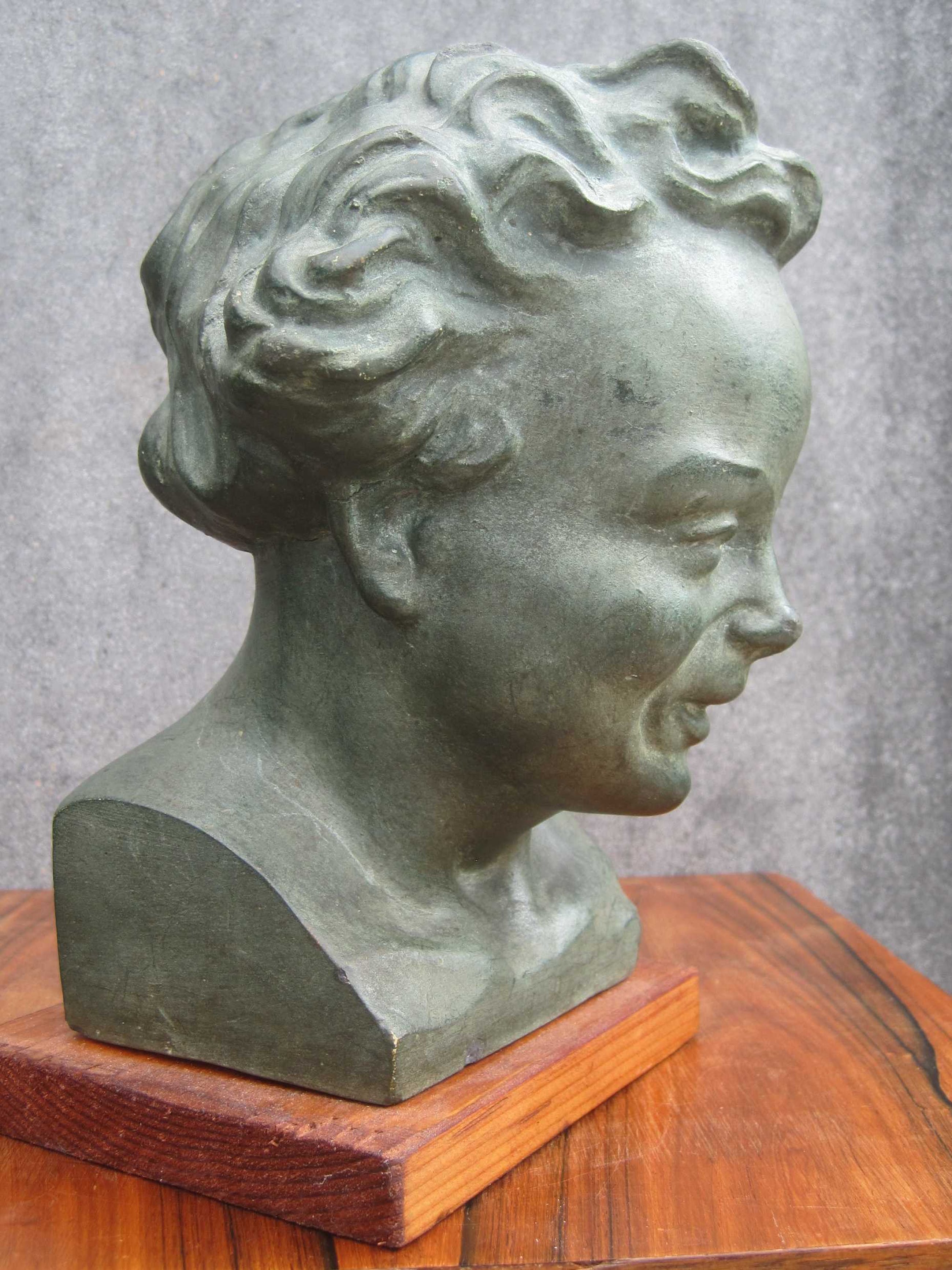 Gipsen beeld van een vrolijke jonge meid. Het beeld is bronsgroen gepatineerd.