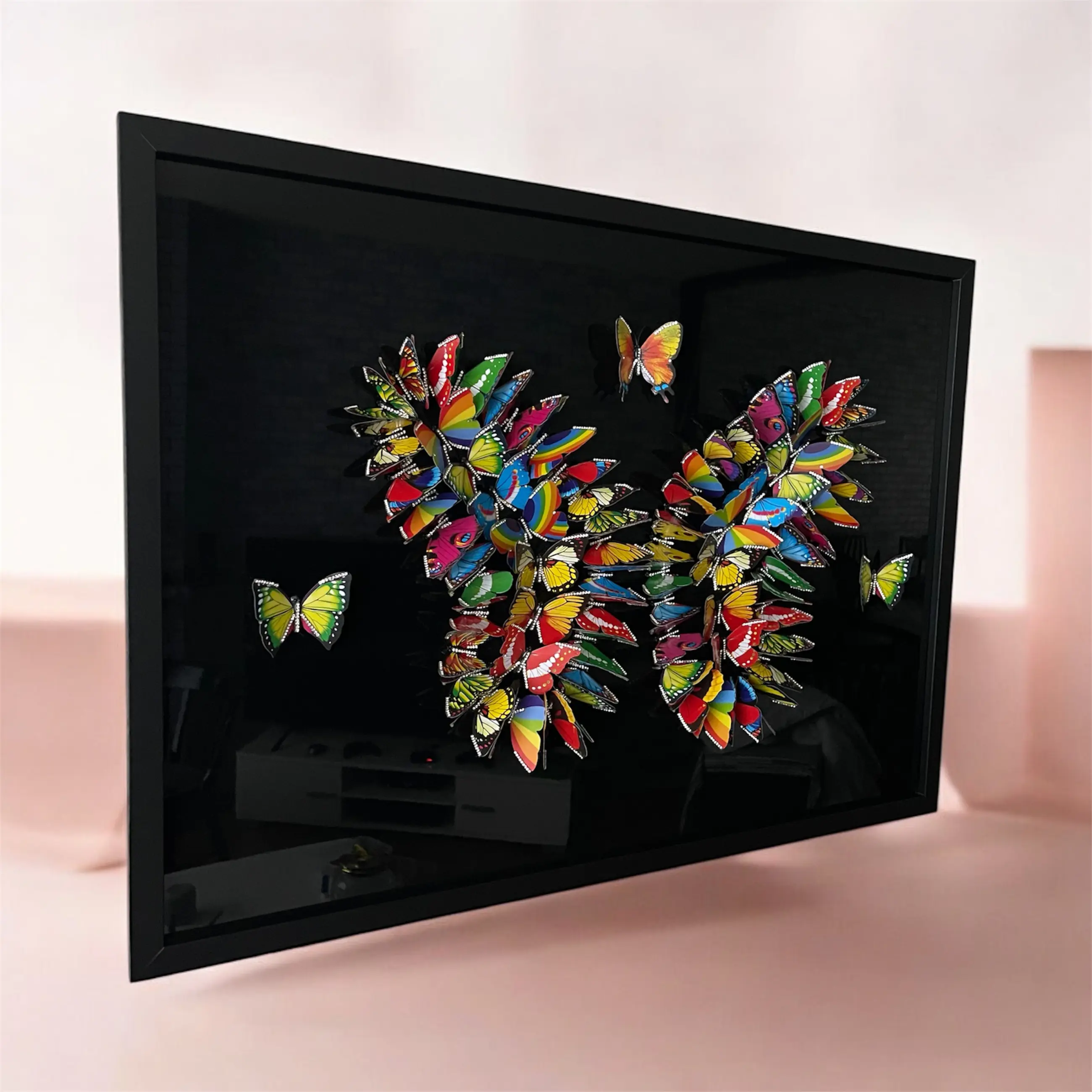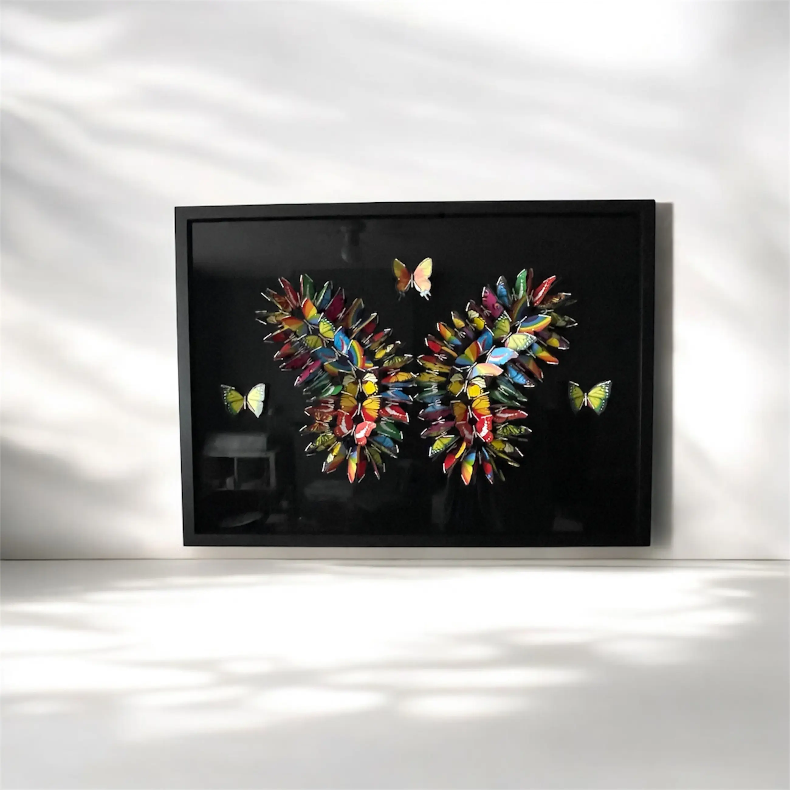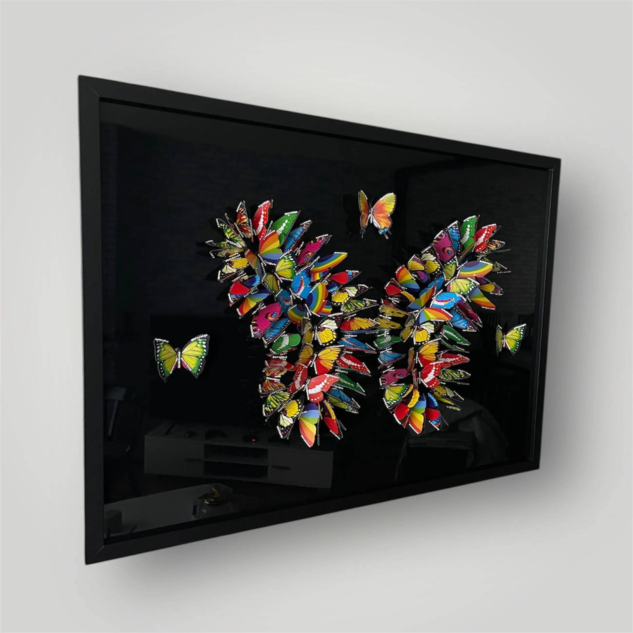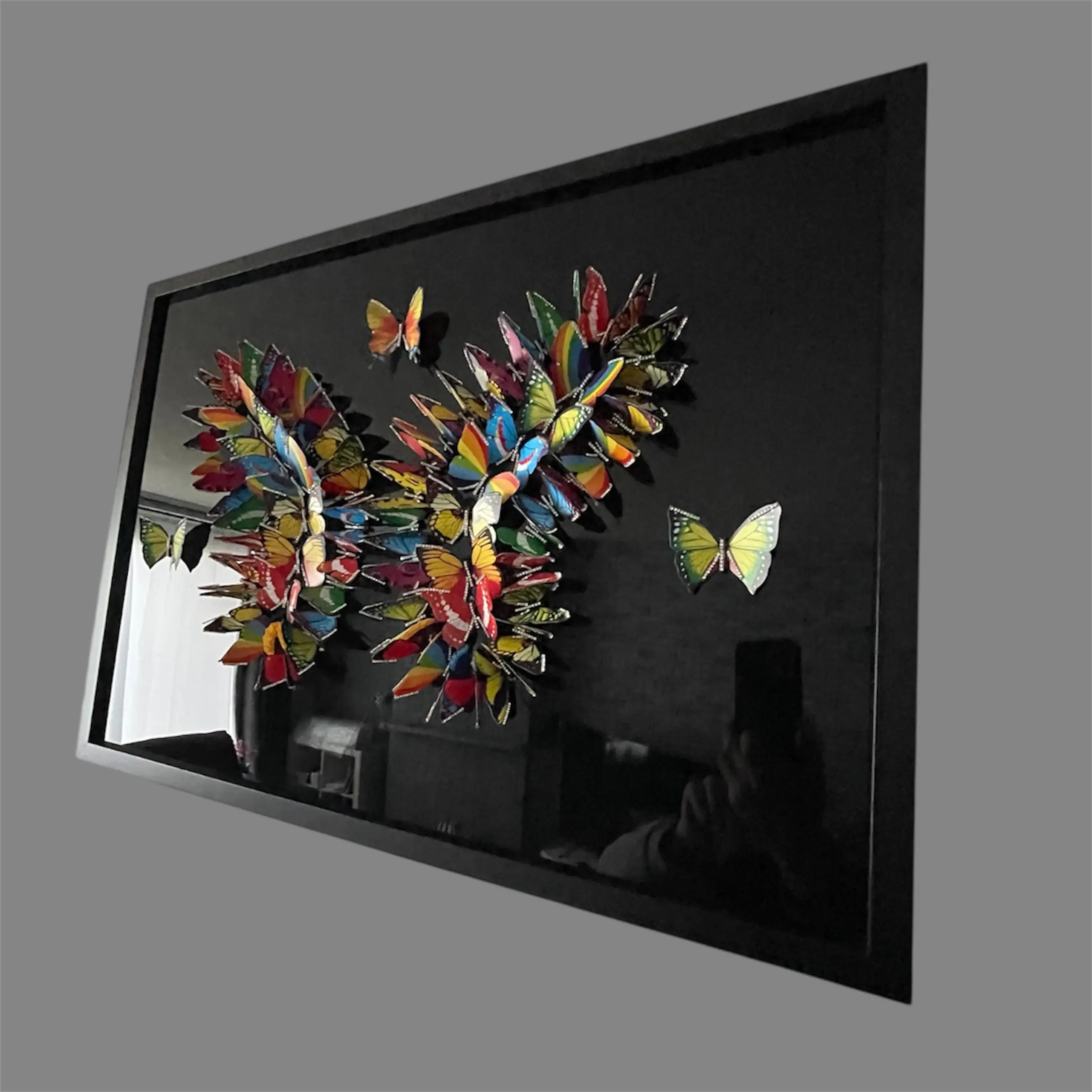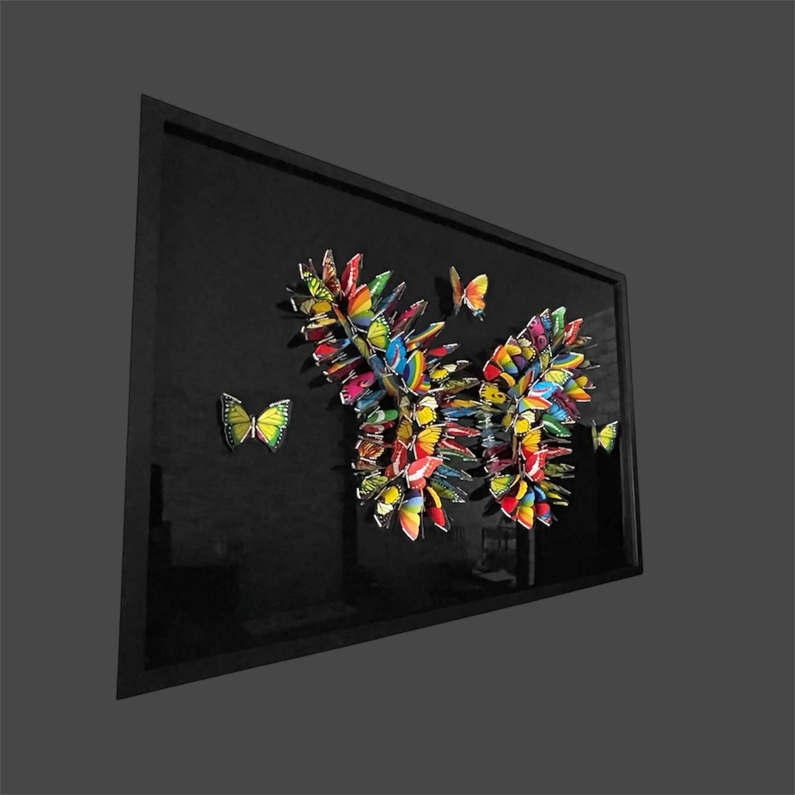 Dit indrukwekkende kunstwerk is vervaardigd op hoogwaardig glanzend zwart plexiglas, wat zorgt voor een diepe, spiegelende achtergrond en een krachtige visuele impact. Centraal staat één grote vlinder, opgebouwd uit tientallen kleine, kleurrijke vlinders. Deze symboliseren vrijheid, transformatie en elegantie.