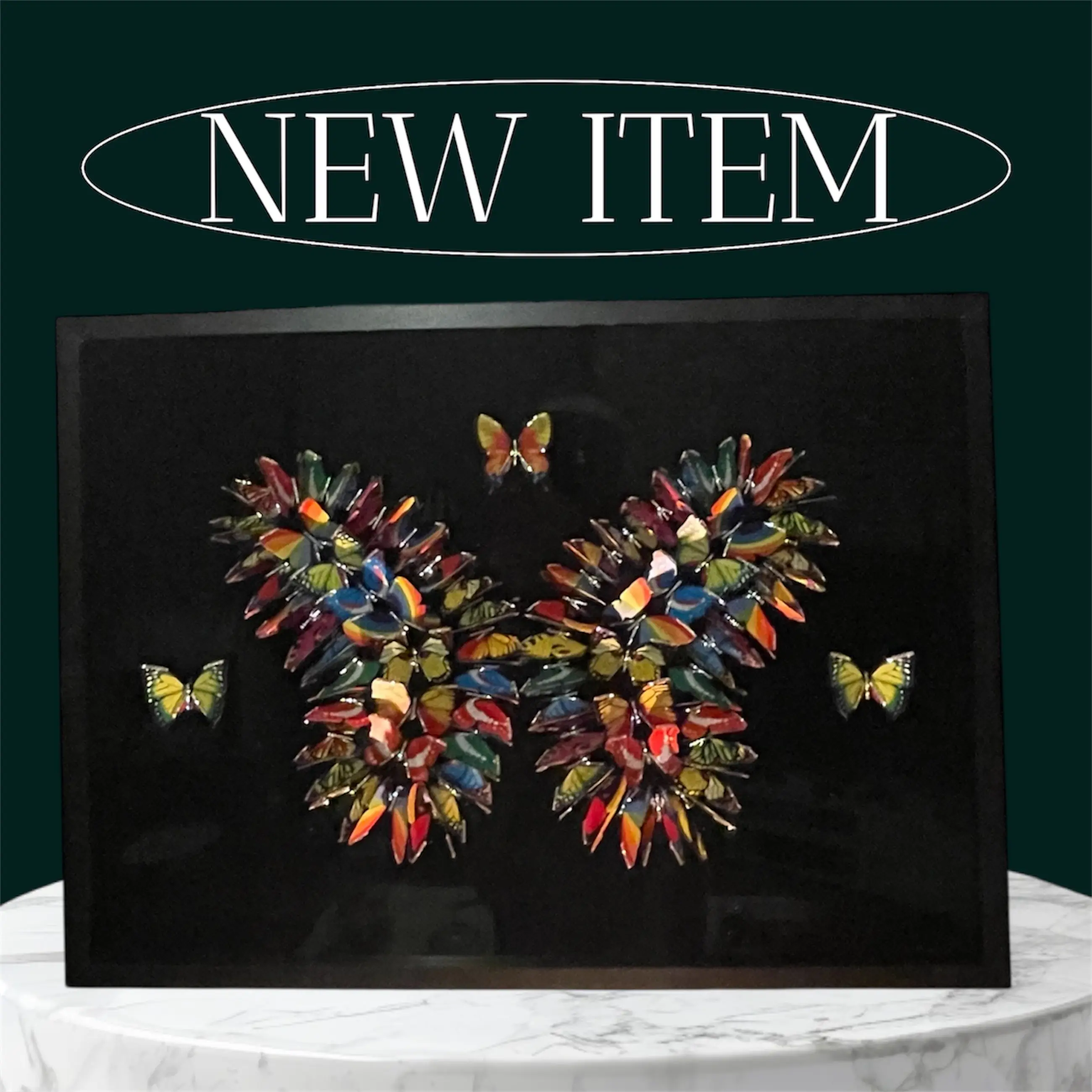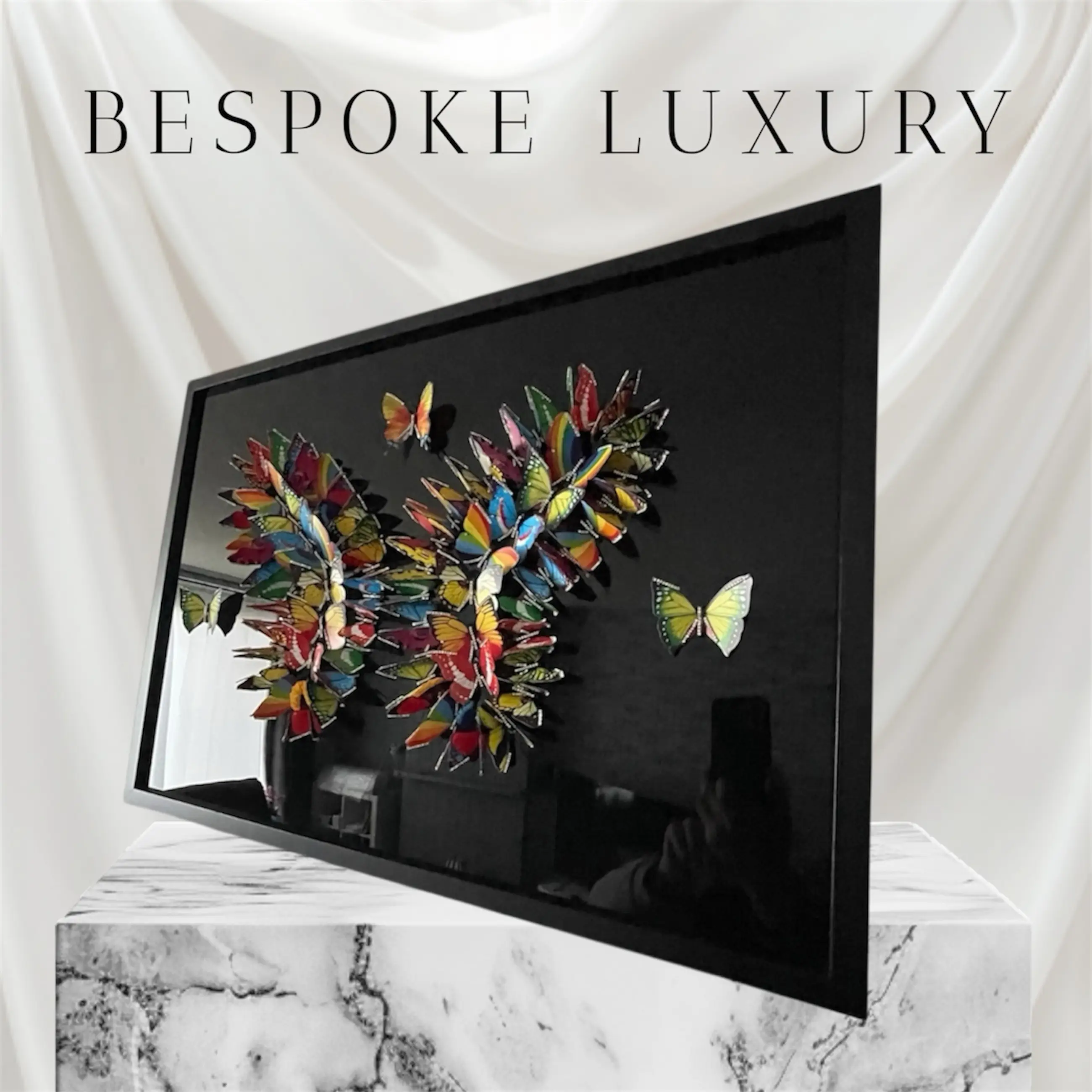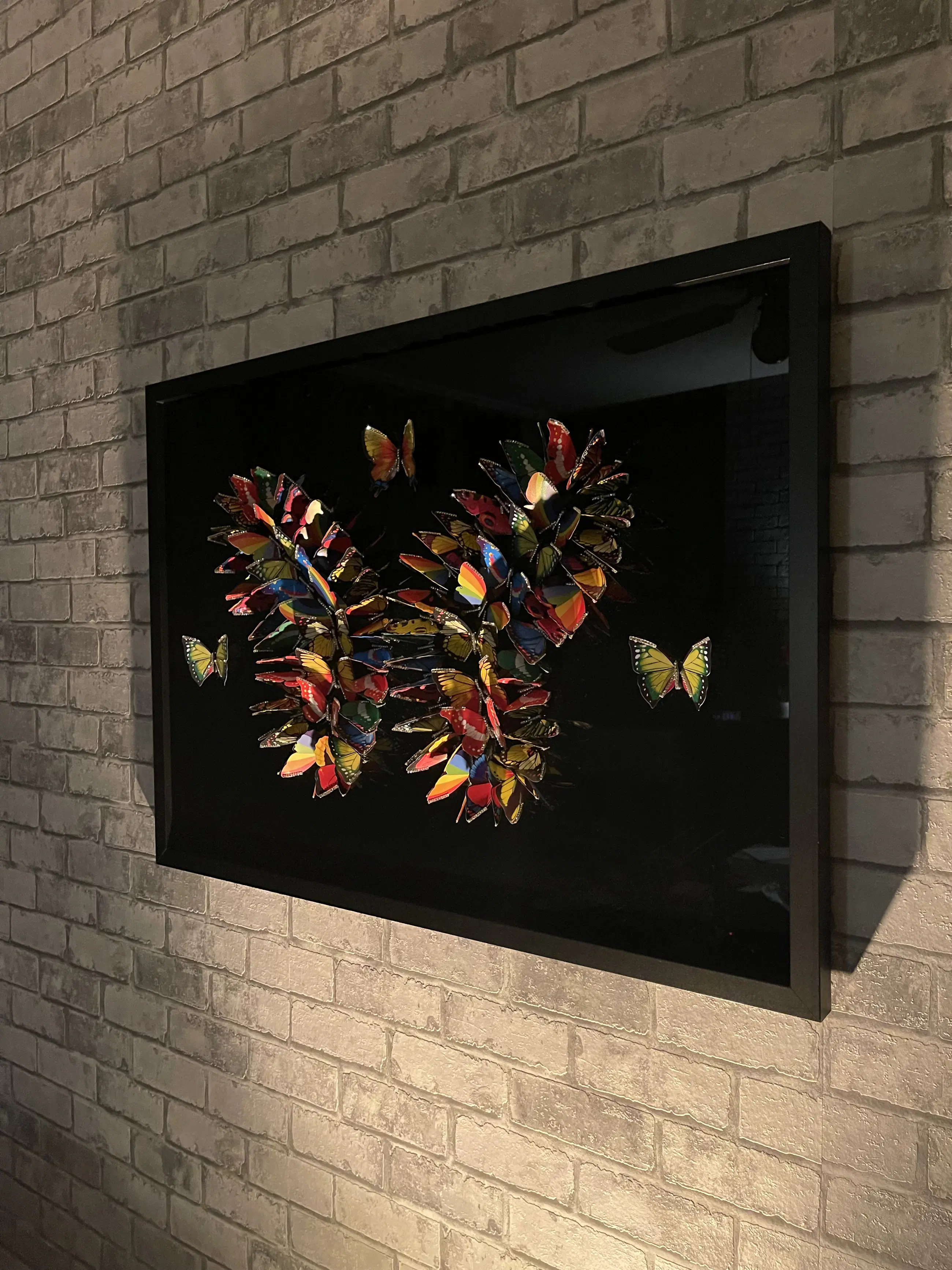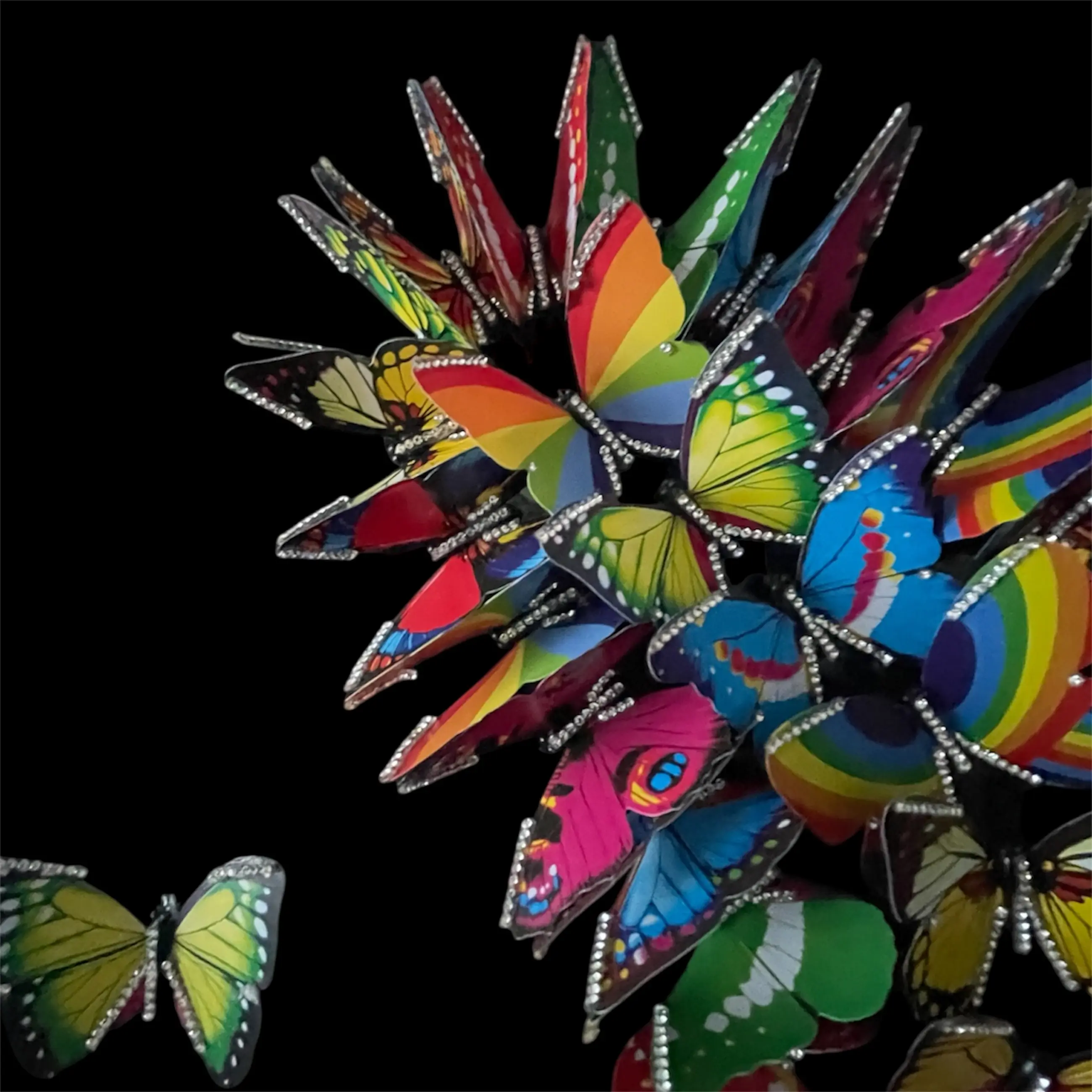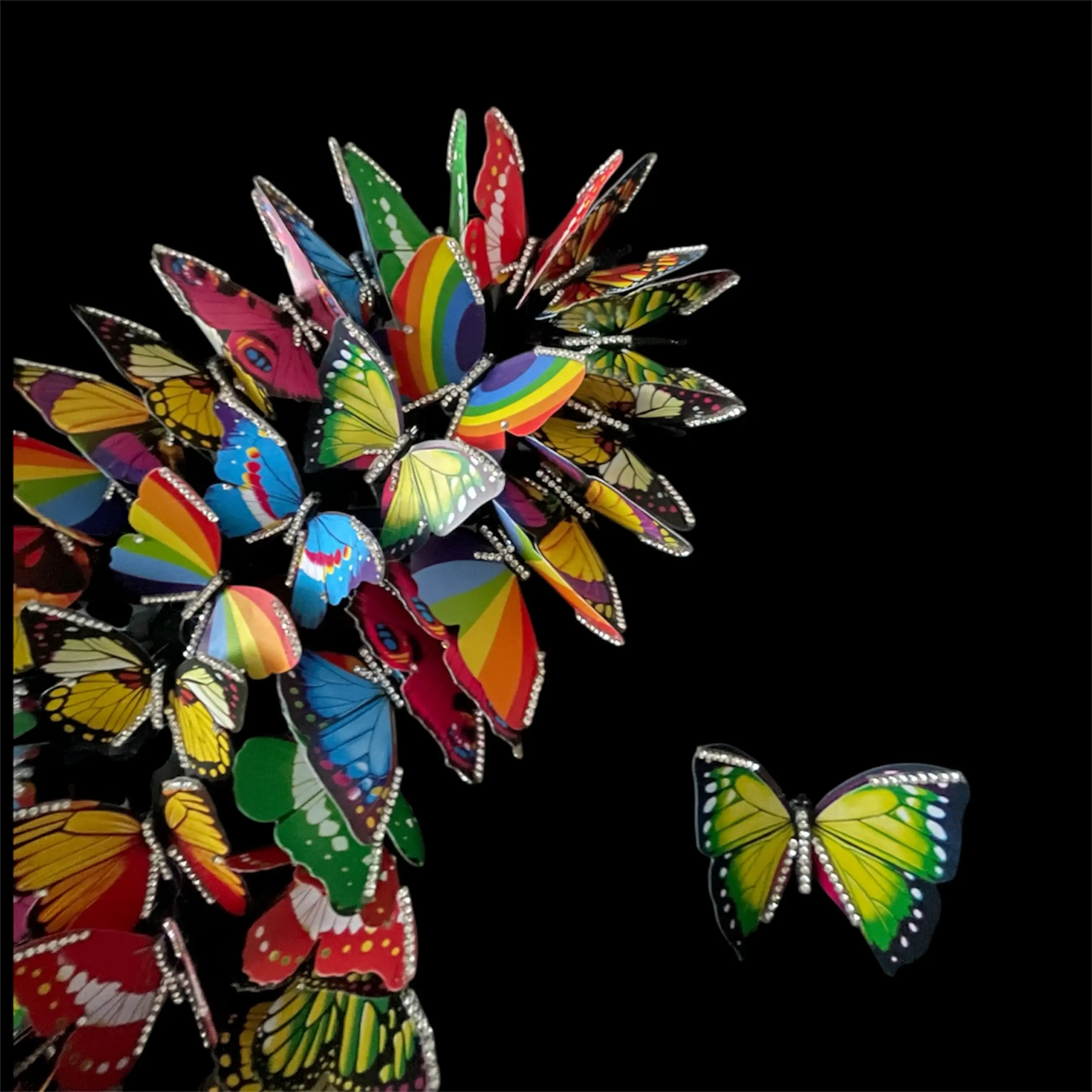 De afzonderlijke vlinders zijn rijk gedetailleerd en verfraaid met subtiel verwerkte diamantjes, die het licht op luxueuze wijze reflecteren en het kunstwerk een exclusieve, bijna juweelachtige uitstraling geven. De compositie creëert diepte en beweging, waardoor het werk vanuit iedere kijkhoek blijft fascineren.