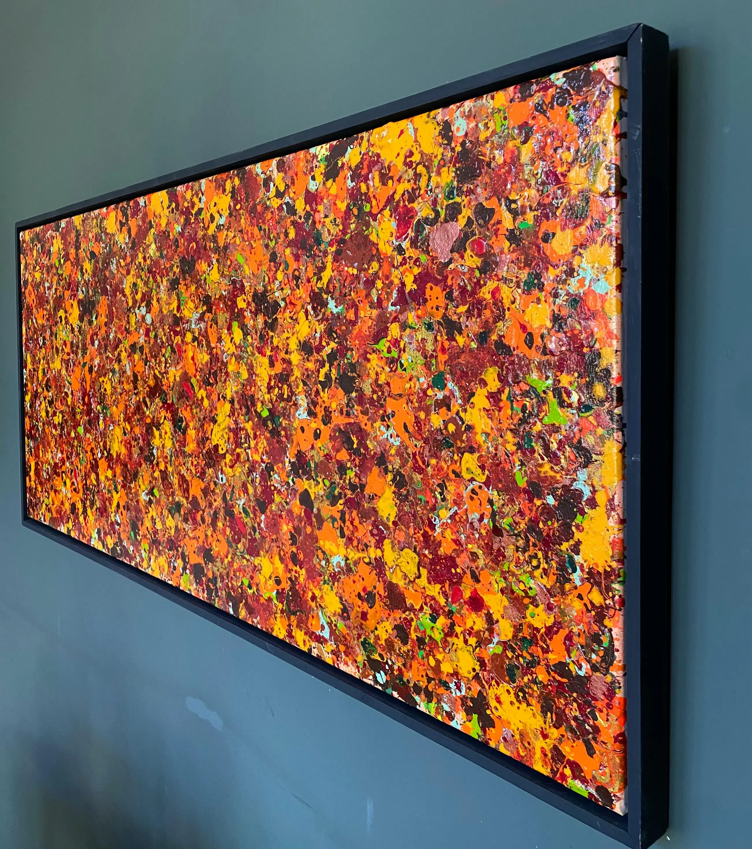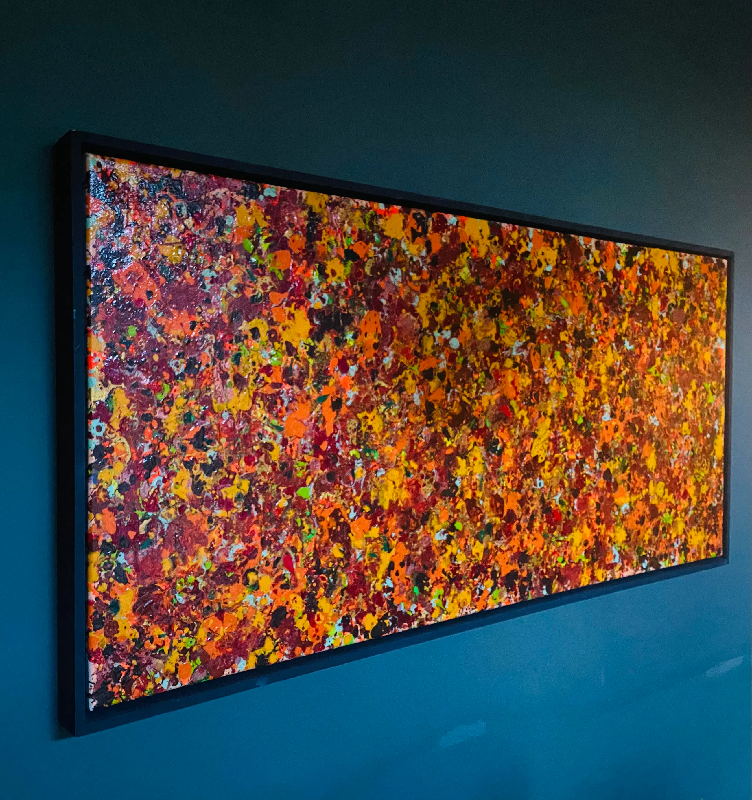 Mooi groot kleurrijk schilderij acryl op canvas, ingelijst in een zwarte houten baklijst. Gesigneerd met Buys 2020 aan de achterzijde.