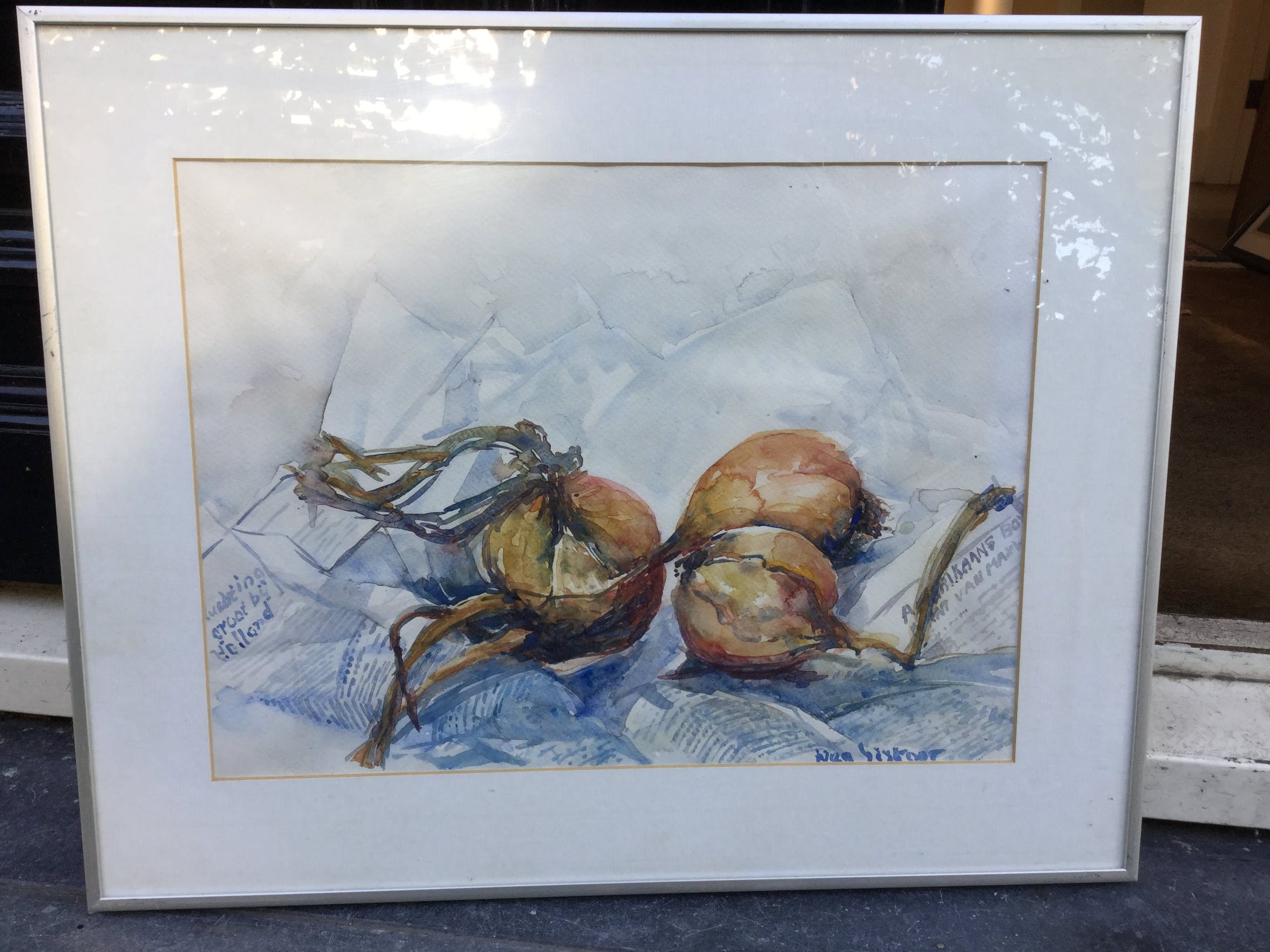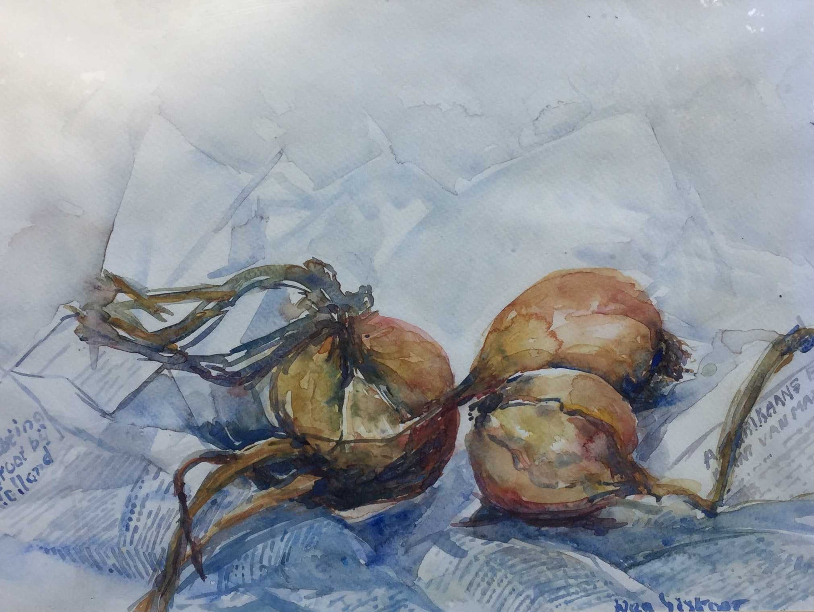 Kunstenaar: onbekend Medium: Aquarel Voorstelling: Stilleven met uien Gesigneerd: onduidelijk