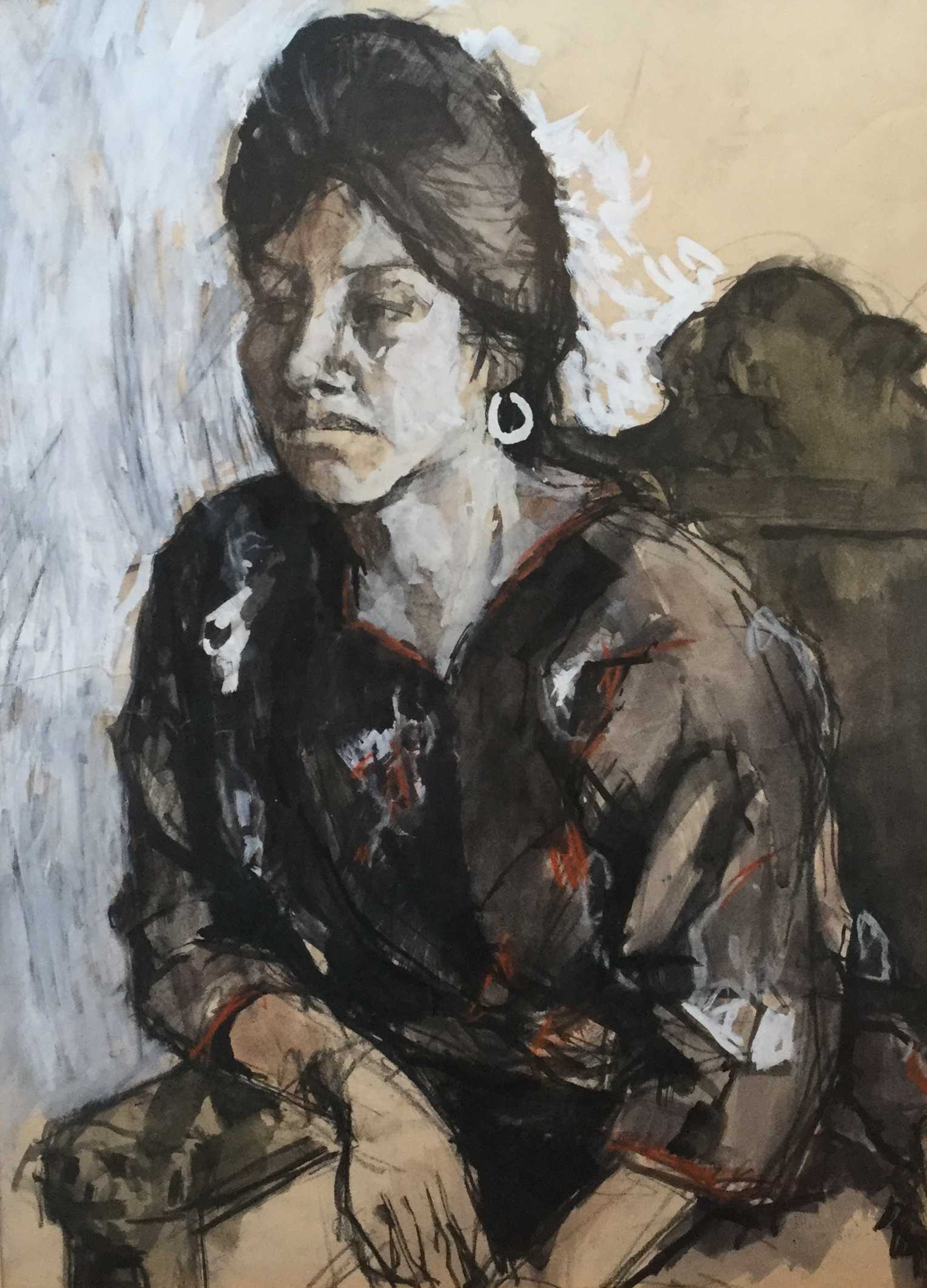 C3103-2 Prachtig portret van een rdame, gemengde techniek op papier (oa inkt, pastel, gouache), onduidelijk gesigneerd. Dit werk kan uitsluitend worden opgehaald op onze locatie in Nieuwersluis (geen verzending)