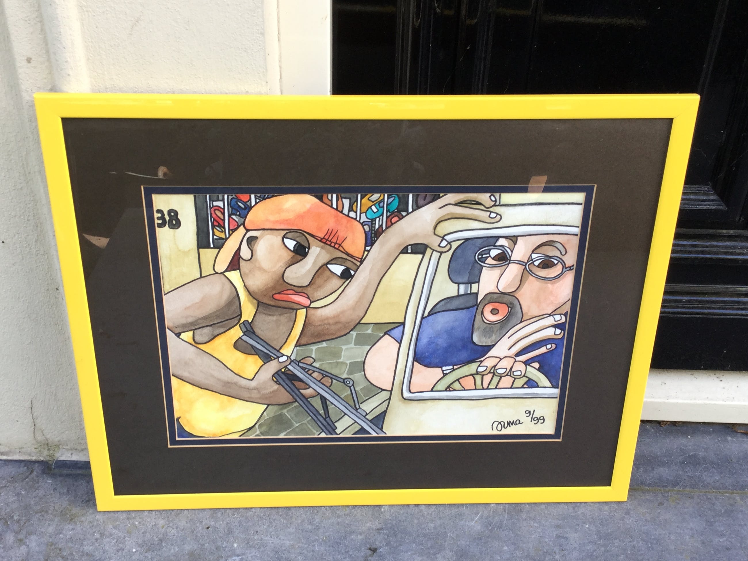 C3340-10,  kunstenaar onbekend, Bij de auto, gemengde technieken op papier, gesigneerd rechtsonder, beeldmaat 32 x 47 cm, lijstmaat 54 x 68,5 cm