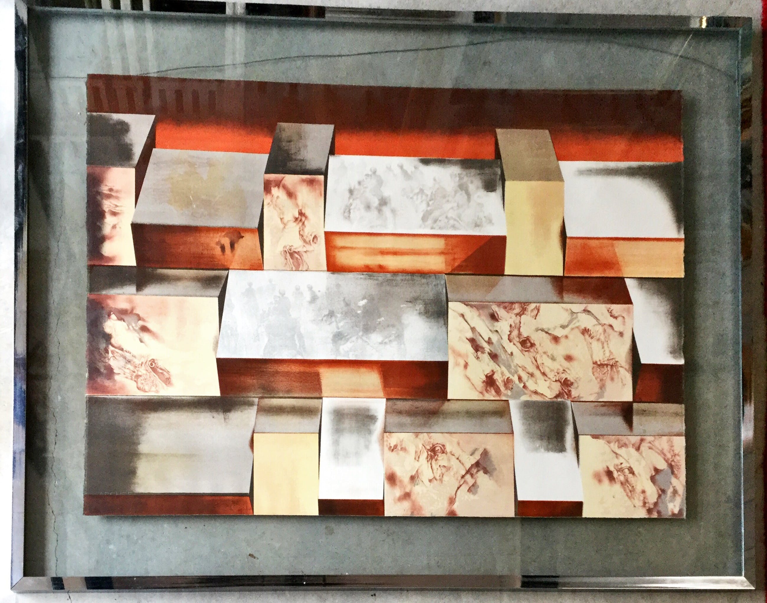 licht verkleurd door de tijd, lijst en glas oppervlakte vervuiling en slijtschade door de tijd | |