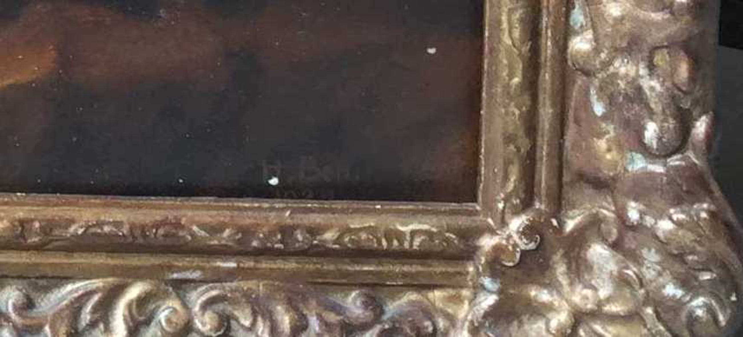 Vergeelde vernis, krassen in vernislaag, oppervlaktevuil. Lijst bevat oppervlaktevuil en slijtschade door de tijd.