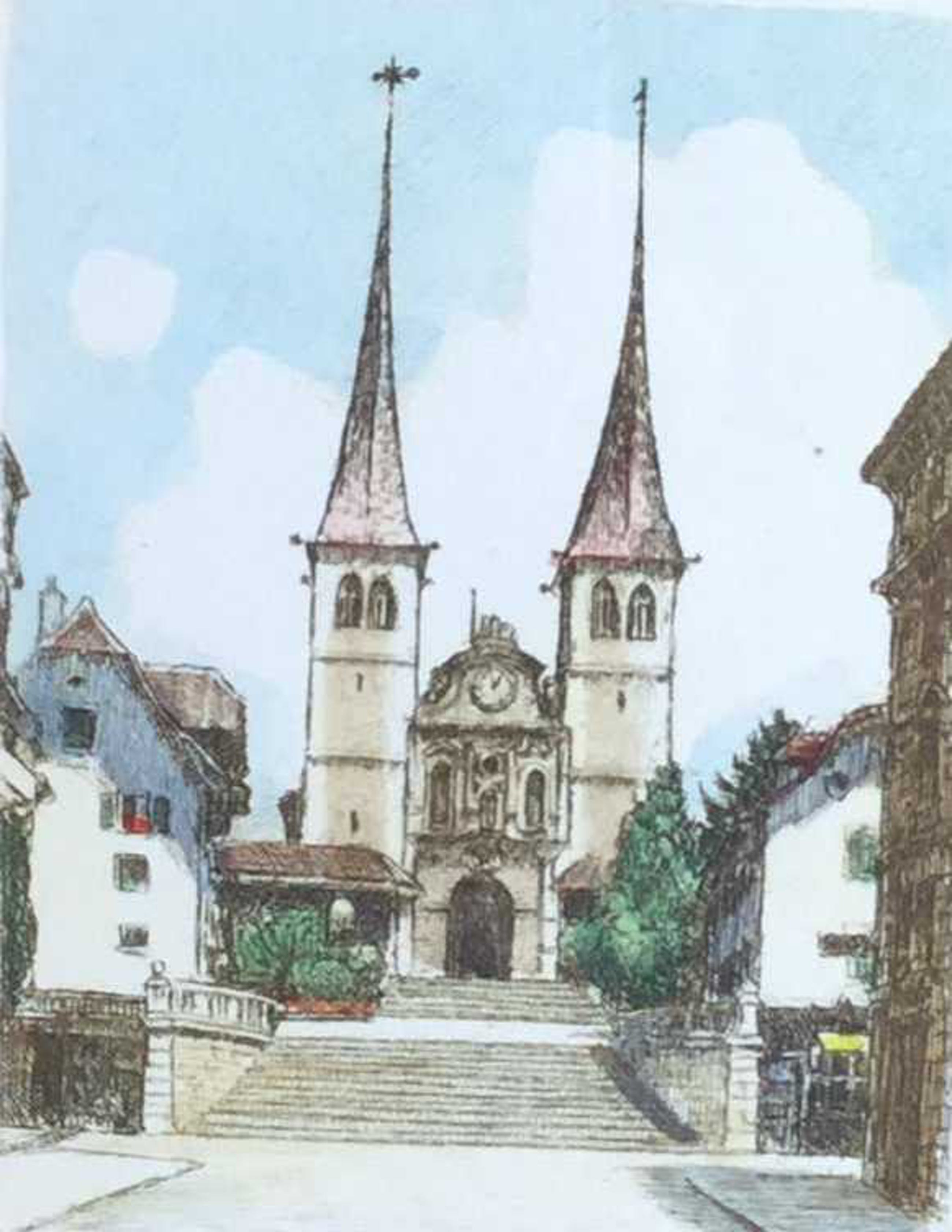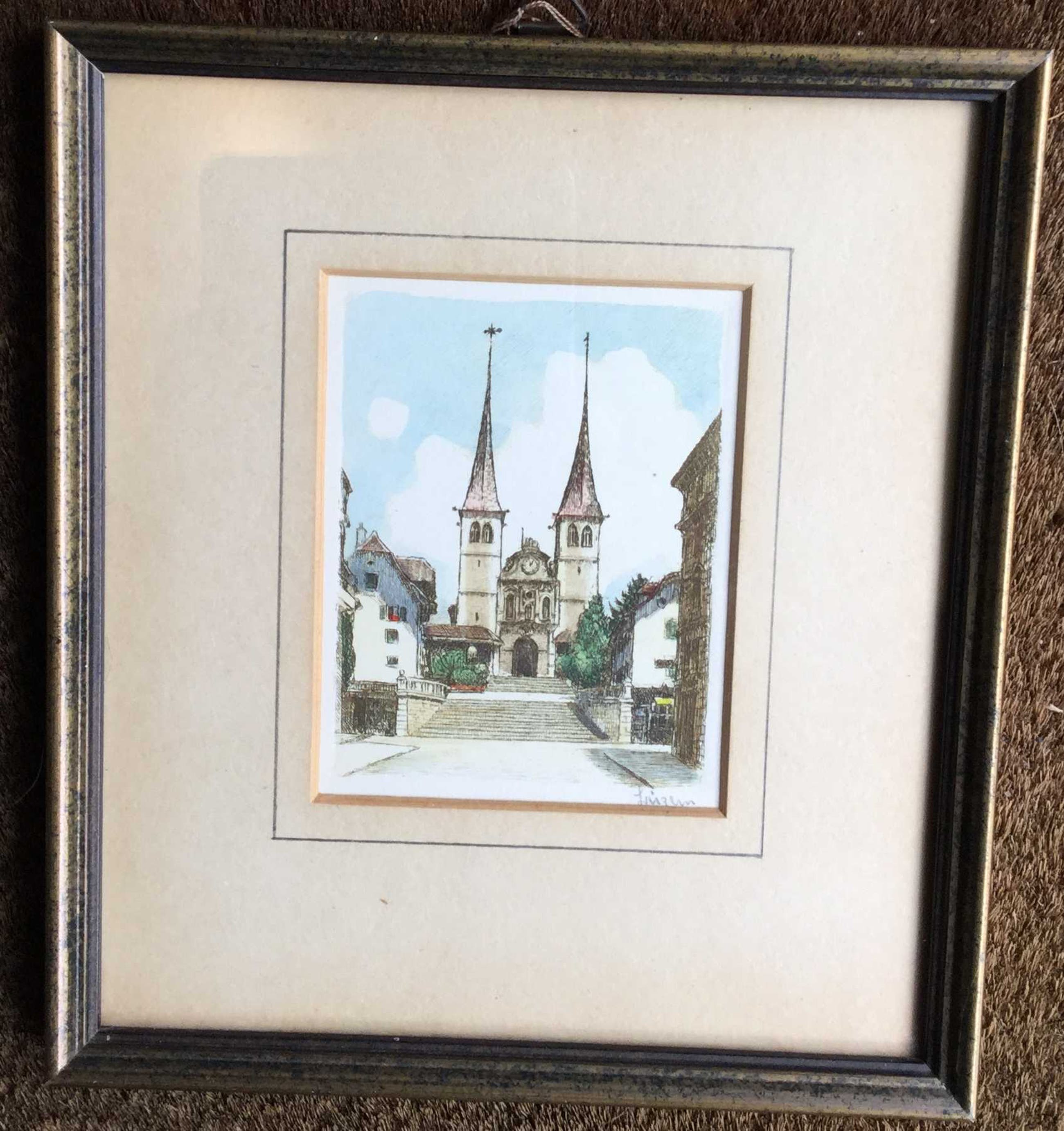 C4016-2 , Kunstenaar onbekend, Klooster, gemengde techniek op papier, r.o. onduidelijk gesigneerd, beeldmaat 9 x 7 cm, lijstmaat 18.5 x 16.5 cm.