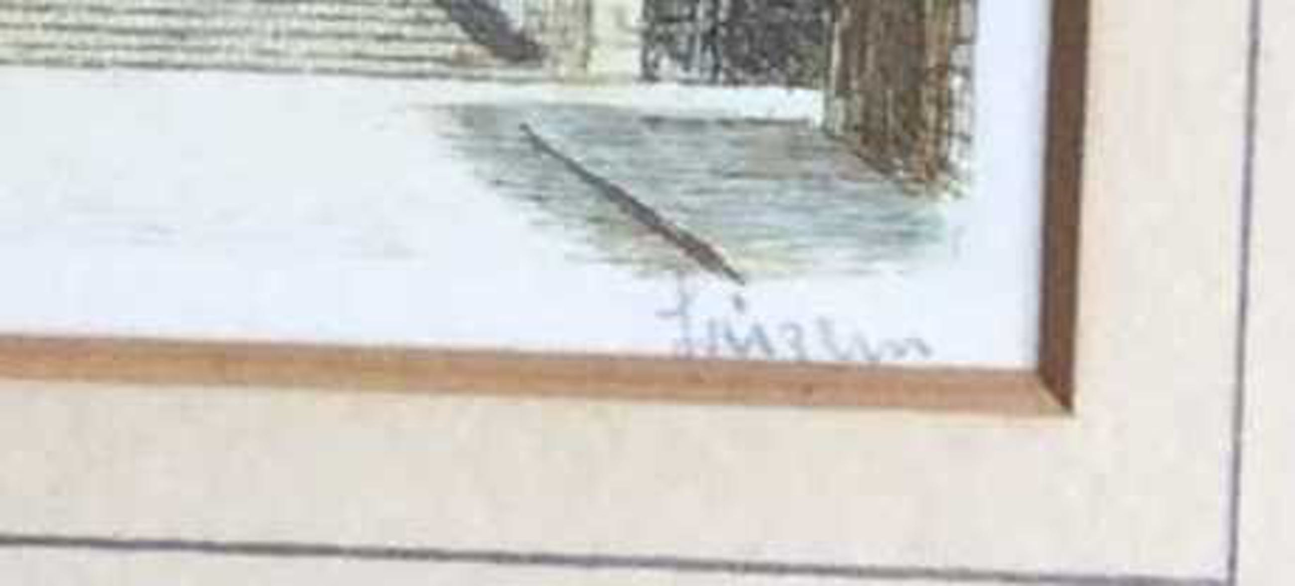 Papier vergeeld, een aantal vlekjes. Lijst bevat oppervlaktevuil en slijtschade door de tijd.