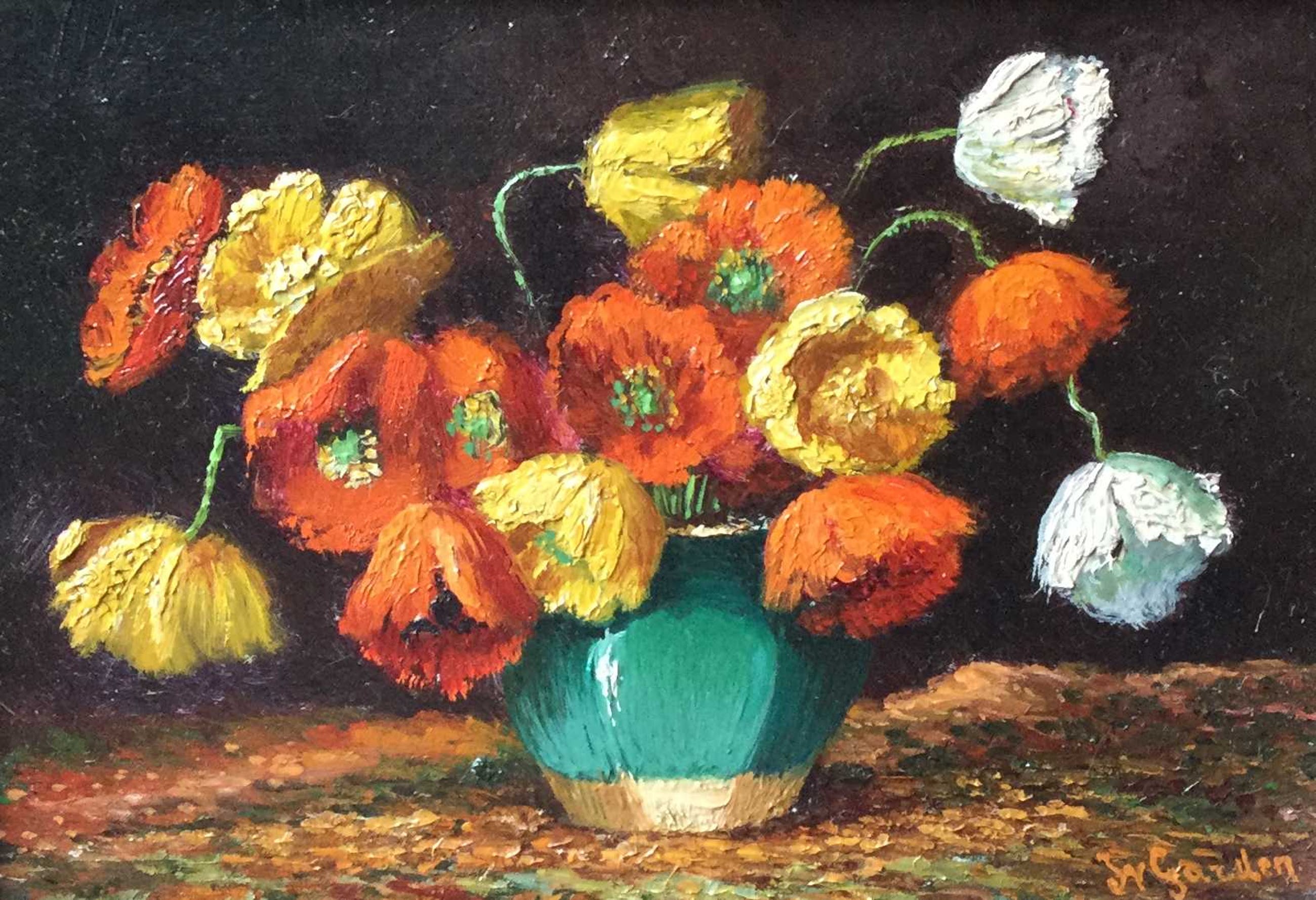 C4125-14, Onbekende kunstenaar, Bloemen  in gemberpot (popjes), olie op paneel, r.o. gesigneerd, paneelmaat 13 x 18 cm, zonder lijst.