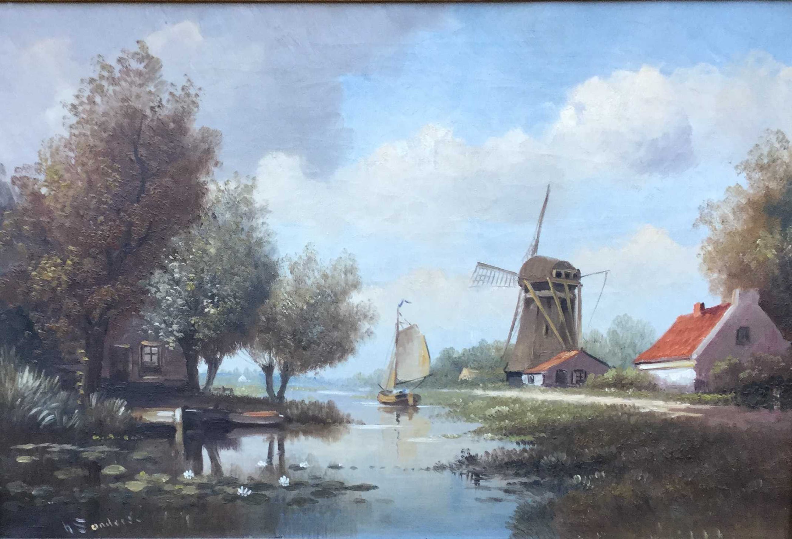 C4141-1, Kunstenaar onbekend, Landschap met molen aan de vaart, olie op doek, linksonder onduidelijk gesigneerd, doekmaat: 40,5 x 60,5 cm, lijstmaat 53 x 73 cm.