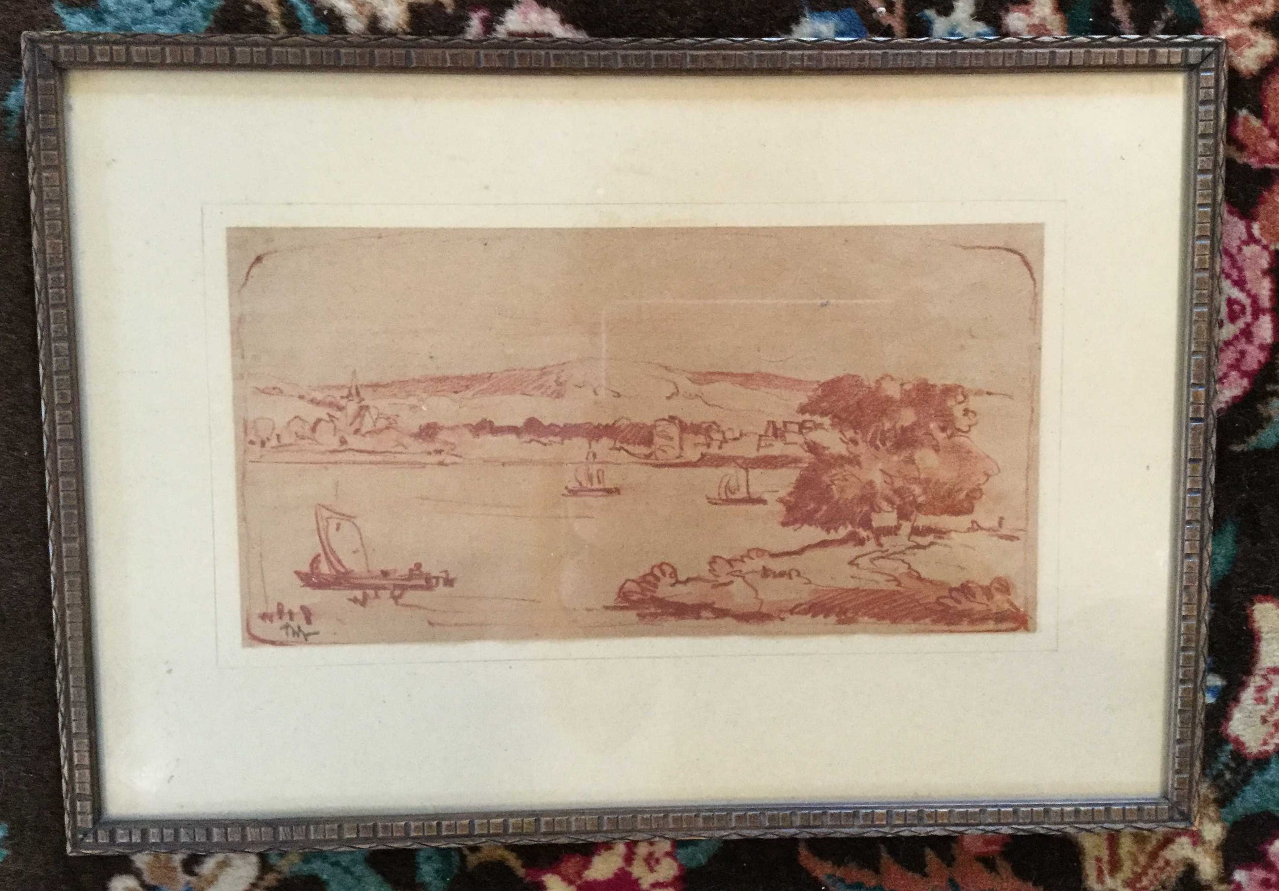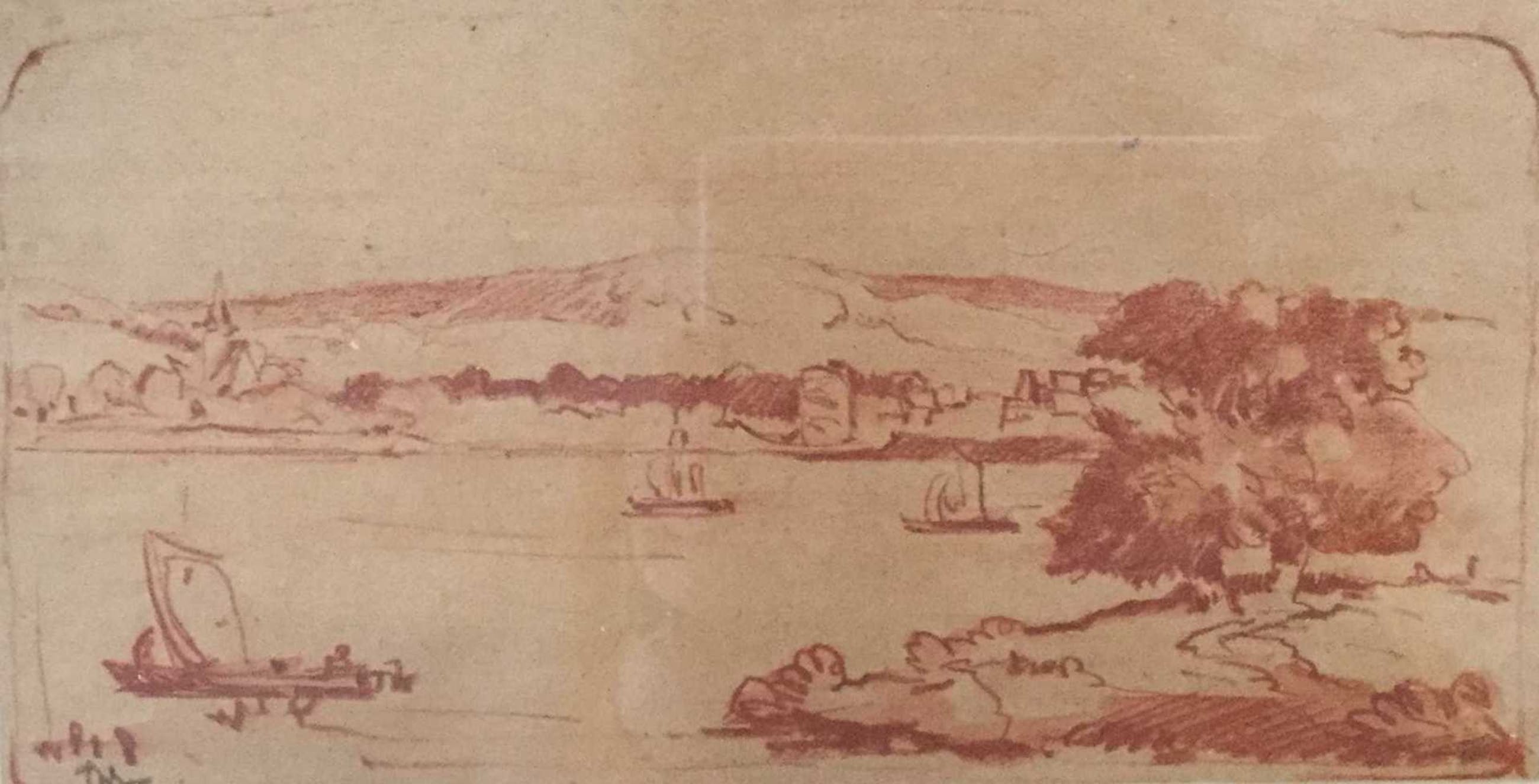 Onbekende kunstenaar, rode krijttekening, boten op het water, l.o. gemonogrammeerd, doekmaat 13x25, lijstmaat 25 x 36 cm.