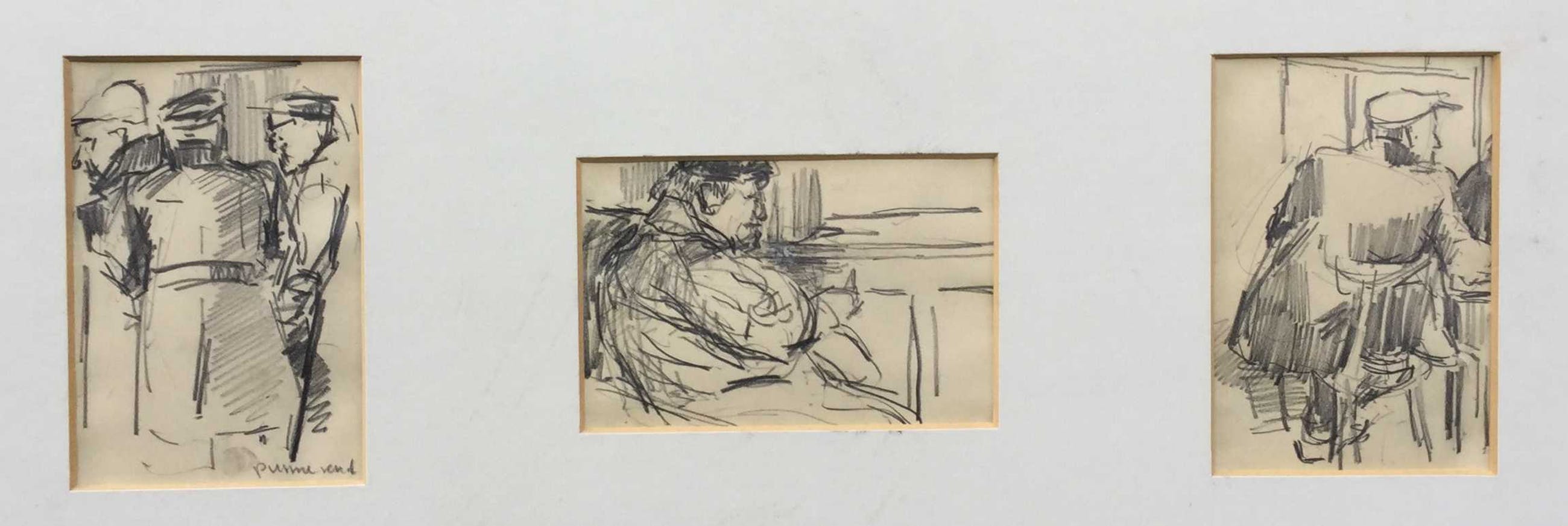 | Papier vergeeld door de tijd en bobbelt, oppervlaktevuil, deukje in rechter tekening. Het werk is zonder lijst, enkel in passe-partout. | |