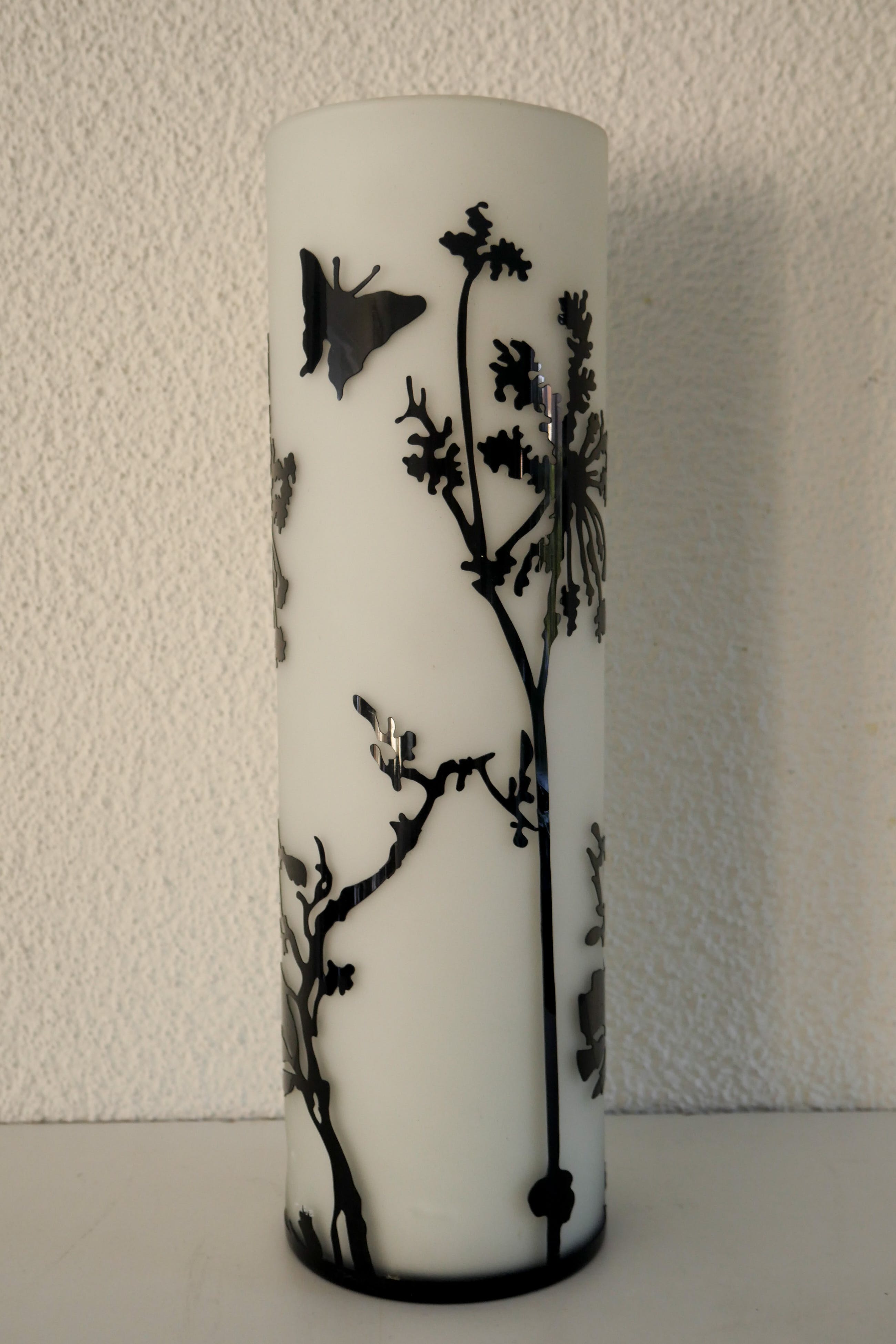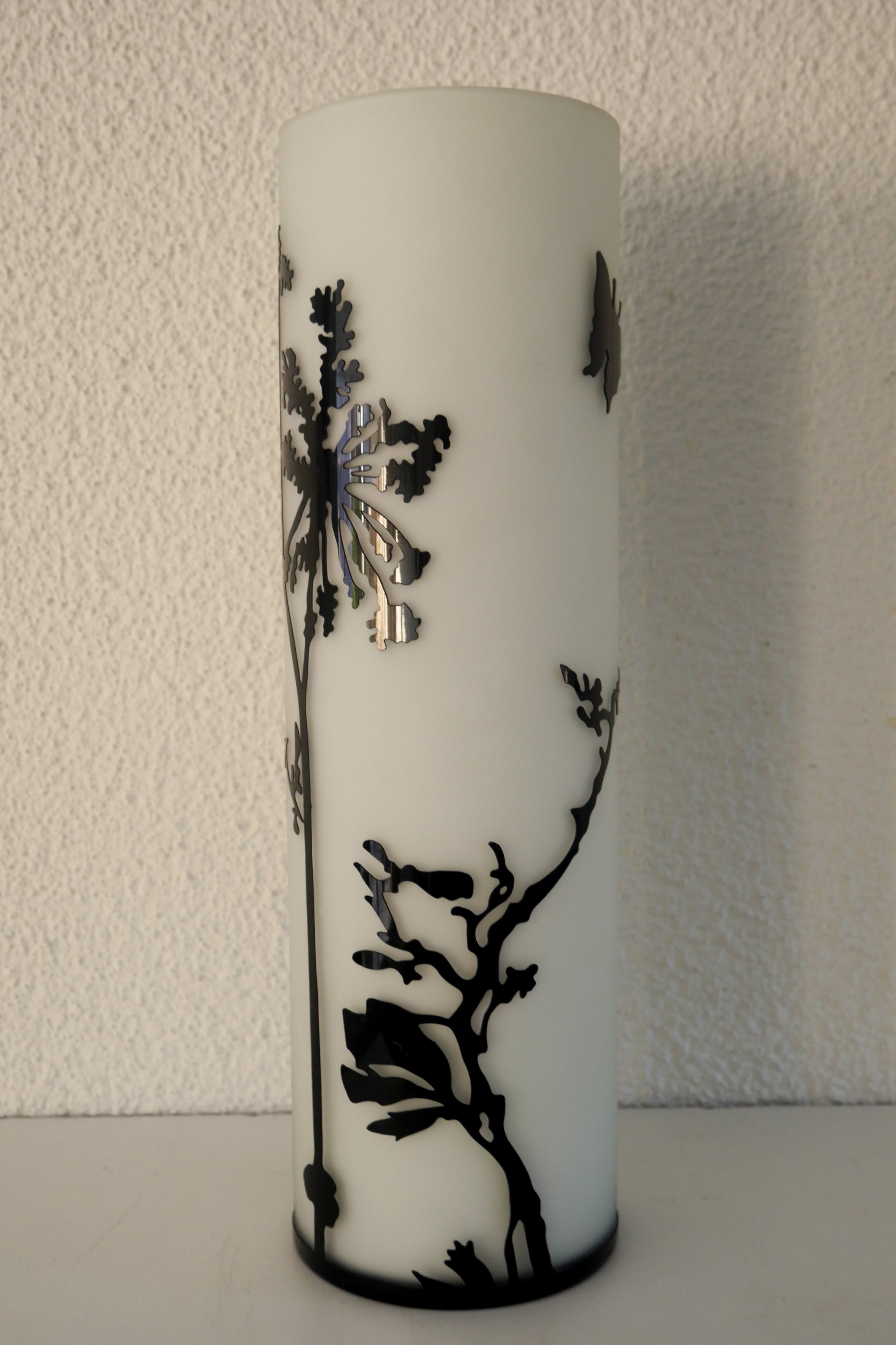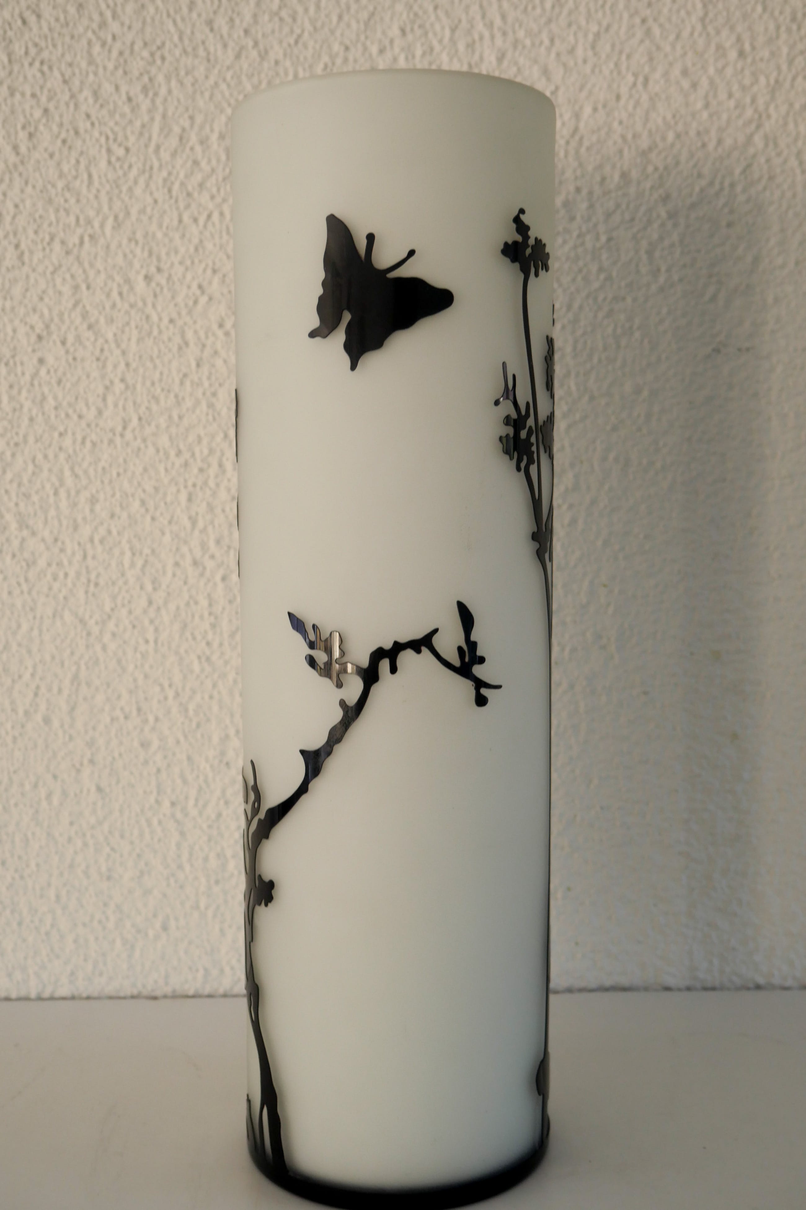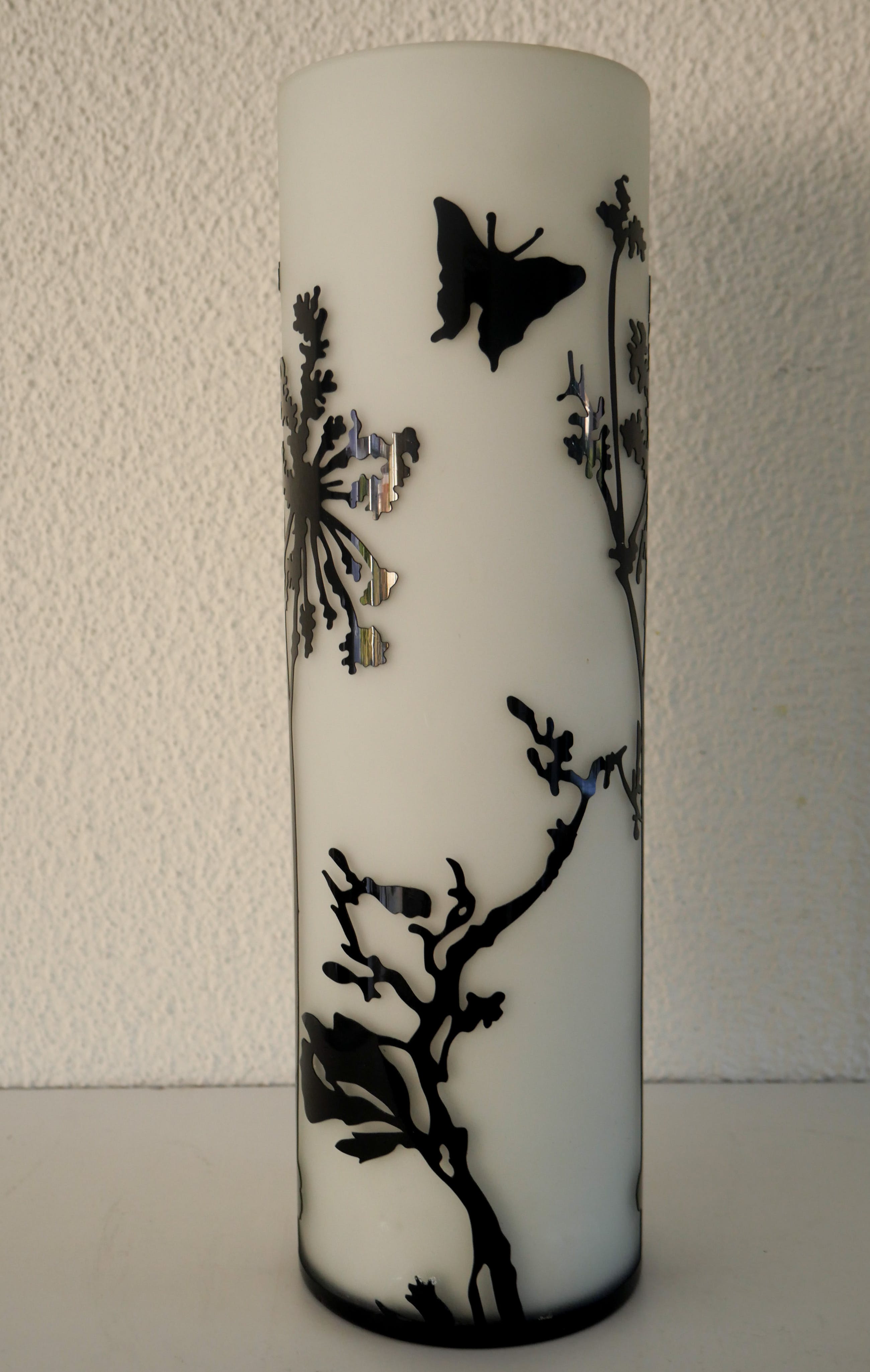Cameo vaas.Heeft drie lagen glas, witte binnenkant transparant en zwart aan de buitenkant.De zwarte laag is gedeeltelijk weg geëtst het zwart wat overblijft geeft de afbeelding. Motief is bloemen met vlinder.