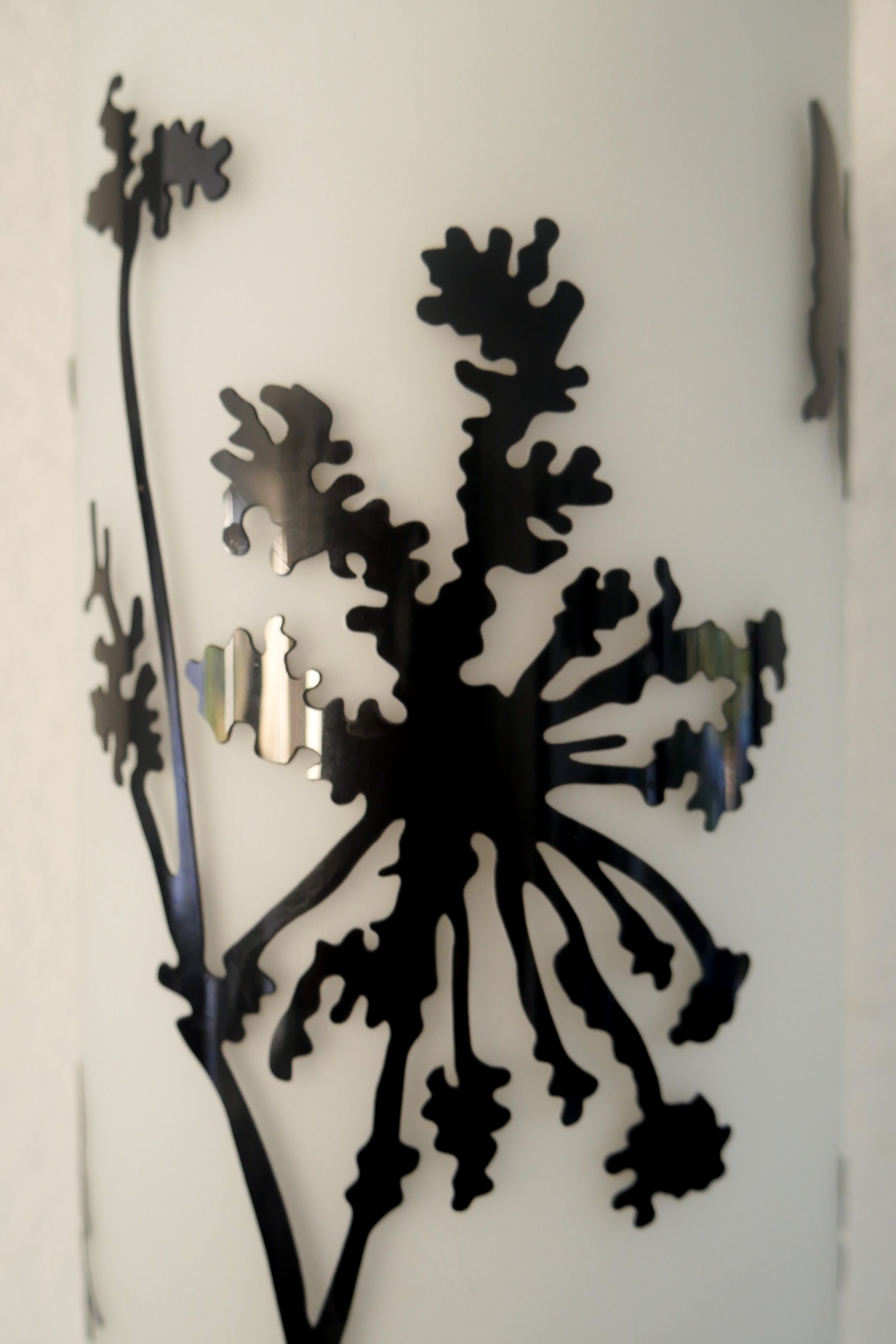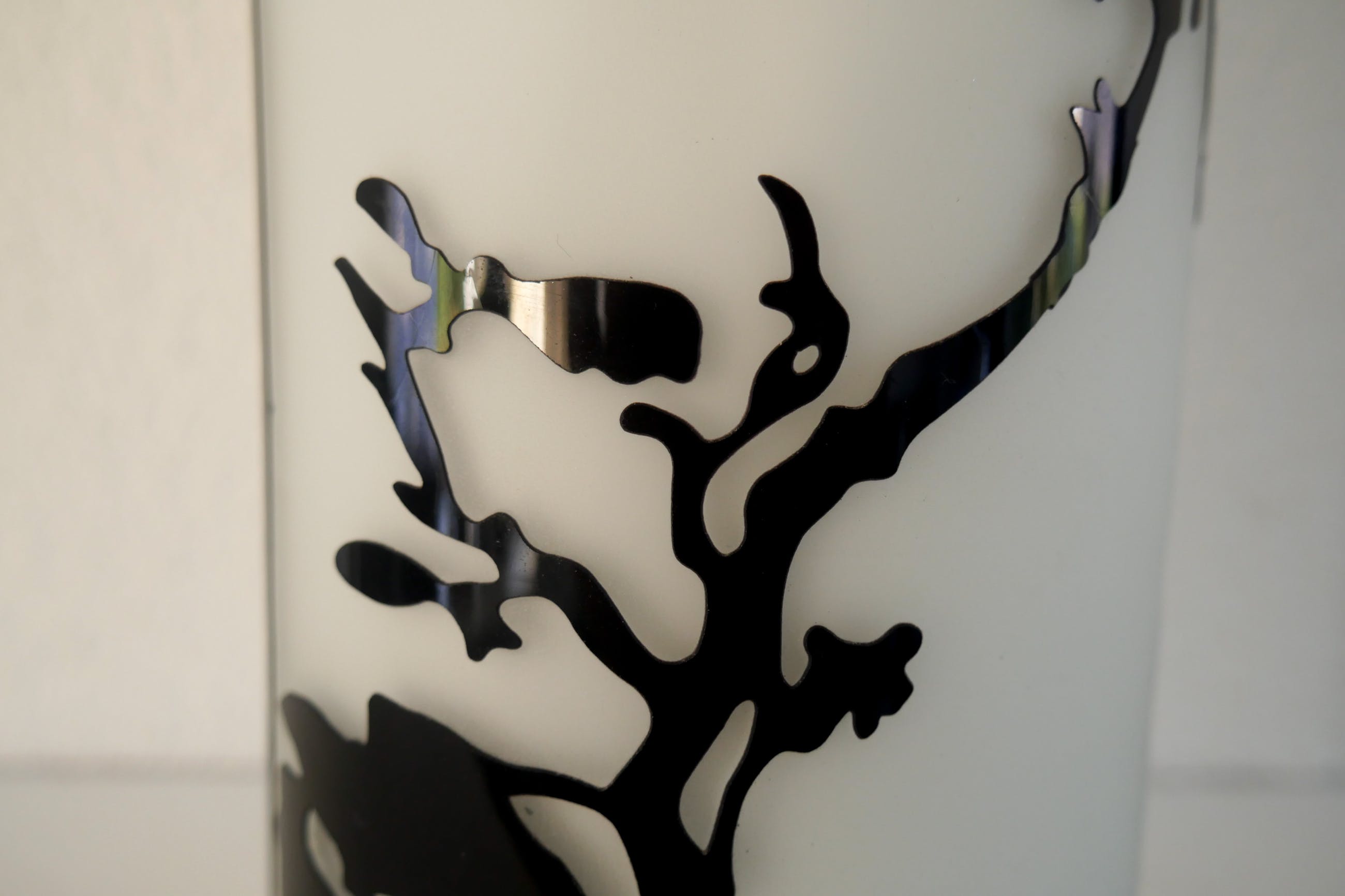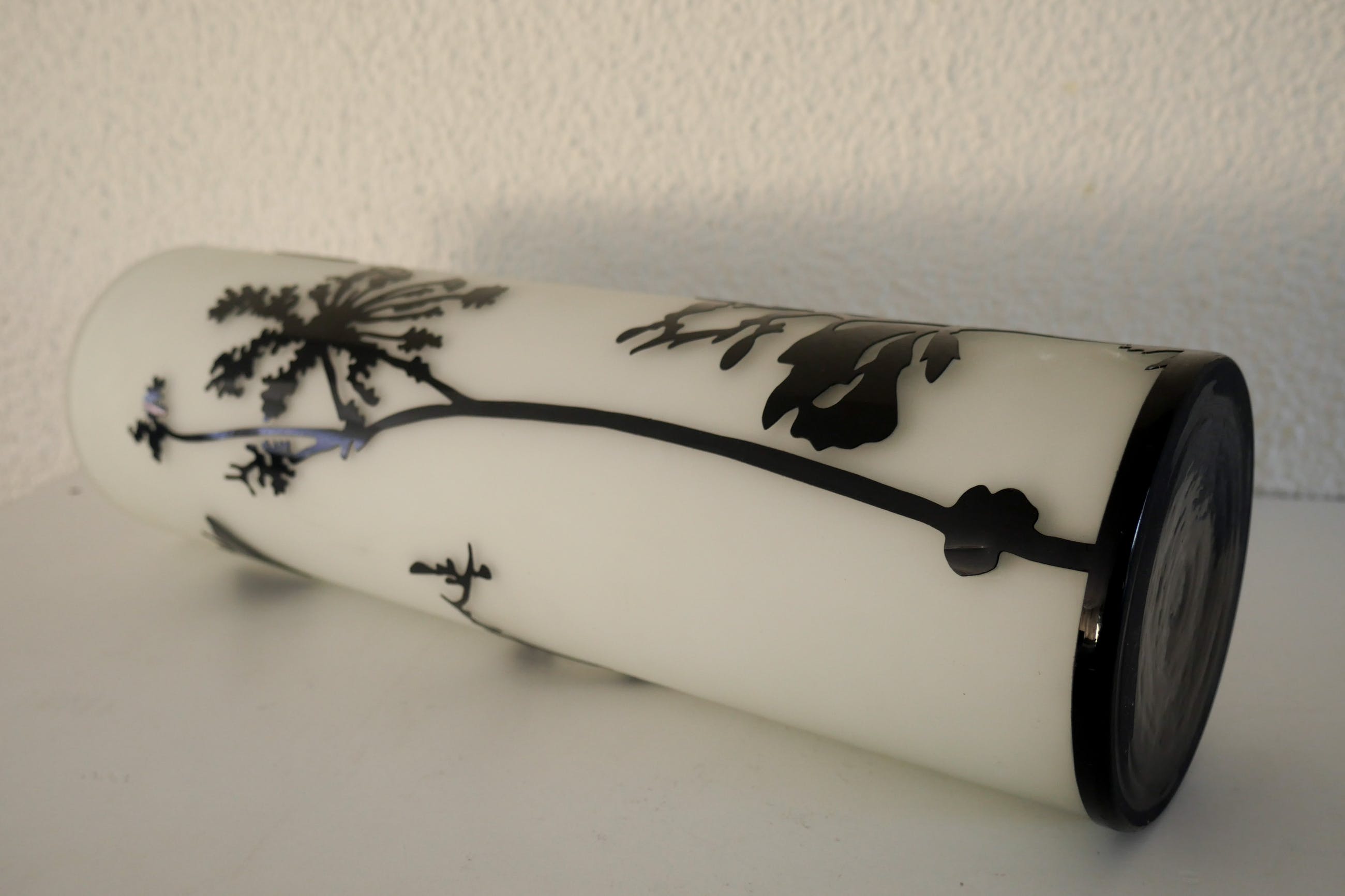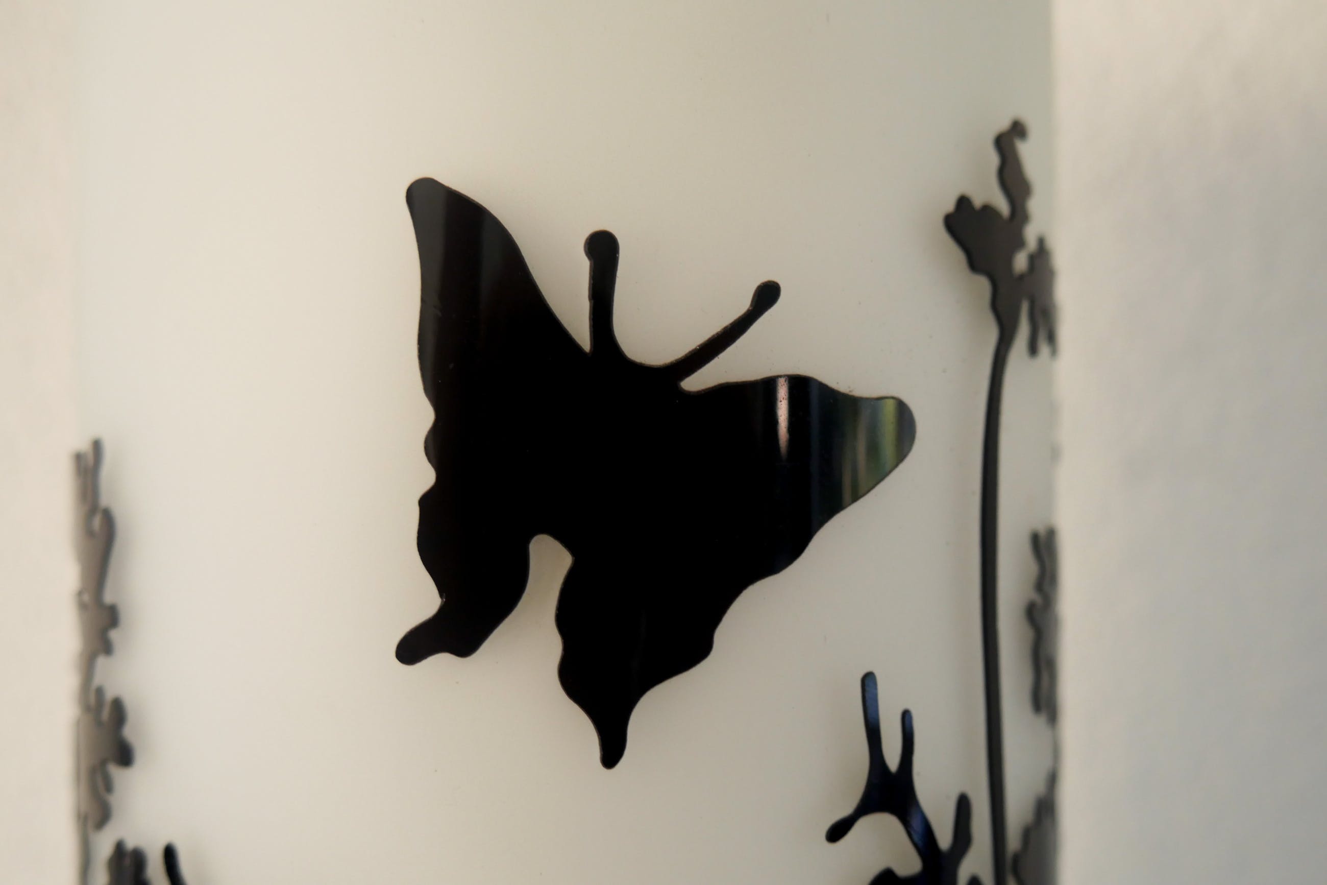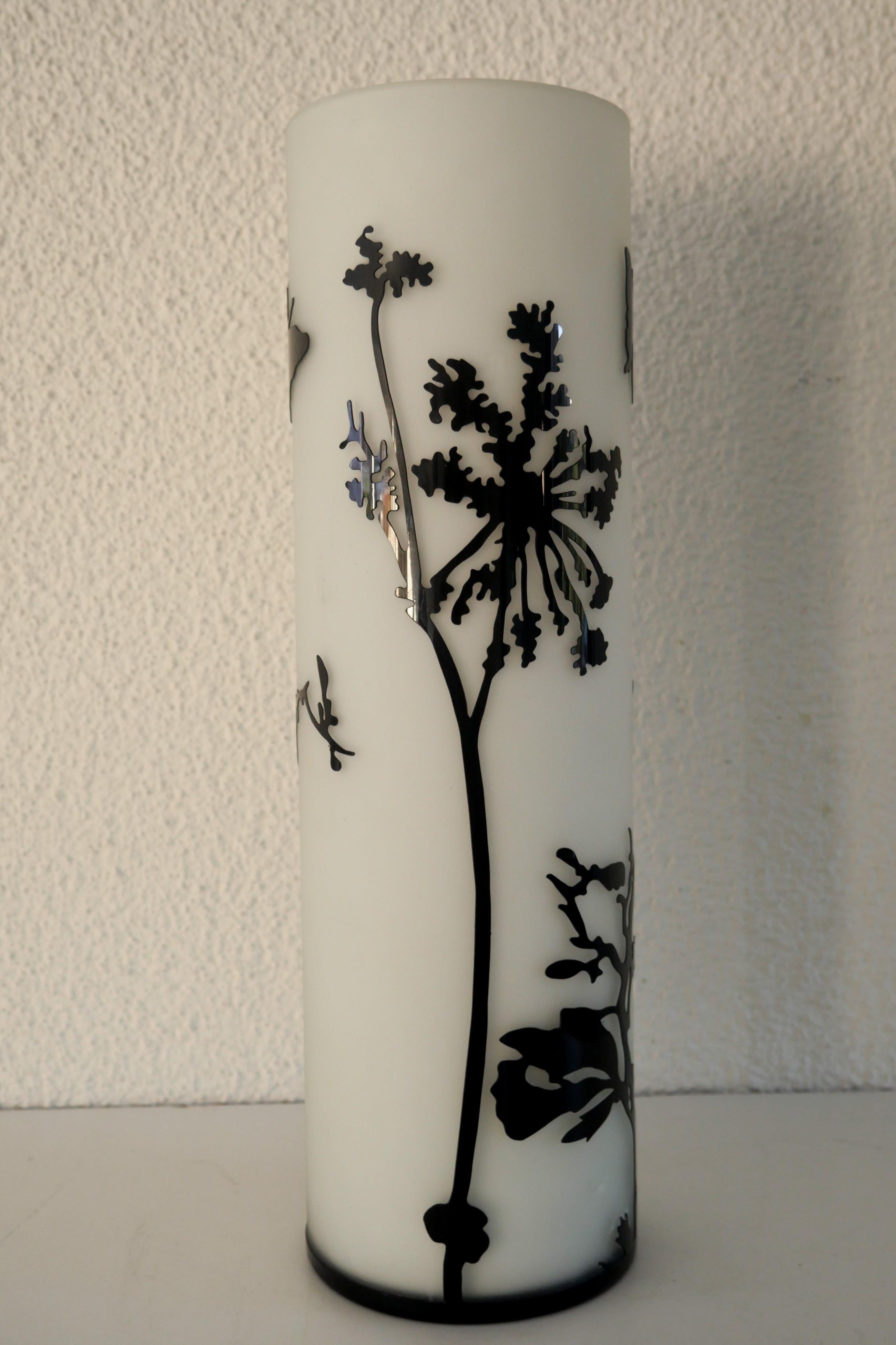 Cameo vaas.Heeft drie lagen glas, witte binnenkant transparant en zwart aan de buitenkant.De zwarte laag is gedeeltelijk weg geëtst het zwart wat overblijft geeft de afbeelding. Motief is bloemen met vlinder.